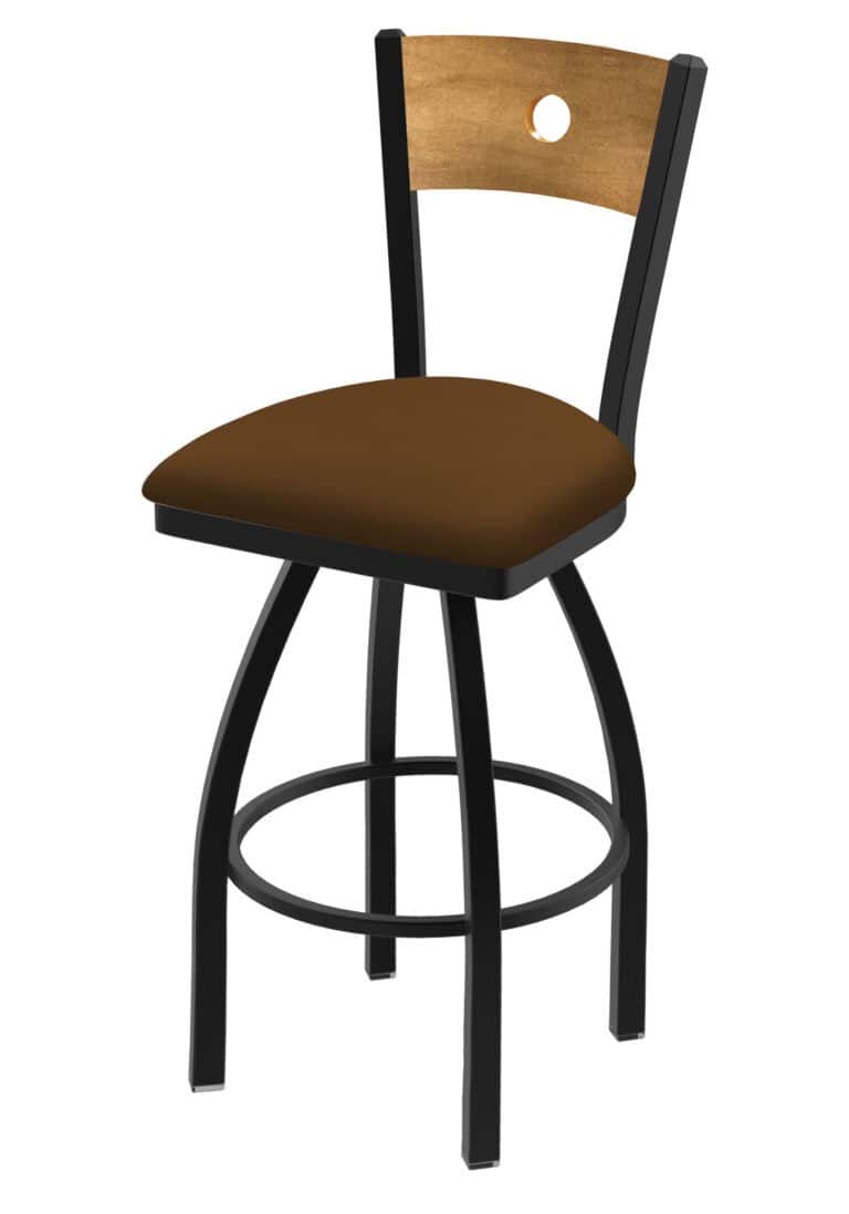 30-Inch Steel Swivel Bar Stool with Black Wrinkle Finish, Dark Cherry Maple Solid Maple Wood Seat, Padded Back, and Single-Ring Base