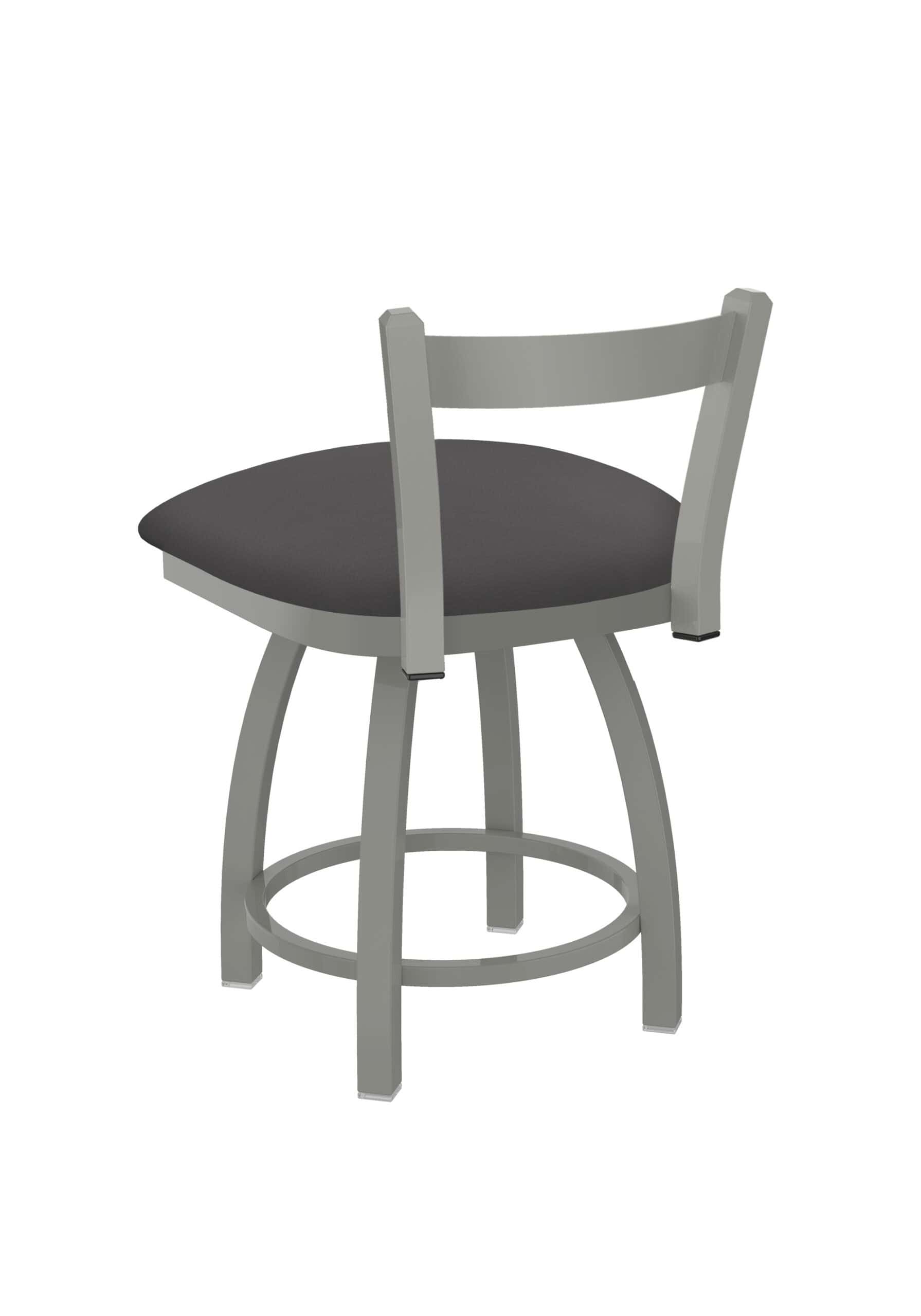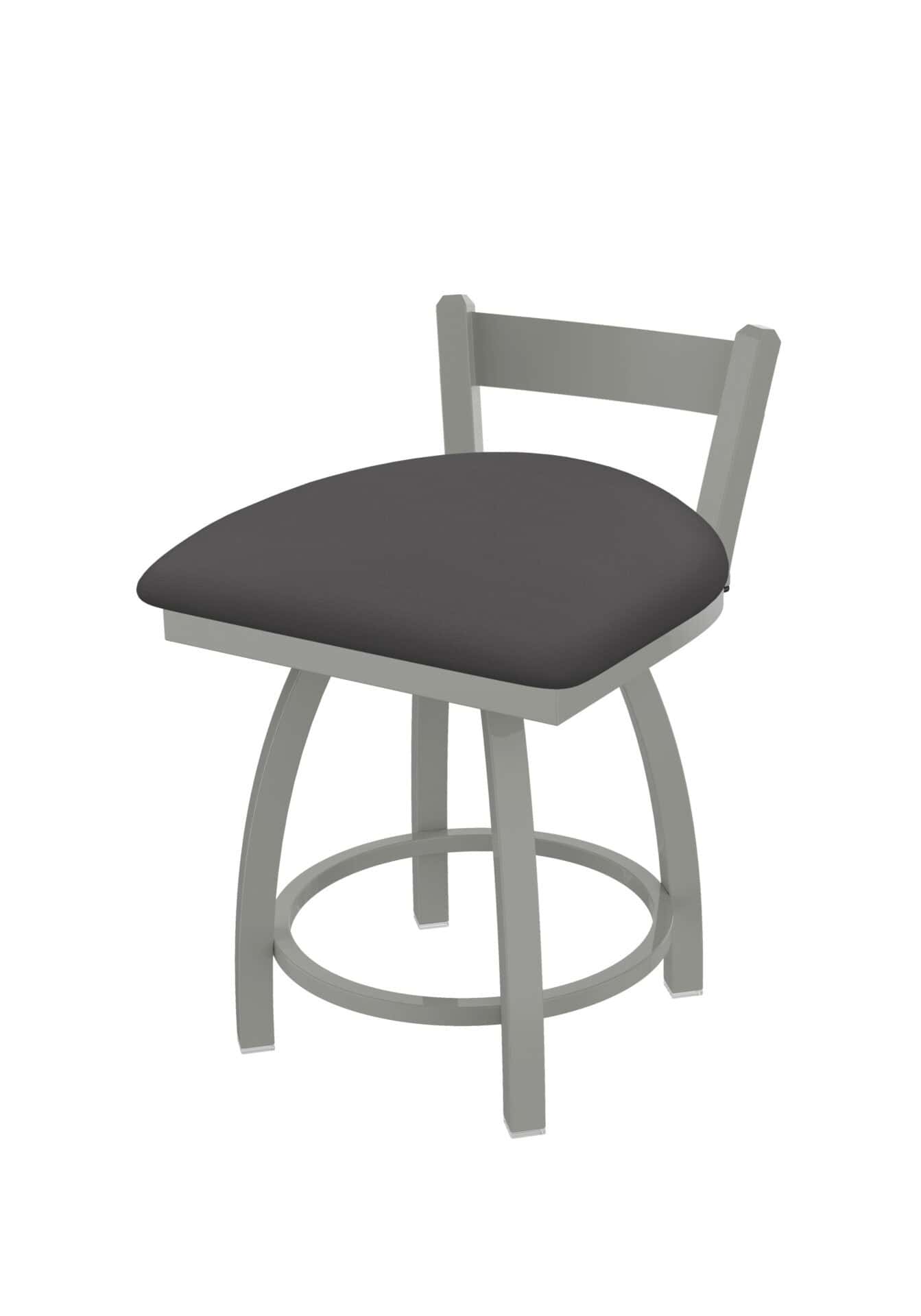 This 18-Inch Low Single Slat Back Vanity Stool is designed to complete your vanity, desk, or counter area with a touch of contemporary style. It features a durable steel frame with an anodized nickel finish and a comfortable Canter Storm vinyl seat. The low-back design allows it to tuck neatly under counters, while the single-ring base provides stability. Enjoy superior comfort and lasting quality with this exceptional stool.