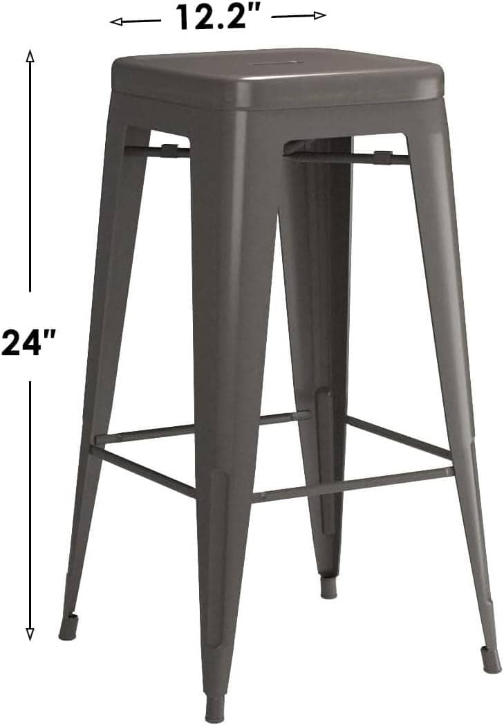 The 24-Inch Indoor Outdoor Gunmetal Stacking Metal Barstools (Set of 4) offer a perfect blend of style, durability, and functionality. Designed for both indoor and outdoor use, these backless barstools are lightweight yet sturdy, making them an excellent choice for various spaces such as kitchens, dining areas, patios, and man caves. With their stackable design, these stools save space when not in use, while the scratch-resistant and rust-proof coating ensures long-lasting use. The addition of an X-brace under the seat enhances stability, and non-mar rubber feet prevent floor damage, making these stools a practical and stylish solution.