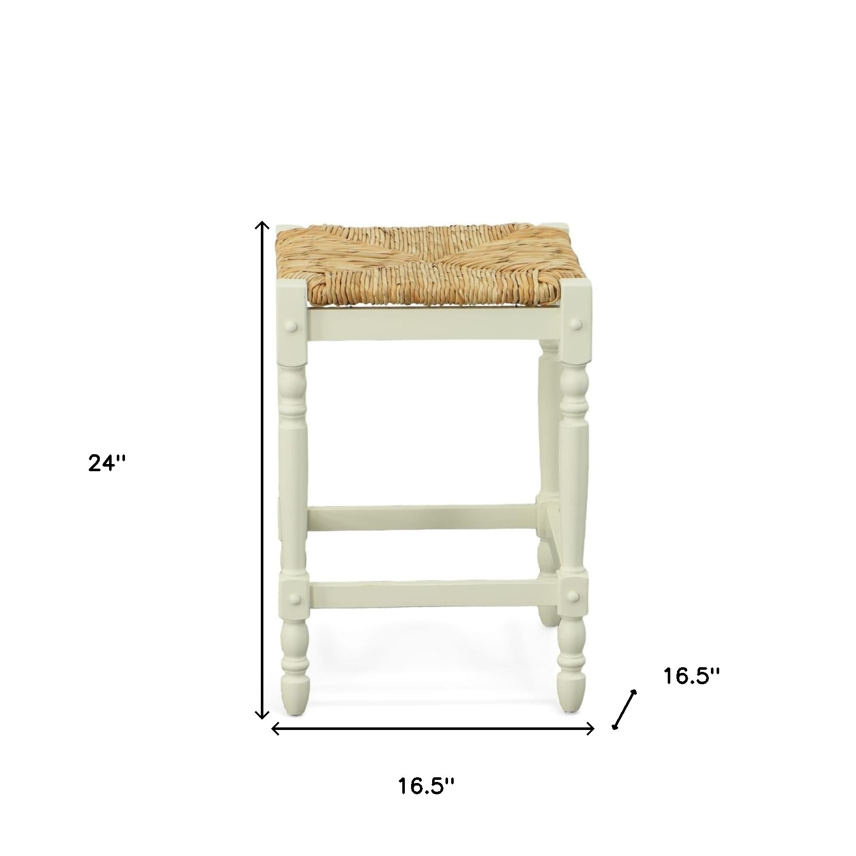 Comfort and design blend seamlessly in the 24-Inch Natural and Antiqued White Backless Bar Stool. This stylish counter-height stool features a natural rush seat that provides a striking contrast to the antiqued white solid wood base. Its square-shaped seat and backless design offer a fresh, modern look while maintaining practicality. With a built-in footrest, this stool ensures comfort and leg support, making it a perfect addition to your bar, kitchen, or entertainment space.