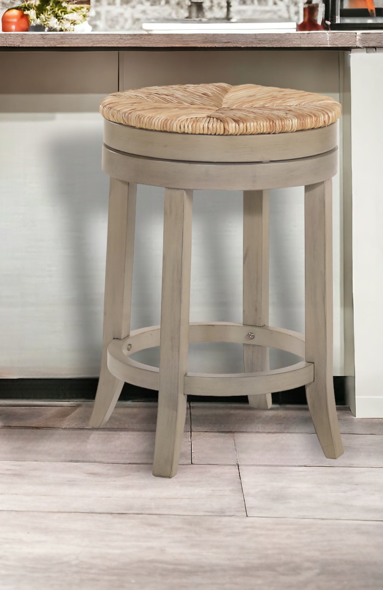 The 24-Inch Natural Gray Wood Swivel Backless Counter Height Bar Stool is a stylish and functional addition to your space, perfect for replicating the charm of your favorite cafes or pubs. This stool features a natural rush seat that beautifully contrasts with the high-quality gray solid wood base. Its round, backless design not only provides a sleek look but also helps to create an open feel in your space. With a convenient swivel function and a built-in footrest, this bar stool ensures both style and comfort for any setting.