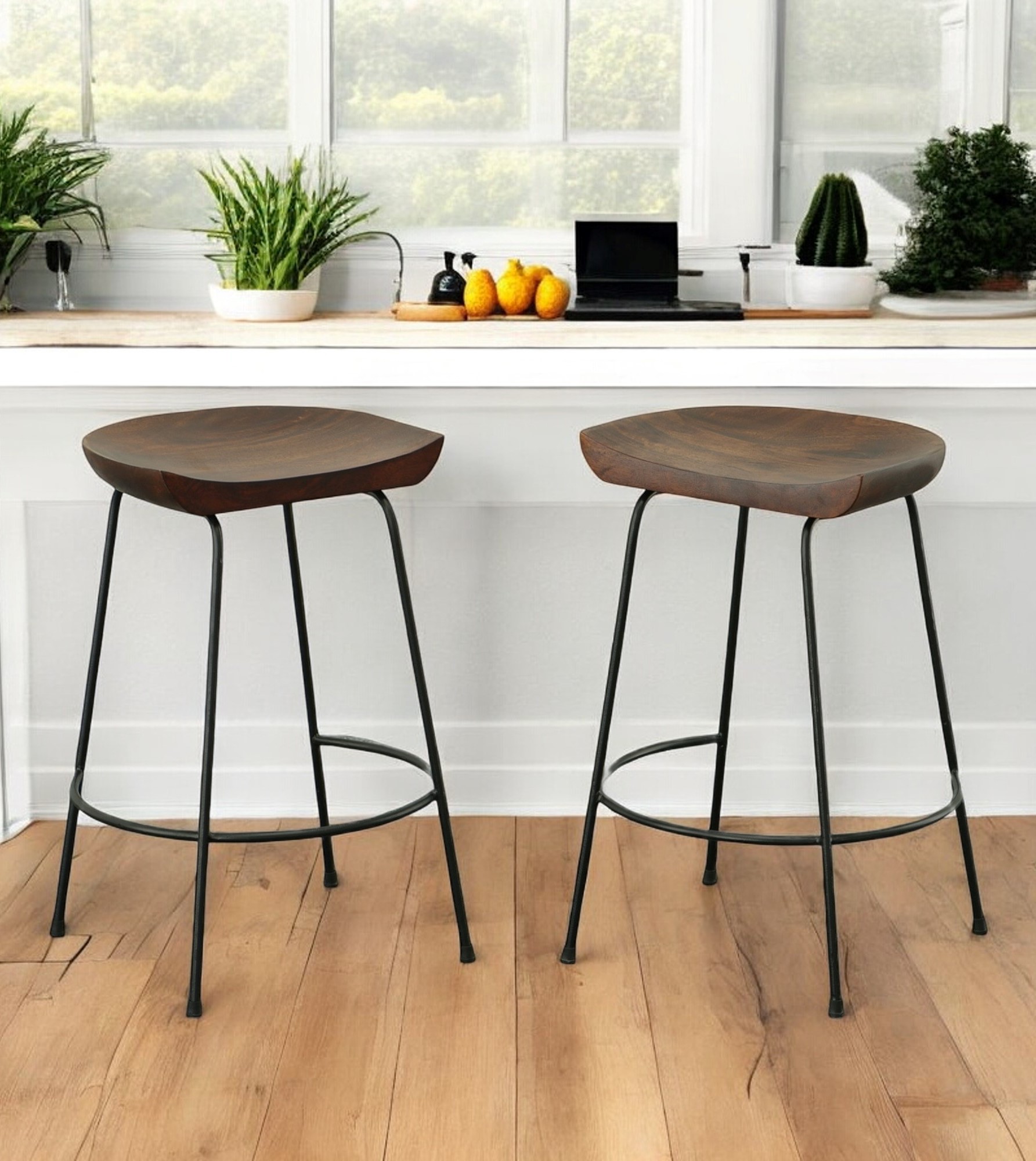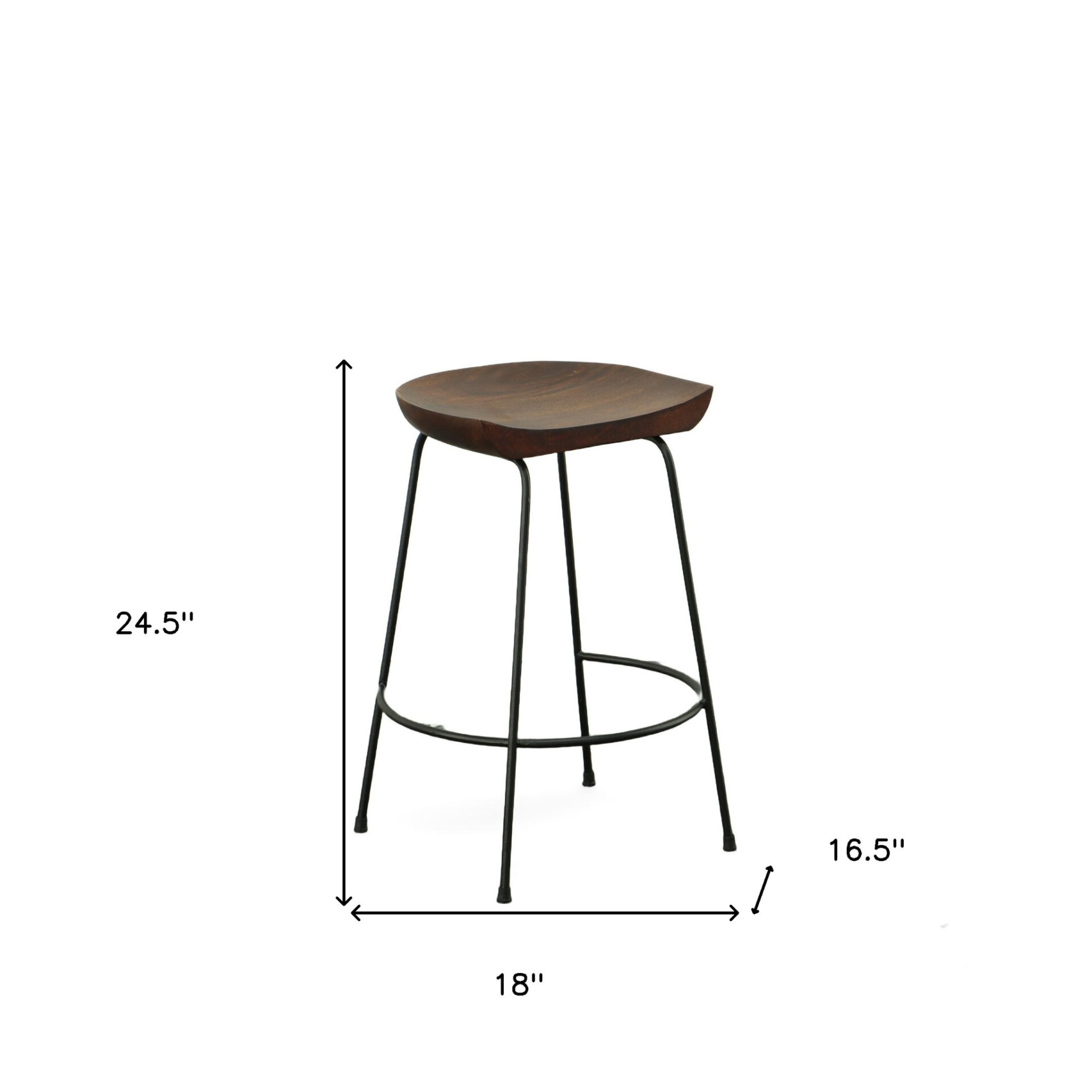 Bring a trendy bar vibe to your space with this set of two 25-inch chestnut and black steel backless counter height bar stools. Featuring a chestnut solid wood seat that contrasts beautifully with the high-quality black steel base, this set combines style and durability. The backless design and bucket-shaped seat provide a sleek, space-saving solution, while the integrated footrest ensures added comfort and support. Perfect for both functional and aesthetic needs, these stools are a great addition to any home bar or entertainment area.