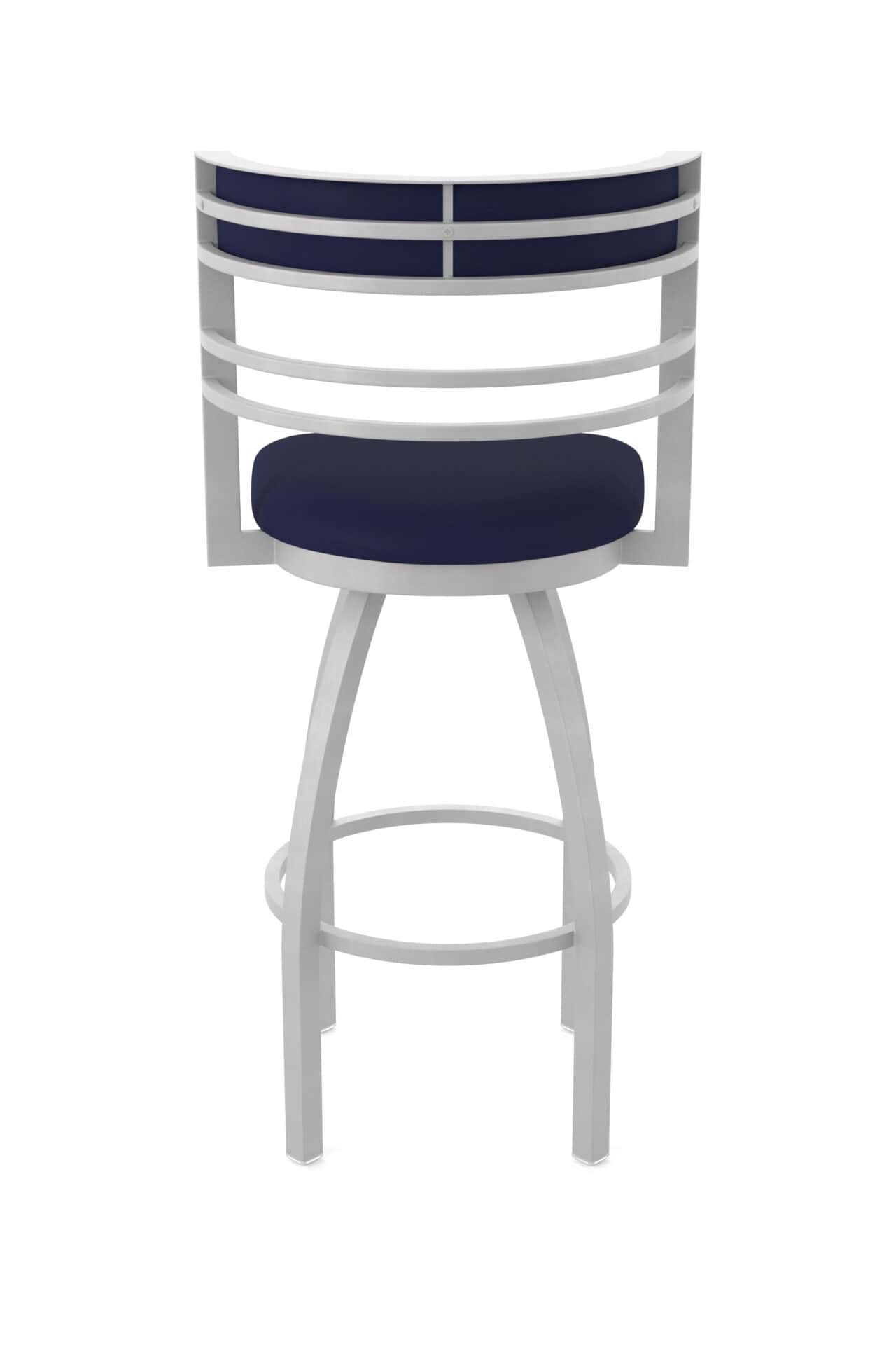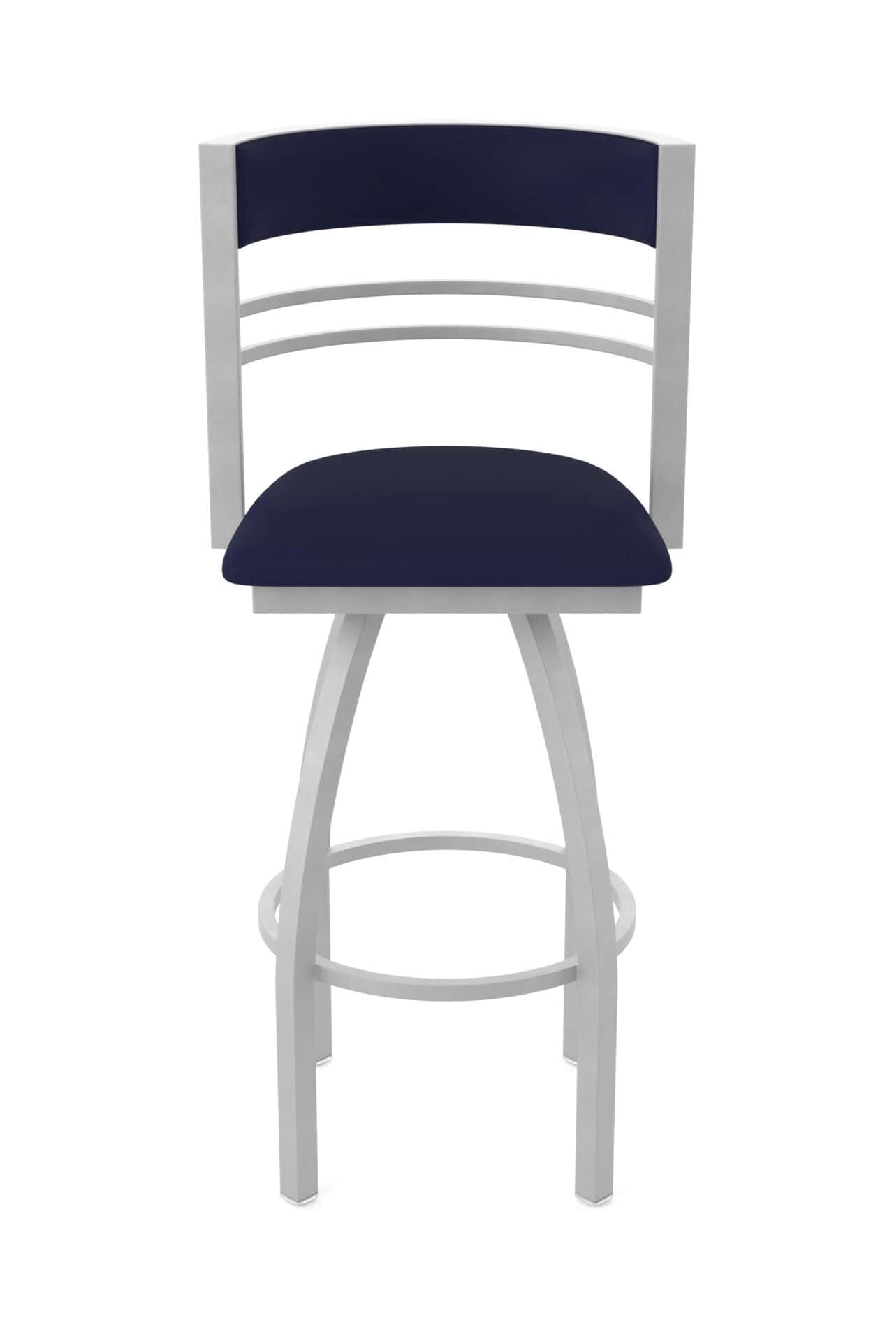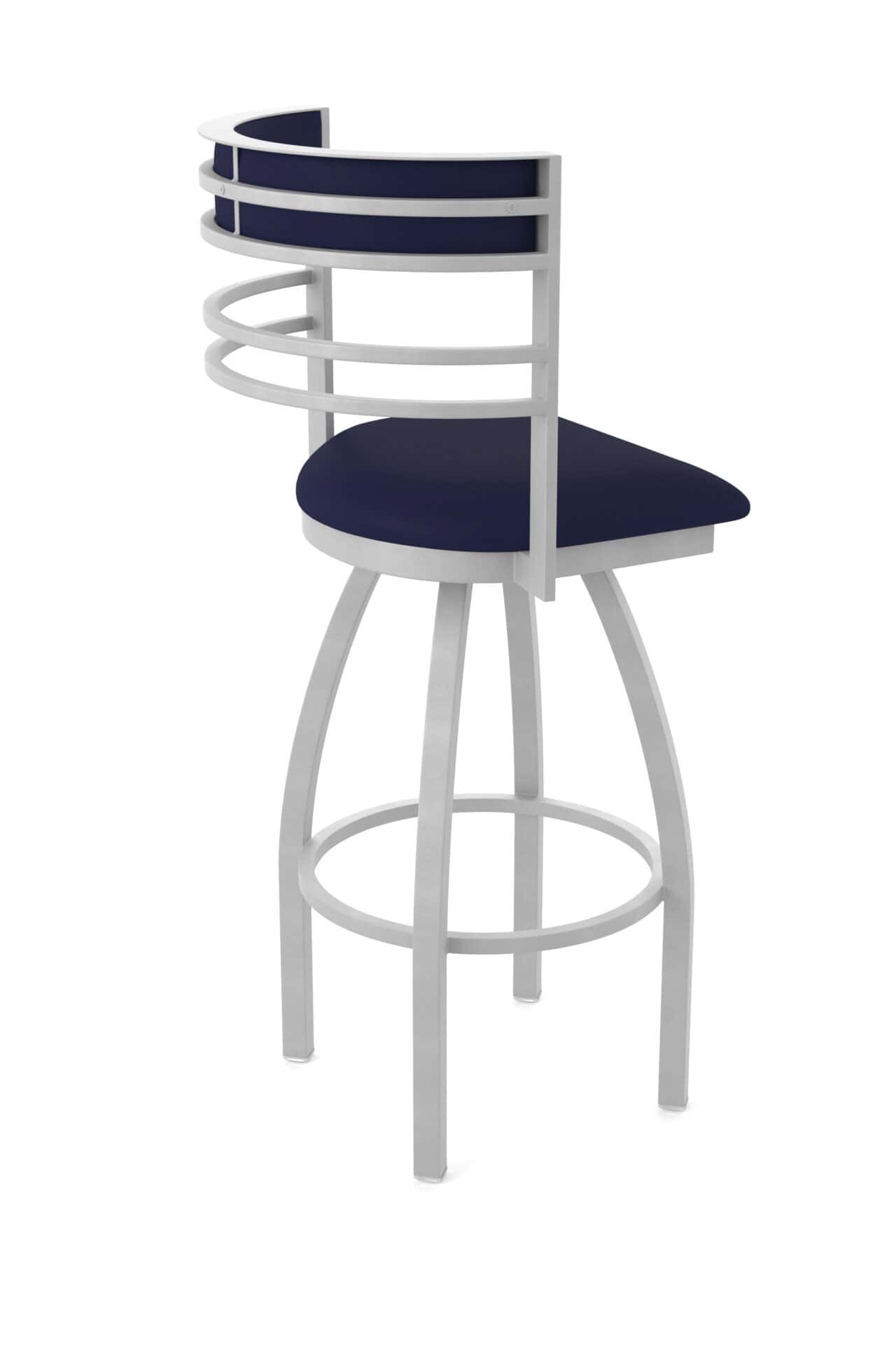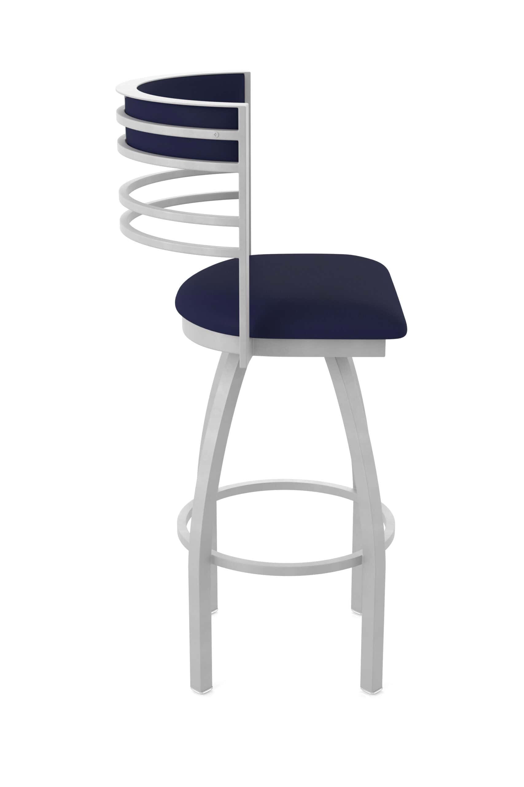 This stool features a sturdy steel frame with an anodized nickel finish, a comfortable Canter Twilight cushioned seat, and a tall, curved slat back for added support. The single-ring base provides stability, while the smooth swivel mechanism ensures easy movement. Customize the seat and backrest with your choice of vinyl or fabric to perfectly match your man cave decor.