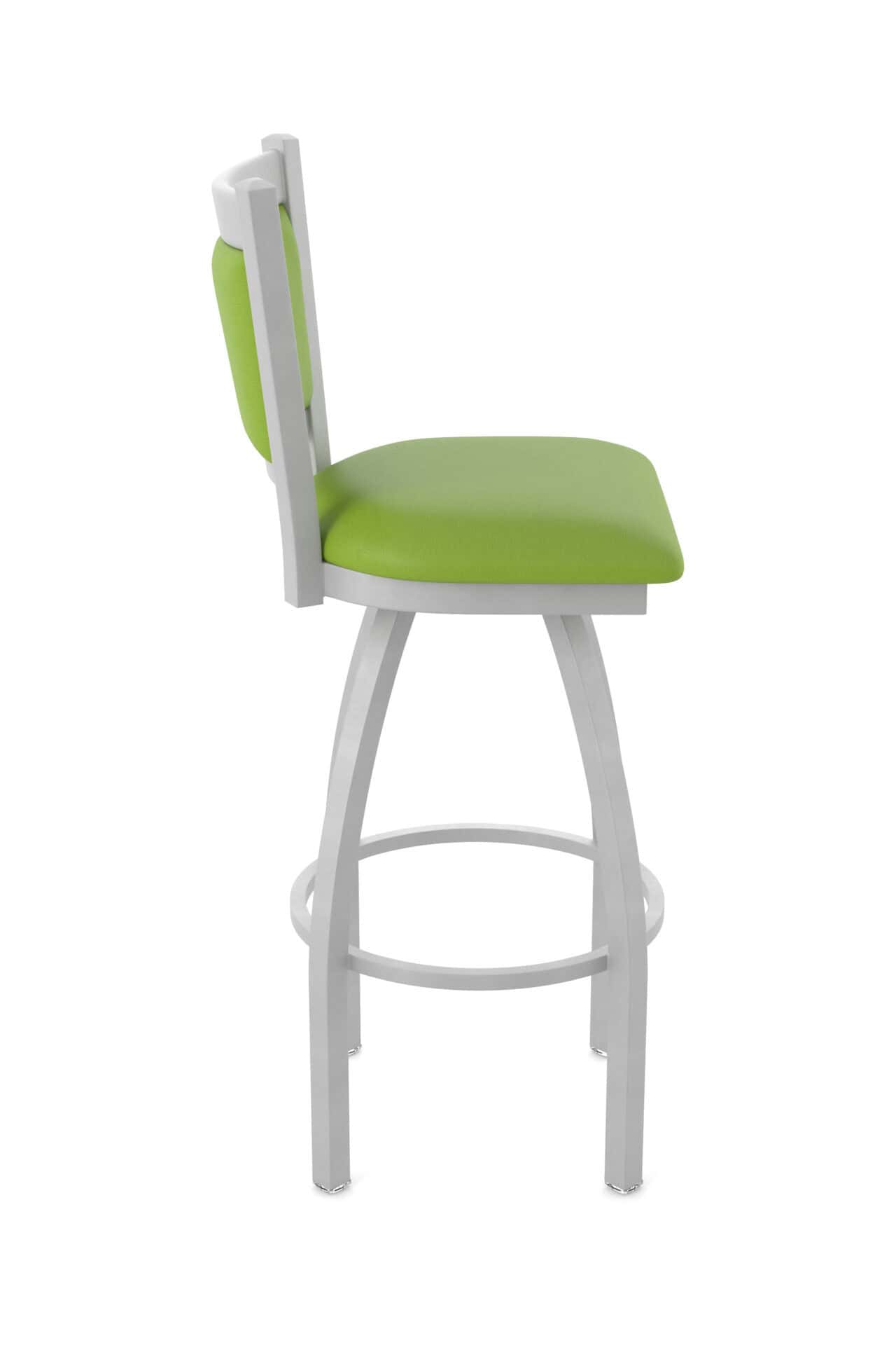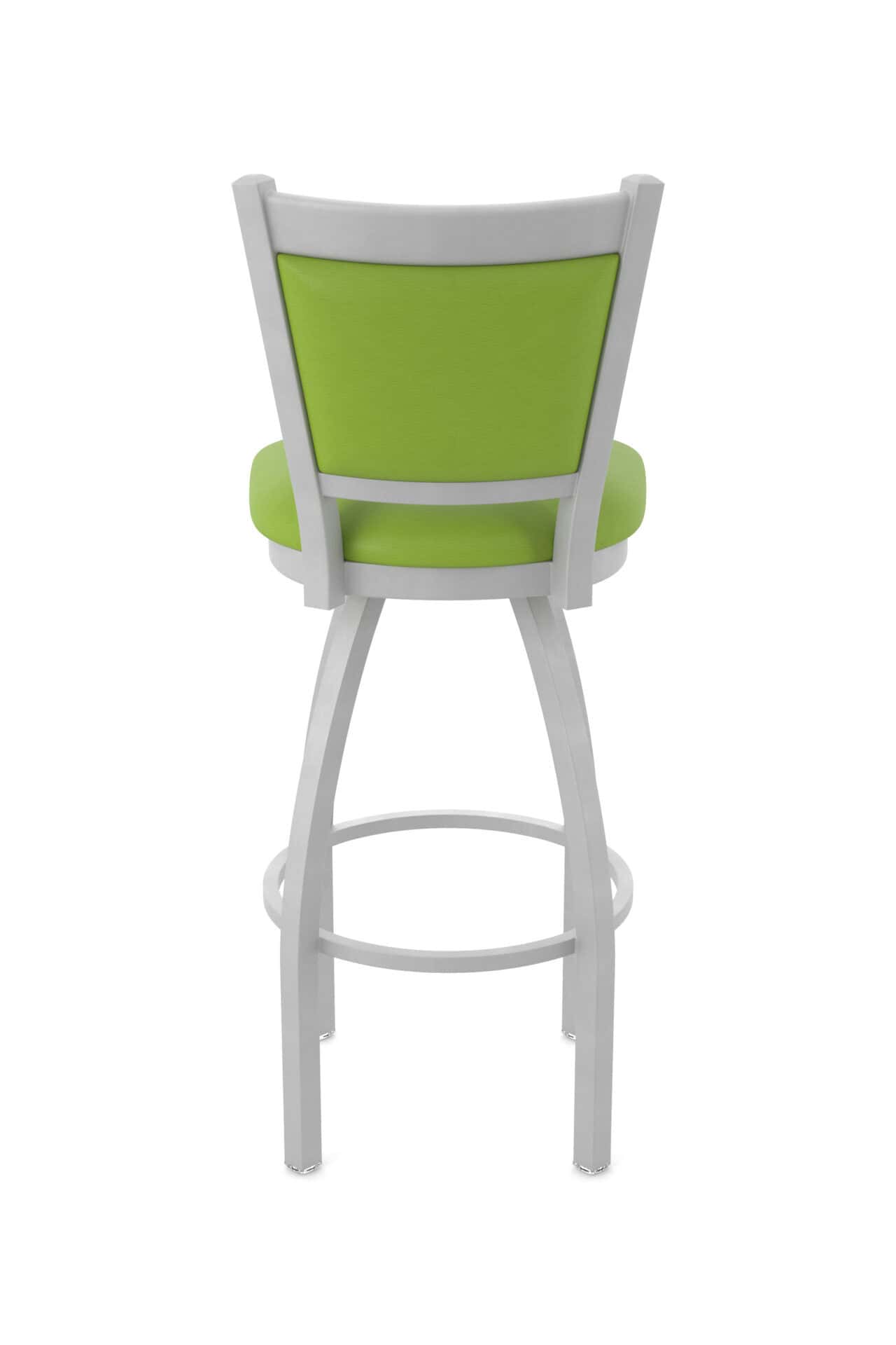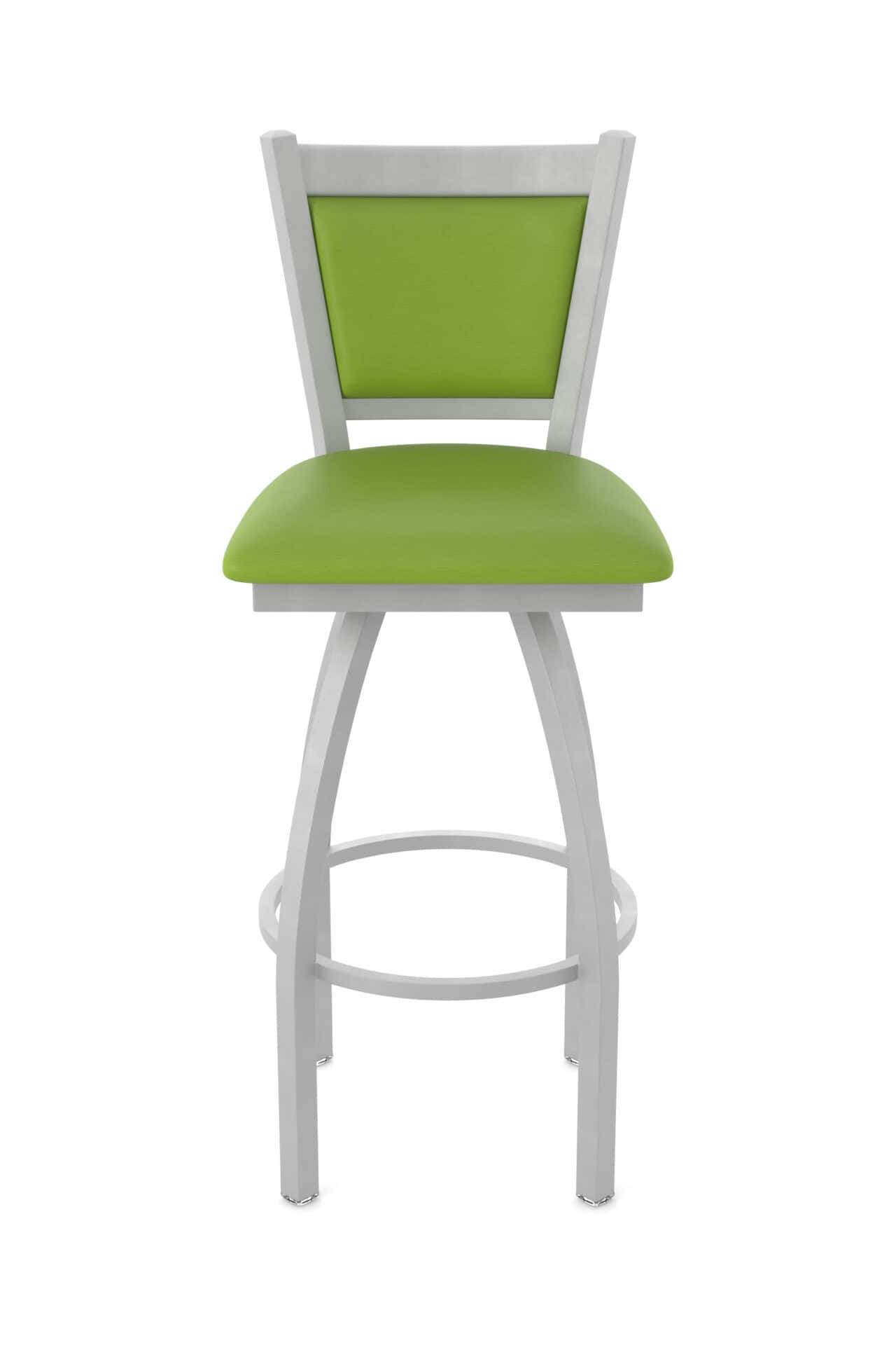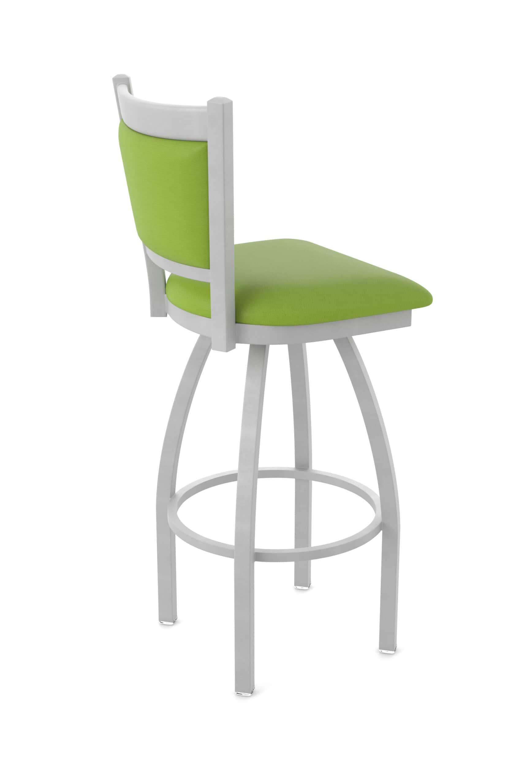 This stool features a heavy-duty steel frame with solid MIG-welded joints for exceptional strength and durability. The swivel mechanism, with its stainless steel ball bearings, provides smooth and consistent rotation. The padded and upholstered back is contoured for maximum comfort.