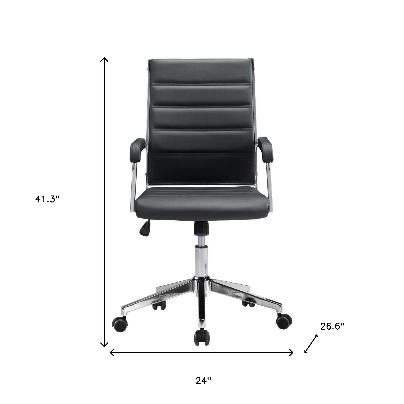 The 26 Inch Black and Silver Adjustable Faux Leather Office Chair is a perfect blend of style, comfort, and functionality. Designed with a durable steel frame and upholstered in soft faux leather, this chair offers a sophisticated look while providing long-lasting use. Featuring a tufted design, padded armrests, and height adjustability, this chair is both practical and visually appealing, making it a great addition to any office or home workspace.