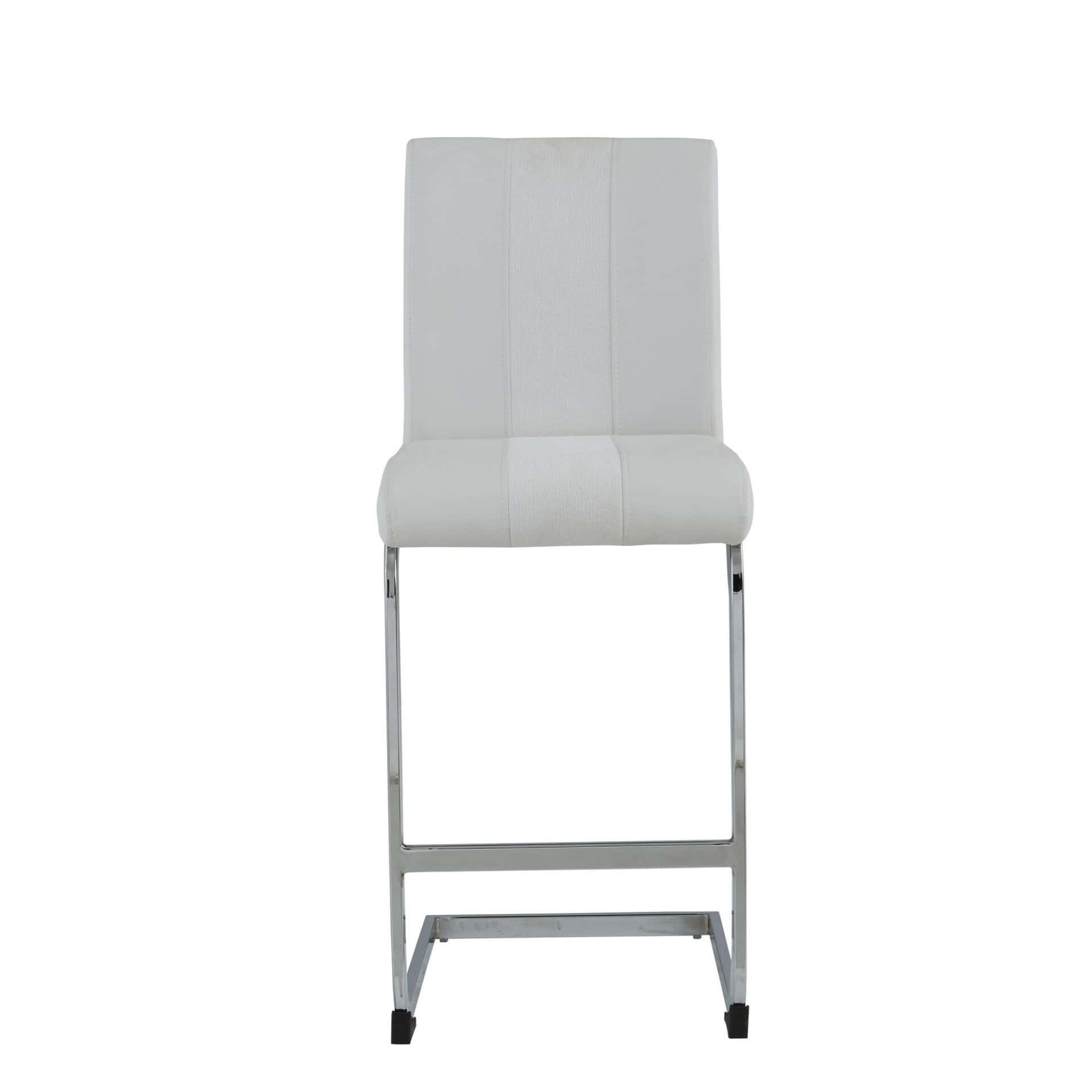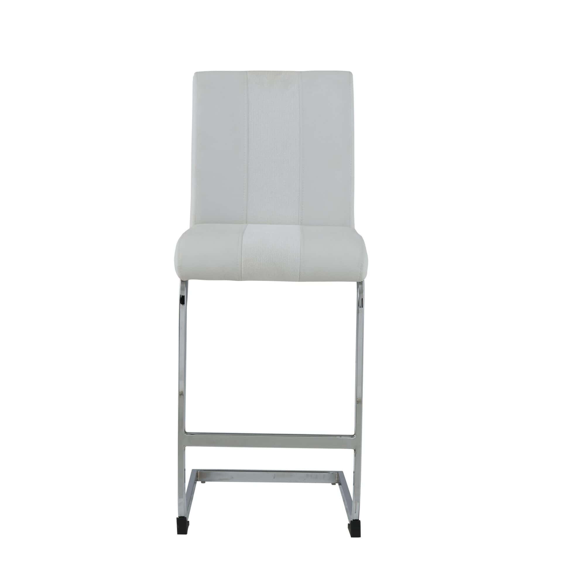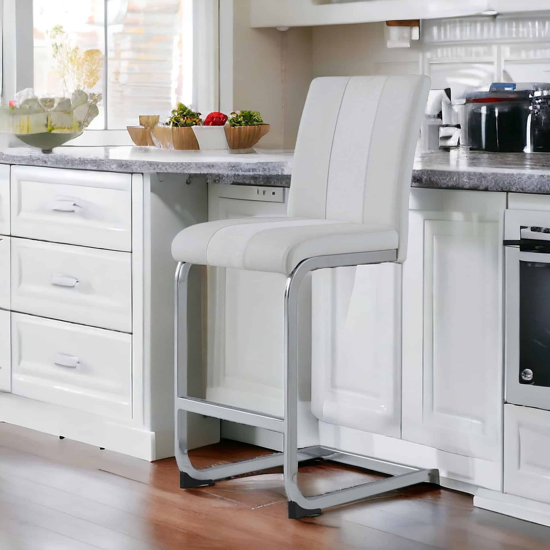 Comfort and style blend seamlessly in this set of four 26-inch white and silver metal low back counter height bar stools. These stools feature a durable silver metal frame paired with a white solid and manufactured wood seat, creating a modern and updated aesthetic. The square-shaped seat and low back design ensure both comfort and visual appeal, while the integrated footrest provides added support and convenience. Perfect for kitchen counters, home bars, or man caves, these stools offer functional seating without compromising on style.