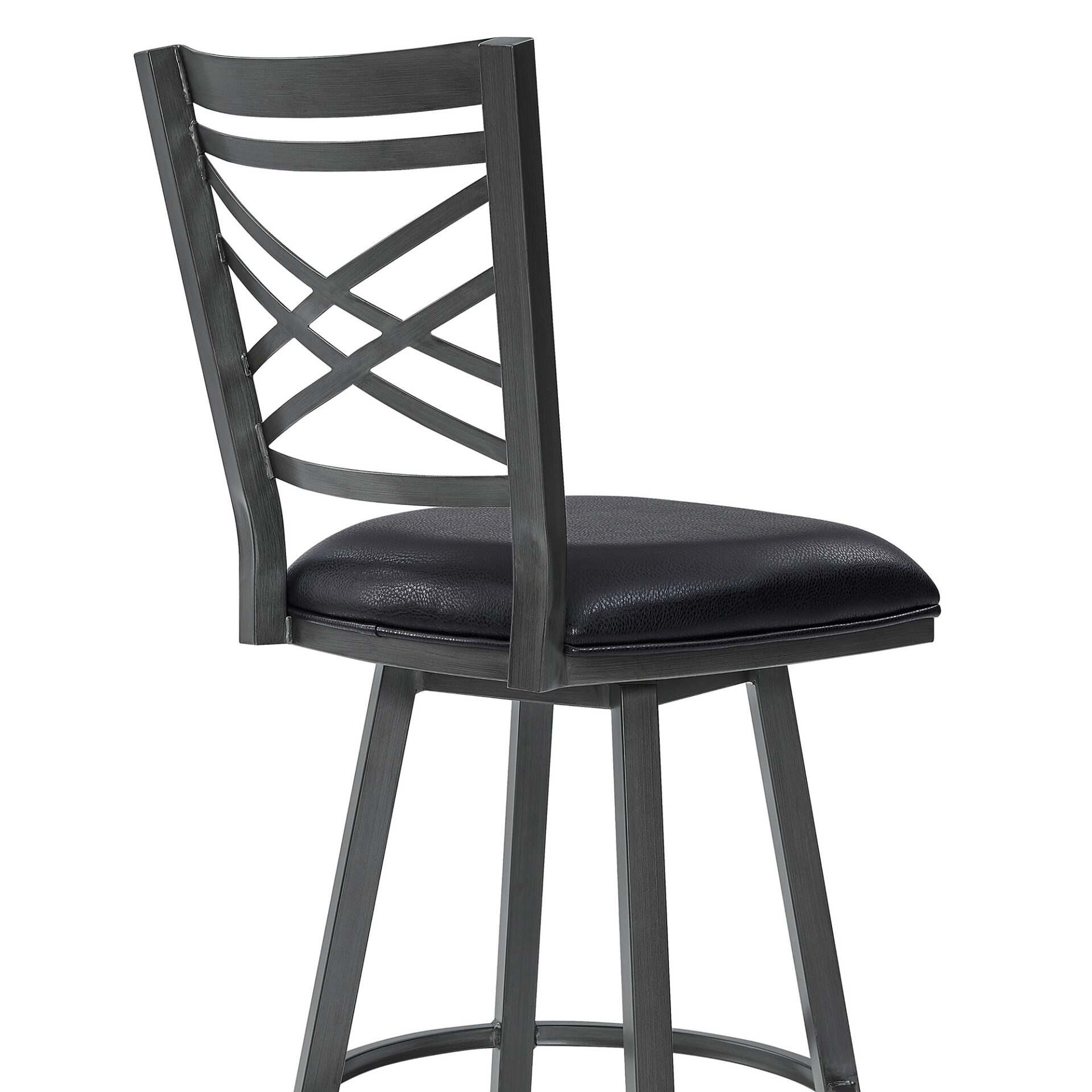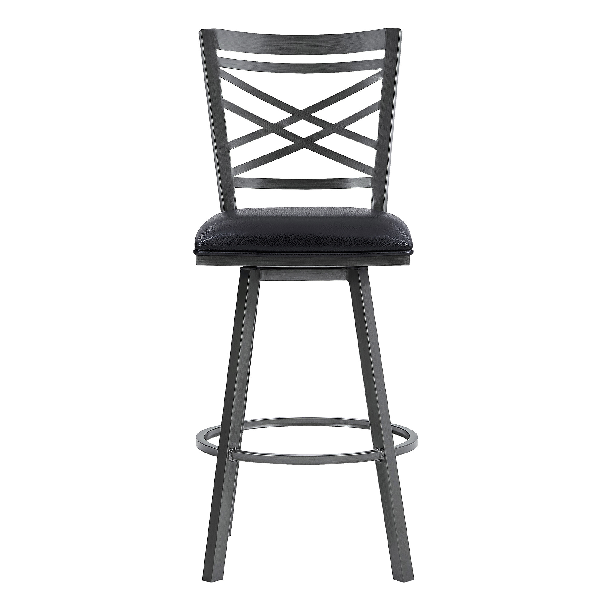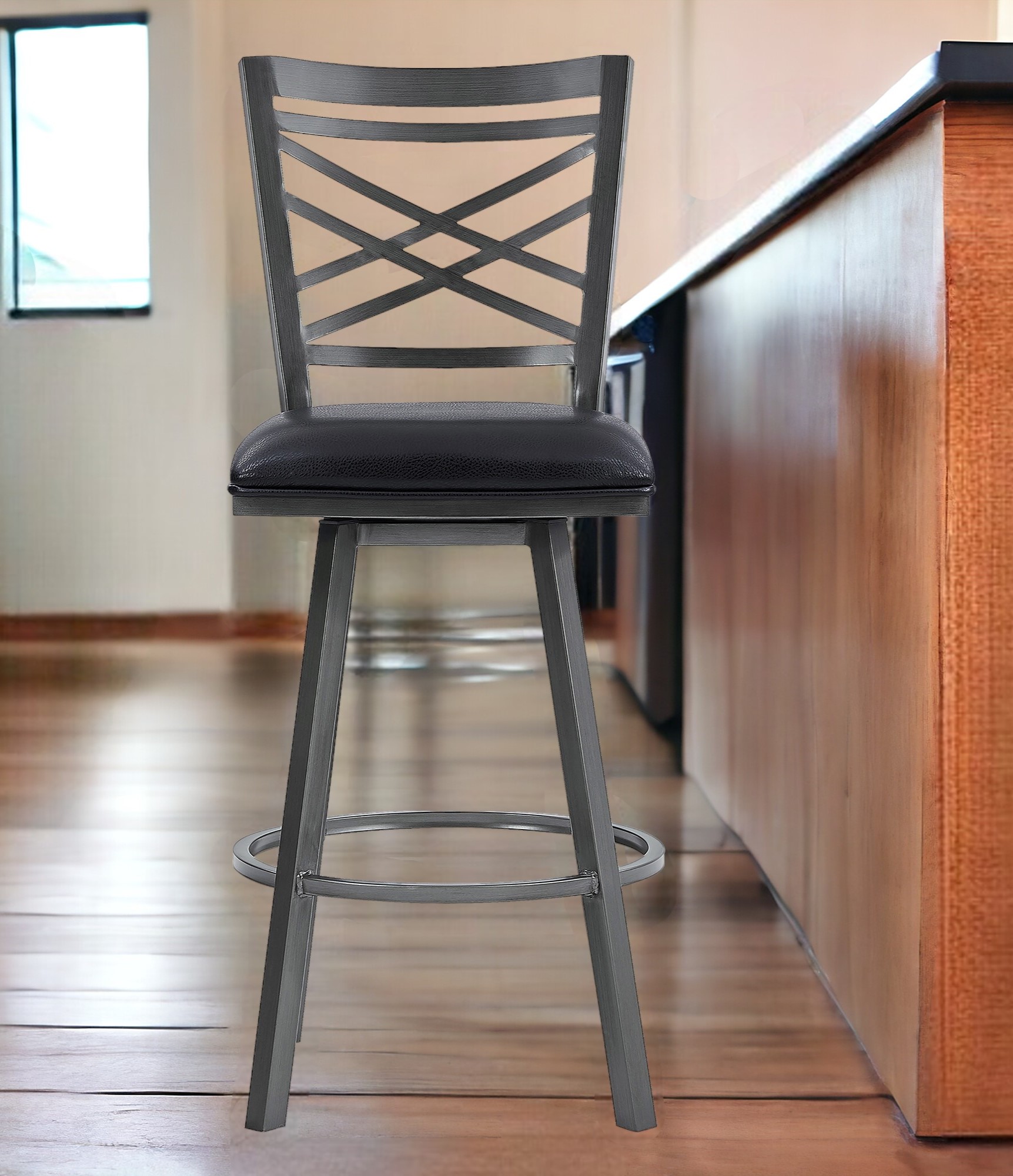 The 30-Inch Black Iron Bar Height Swivel Bar Stool brings a stylish and practical seating solution to your space, reminiscent of your favorite cafes or pubs. With its sleek black iron frame and matching black fabric seat, this stool boasts a chic, monotone design. Offering both comfort and functionality, it features a round-shaped seat, a full back for support, and a built-in footrest for added convenience. The stool also includes a full 360-degree swivel function, providing maximum mobility for a versatile seating experience.