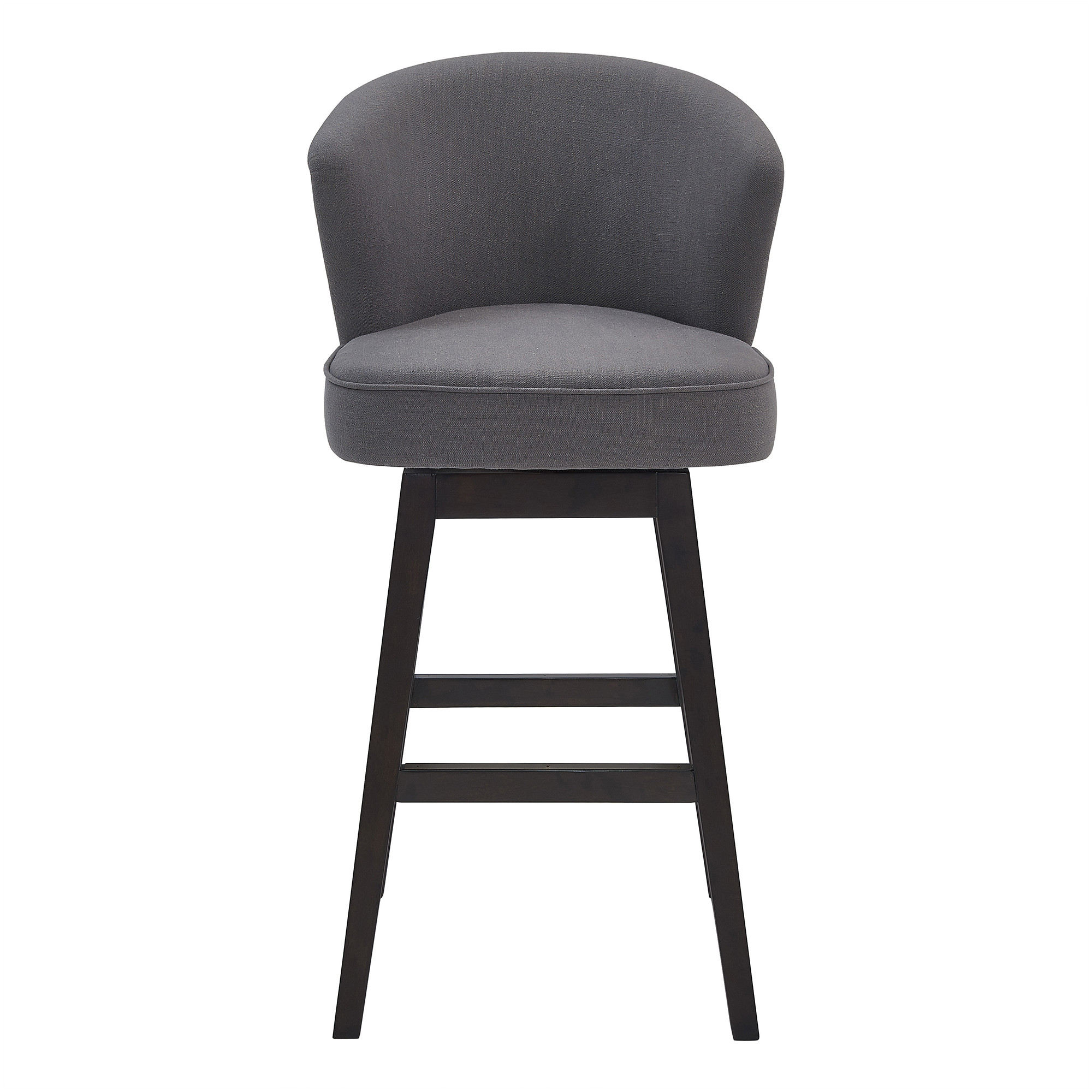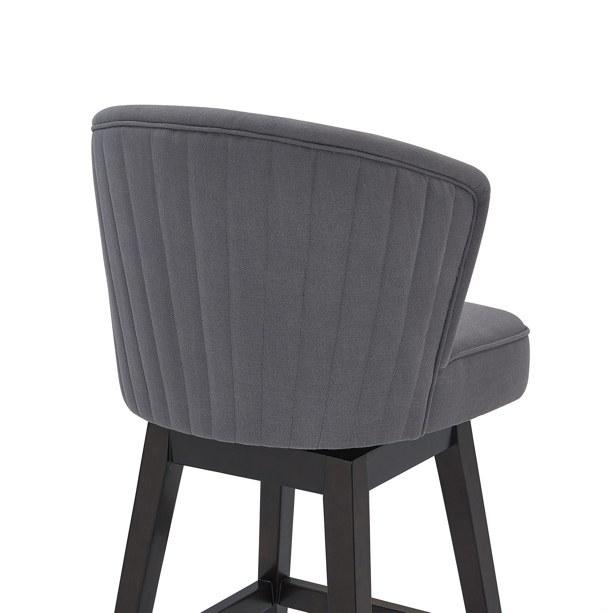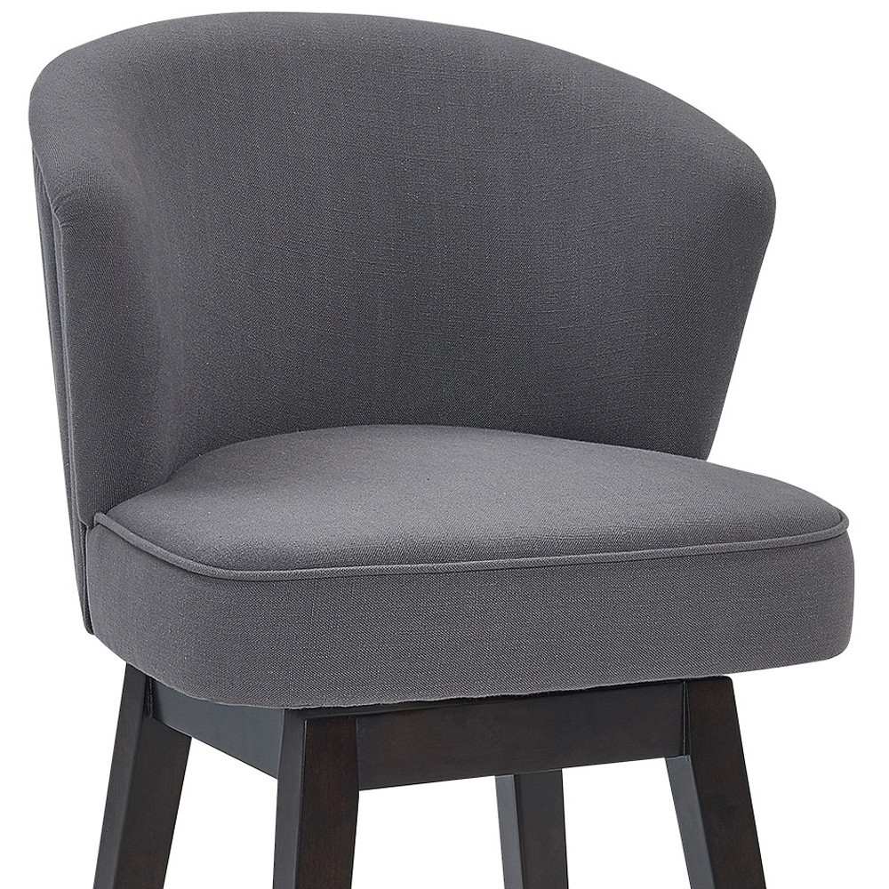 Introducing the 30 Inch Gray Espresso Modern Swivel Bar Stool, a perfect blend of style, comfort, and functionality. This bar stool is designed to enhance your space with retro-modern charm, featuring vertical channel stitching across the backrest for a sophisticated look. The high-density foam cushion is wrapped in durable, plush fabric upholstery, ensuring long-lasting comfort. Its 360-degree swivel seat provides full mobility, while the integrated footrest on the sturdy wooden base adds convenience and support. A stylish and practical addition to any bar or counter space.