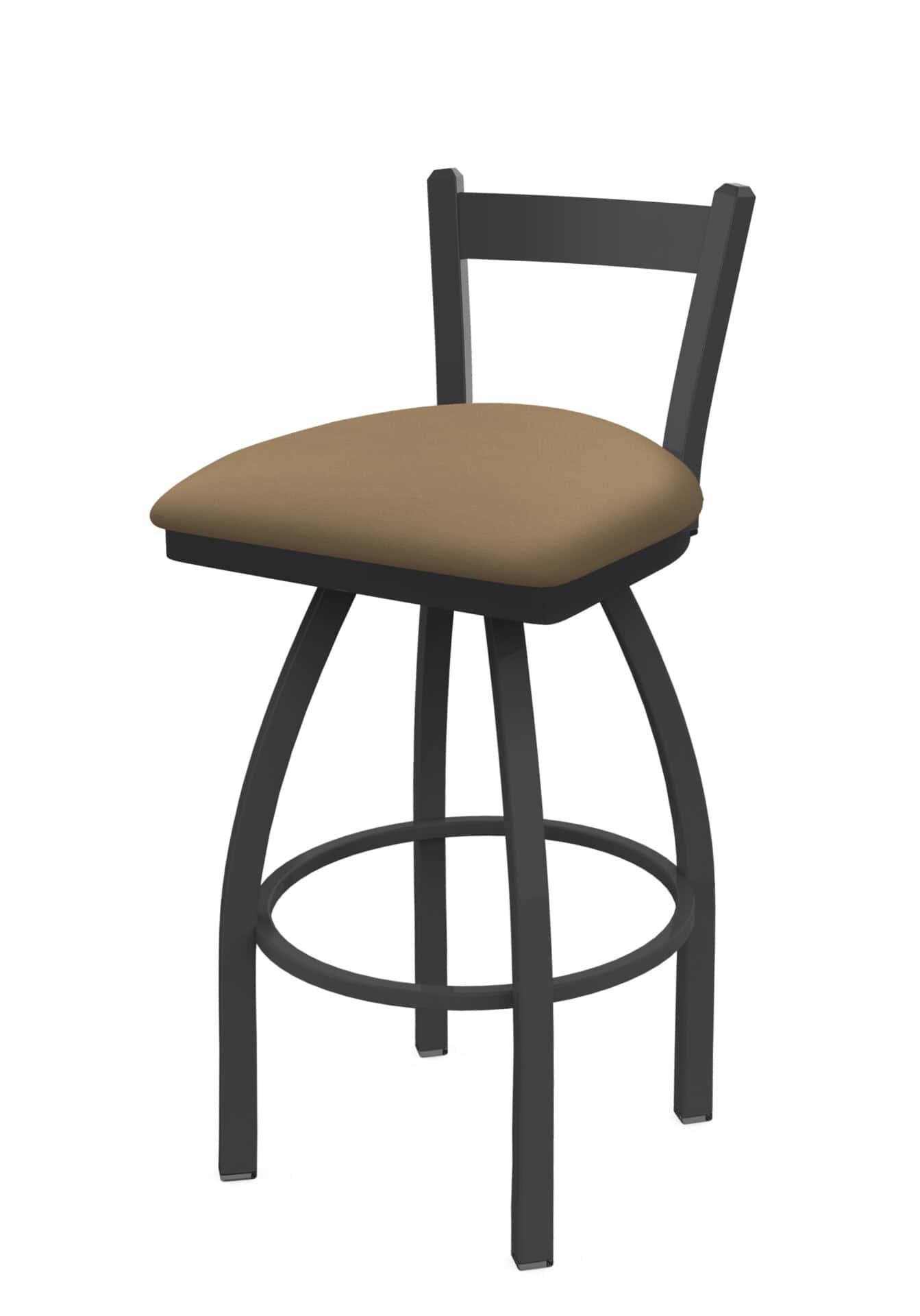 This 30-Inch Low Single Slat Back Bar Stool is designed for both style and comfort. It features a sturdy steel frame with a pewter finish and a comfortably padded “Canter Sand” seat. The low back design allows it to tuck neatly under counters, making it a great choice for smaller spaces.