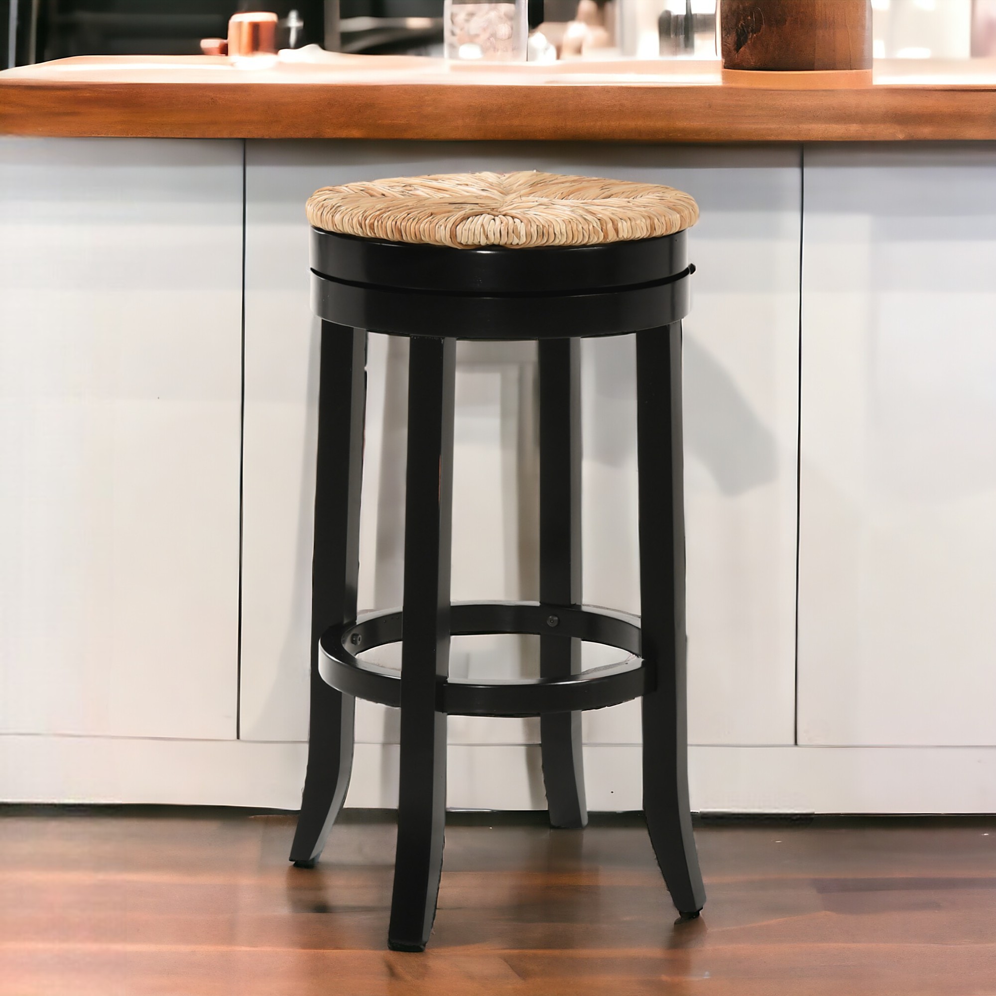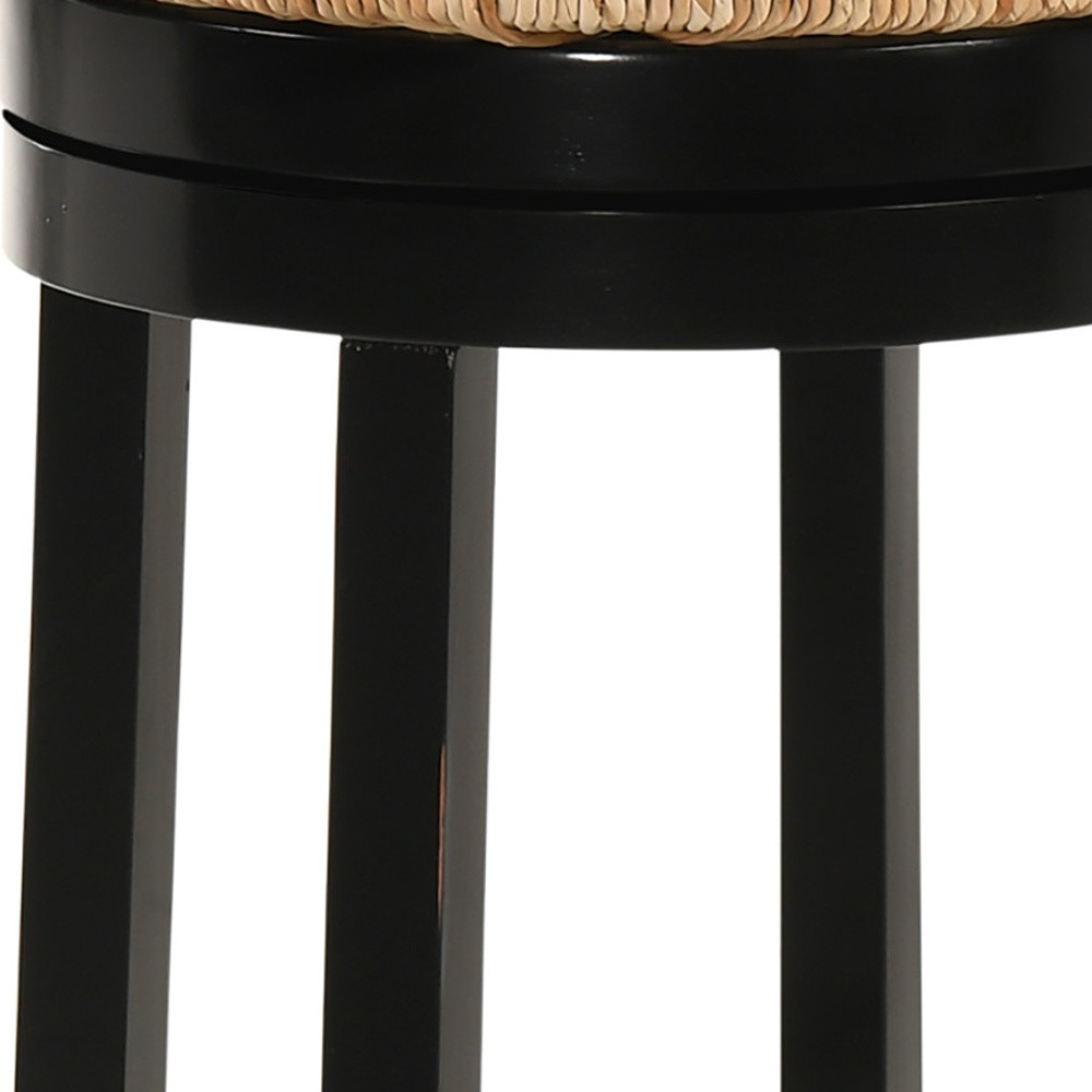 The 30-Inch Natural and Black Swivel Backless Bar Stool is a versatile and stylish addition to any bar or dining space. Crafted from high-quality solid wood with a sleek black finish and a natural rush seat, this stool combines durability with a fresh, modern aesthetic. Its backless design enhances the sense of space while the swivel function and integrated footrest ensure exceptional comfort and convenience.