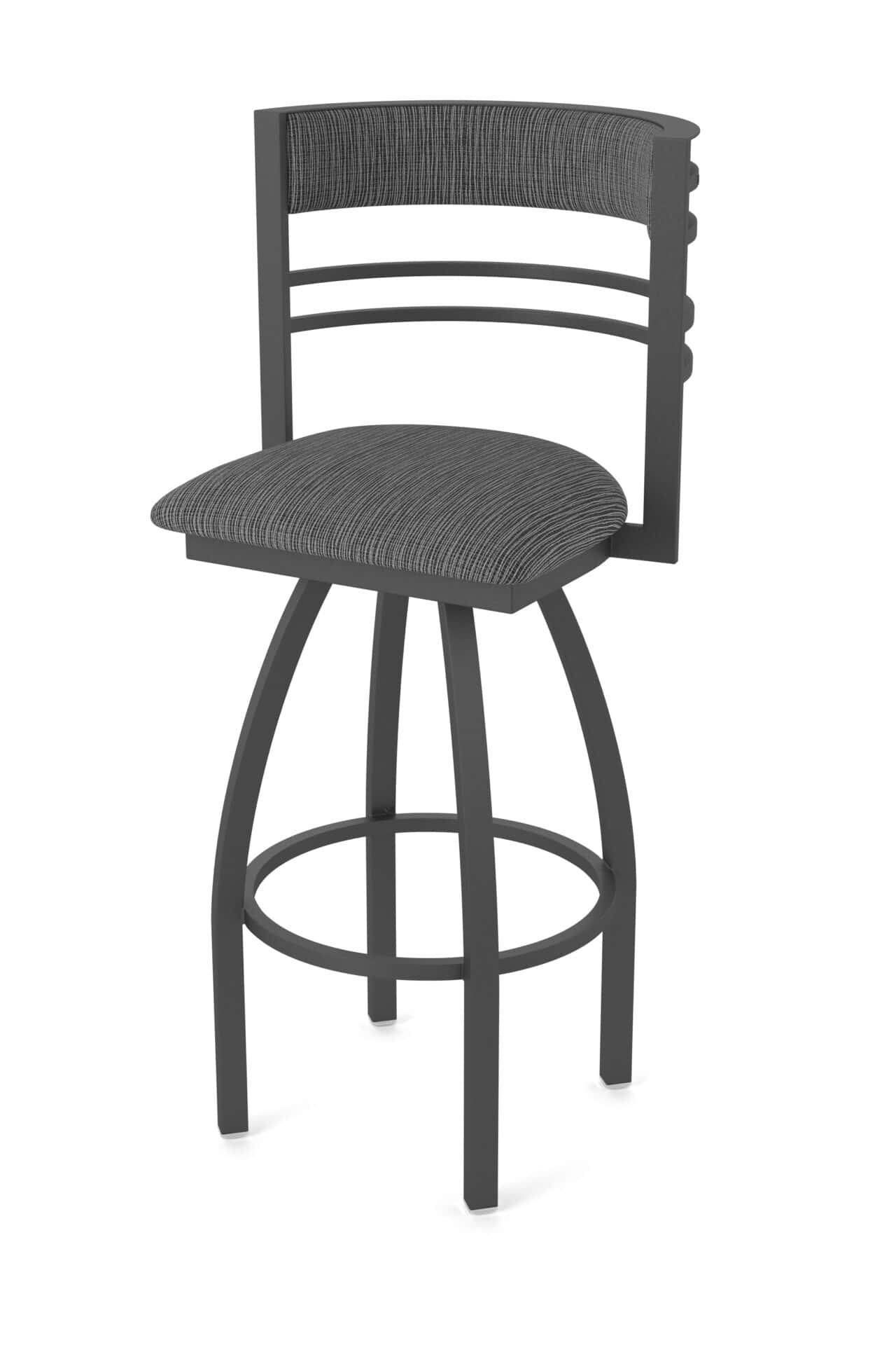 This 30-inch steel swivel bar stool offers a blend of distinguished design, robust craftsmanship, and exceptional comfort. The tall, curved slat back provides excellent support, while the plush, padded seat ensures a comfortable seating experience. The pewter finish and single-ring base add a touch of sophistication to any space.