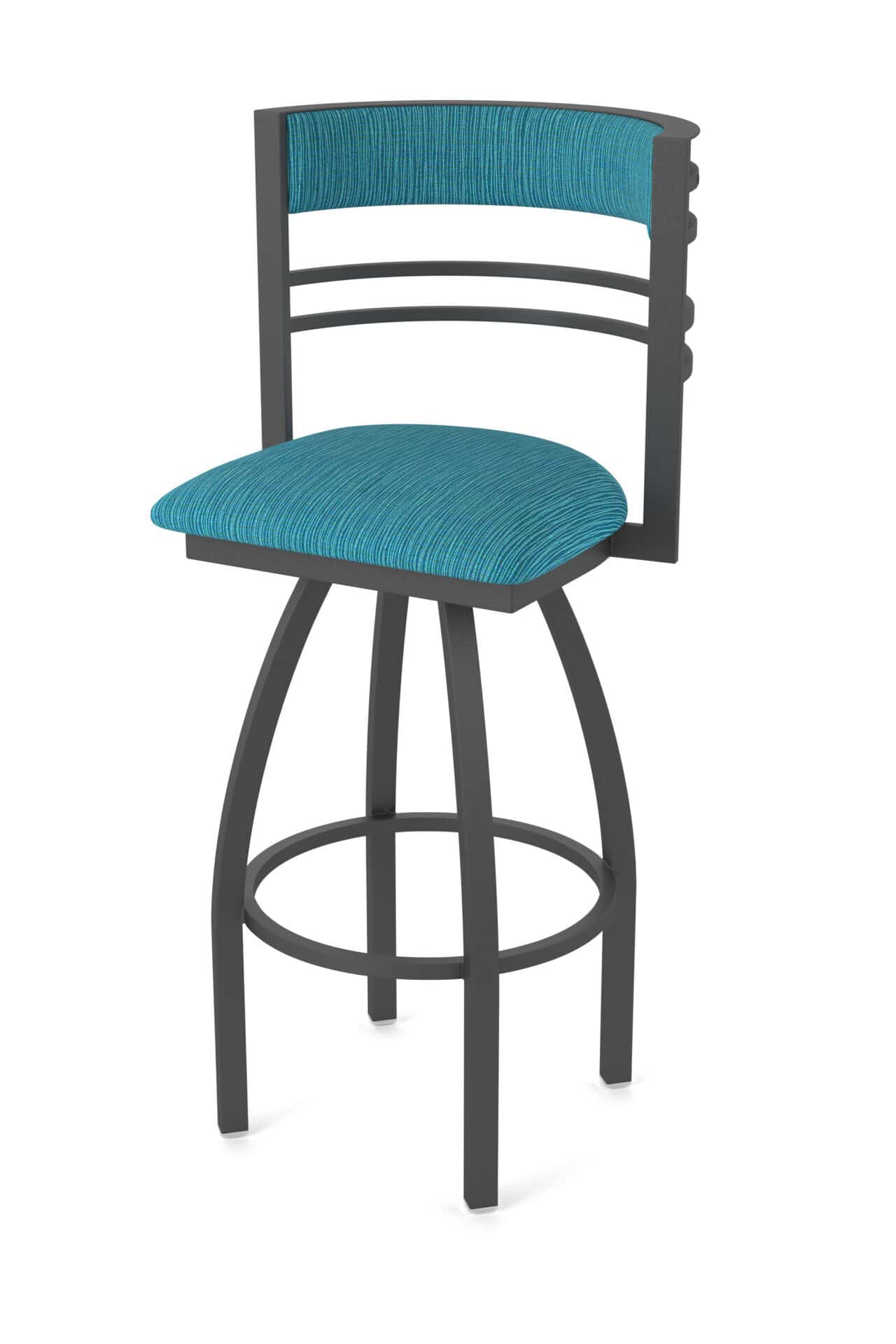 This 30-inch steel swivel bar stool combines distinguished design, durable craftsmanship, and exceptional comfort. Featuring a pewter finish, a Graph Tidal cushioned seat, a tall curved slat back, and a single-ring base, this stool is perfect for any bar or counter area. Enjoy the smooth swivel action and the supportive tall back as you relax in style.