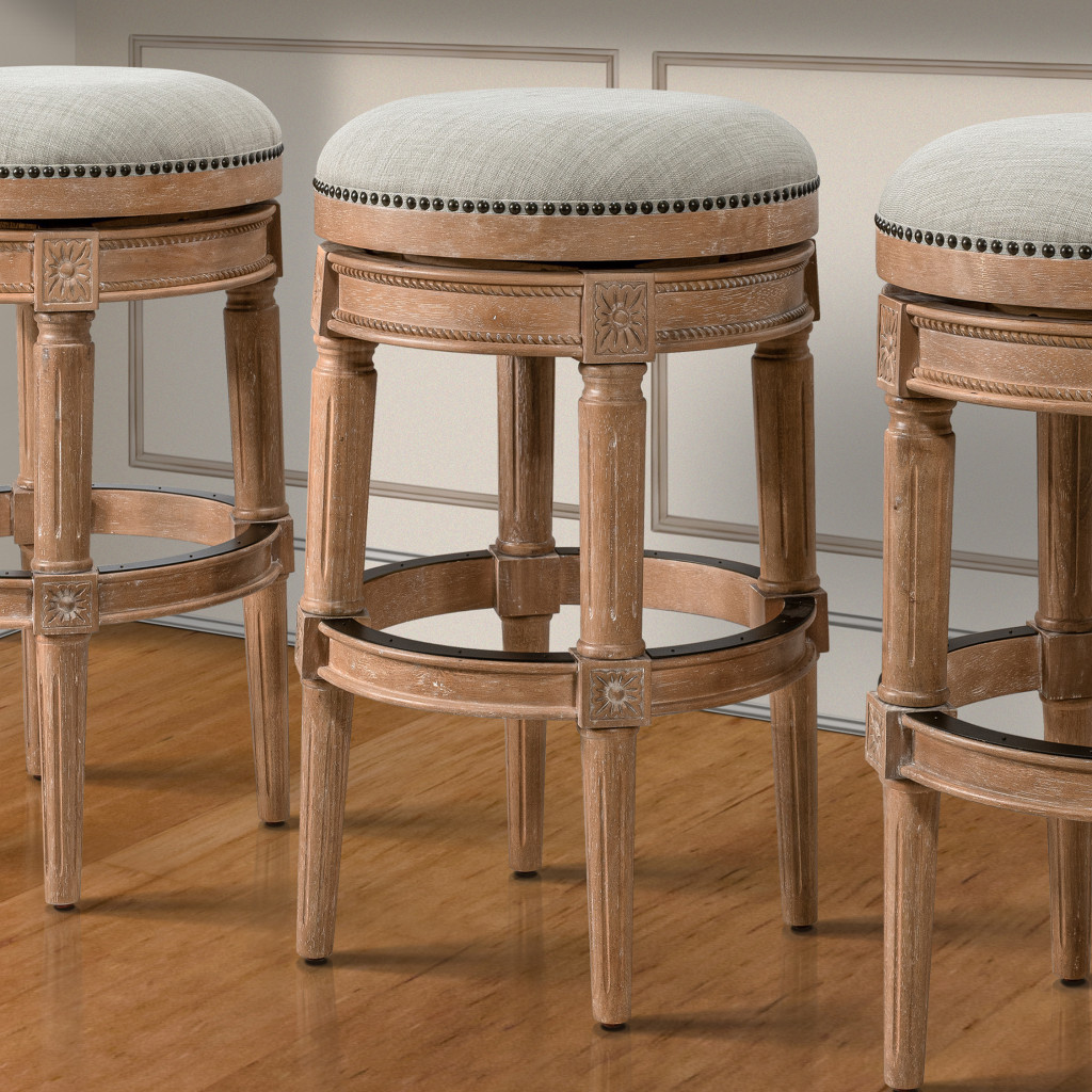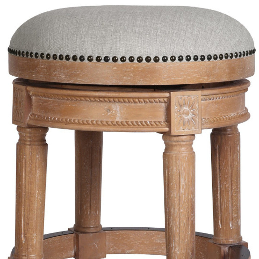 Comfortable and stylish, the 31-Inch Beige Natural Wood Swivel Backless Bar Stool is the perfect addition to elevate your space. Crafted from natural solid wood, this bar stool features a durable beige linen upholstered seat complemented by nailhead trim for added sophistication. Its backless design helps to open up sightlines, making your room feel more spacious. With a full 360-degree swivel function and a built-in footrest, this stool offers both convenience and comfort, making it ideal for extended seating.