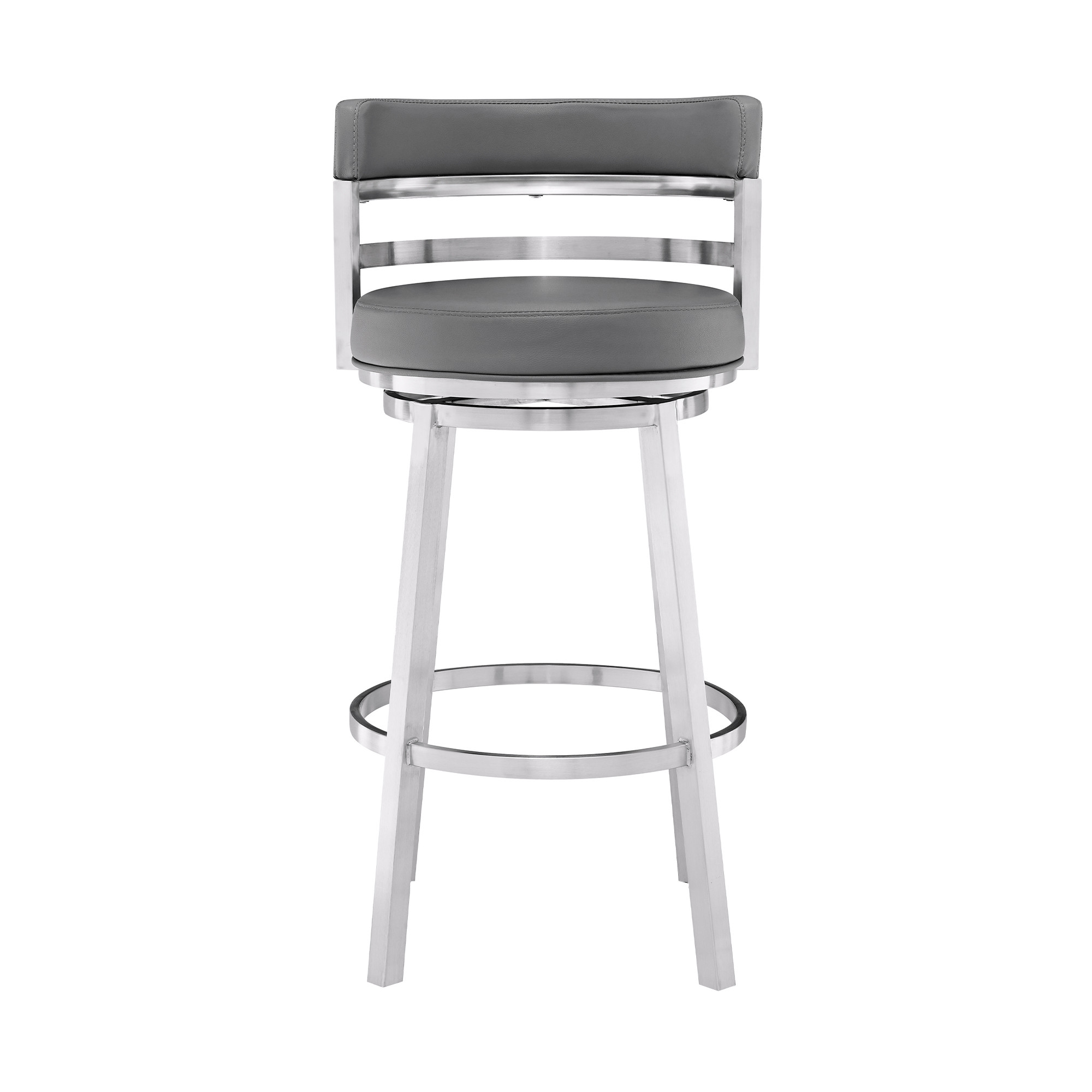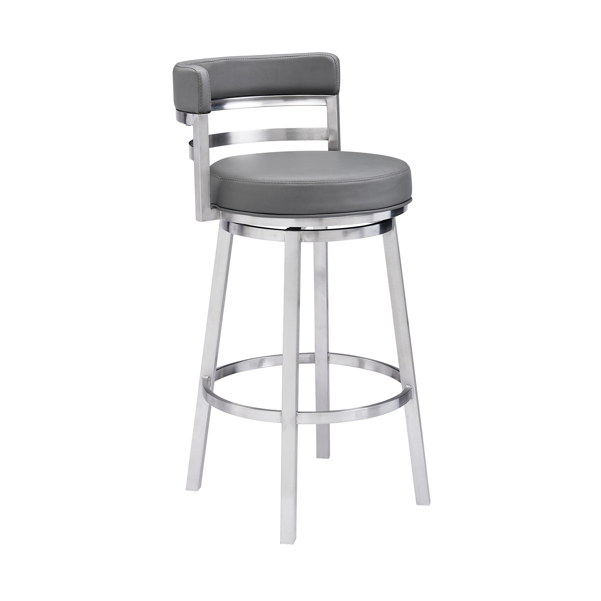 Comfort meets style with the 35″ gray faux leather swivel low back bar stool. This sleek and modern bar stool features a durable brushed stainless steel iron base paired with a stylish gray faux leather seat. The round seat design, combined with a low back, ensures both fashion and comfort. Its armchair design provides a convenient resting spot for your arms, making it an excellent addition to any kitchen or bar area. The stool also boasts a full 360-degree swivel function, offering maximum mobility and ease of use, making it a versatile and practical seating option.