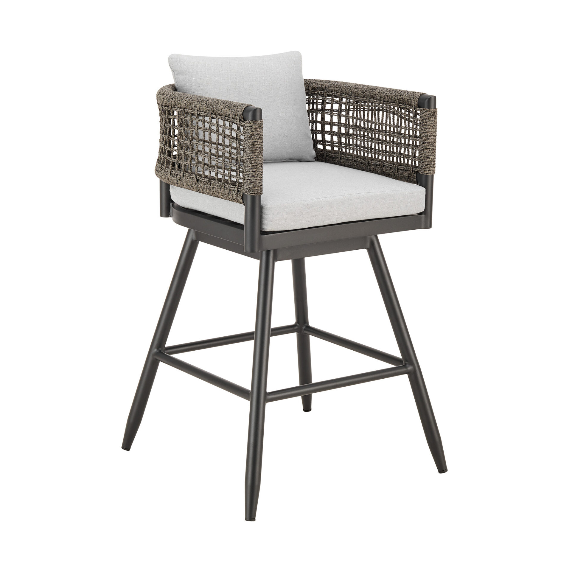 The 35-Inch Light Gray Metal Swivel Outdoor Bar Stool with Footrest is the perfect combination of style and functionality for your outdoor space. Its sleek design mimics the charm of your favorite outdoor cafes or bars, making it an ideal addition to patios, decks, or poolside areas. The swivel feature offers a wide range of mobility, while the low back and armrests ensure maximum comfort. This stool also comes with detachable cushions featuring zipper-removable covers, allowing for easy cleaning and the flexibility to change styles. The light gray fabric and round seat design create a modern, inviting aesthetic that complements any outdoor décor.