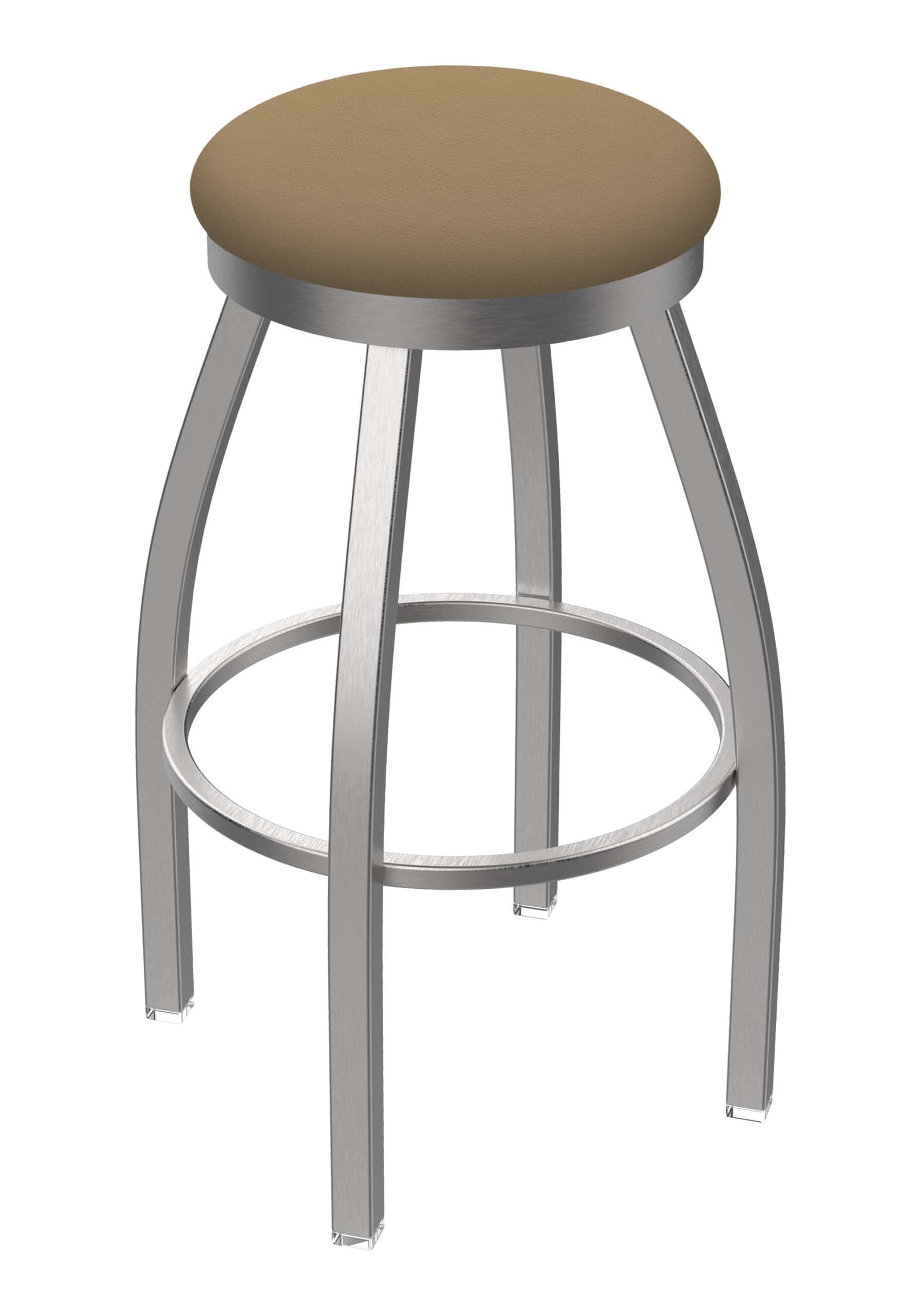 The frame is constructed from heavy-duty, 16-gauge, 1 3/4 inch 304 grade stainless steel, ensuring strength and longevity. The stainless steel finish resists chips and scratches, making it ideal for high-use environments and a perfect complement to stainless steel appliances. The seat is generously upholstered with 2 1/2 inches of high-density foam for maximum comfort. The breathable, commercial-grade Canter Sand vinyl upholstery provides a sophisticated leather-look with exceptional durability.