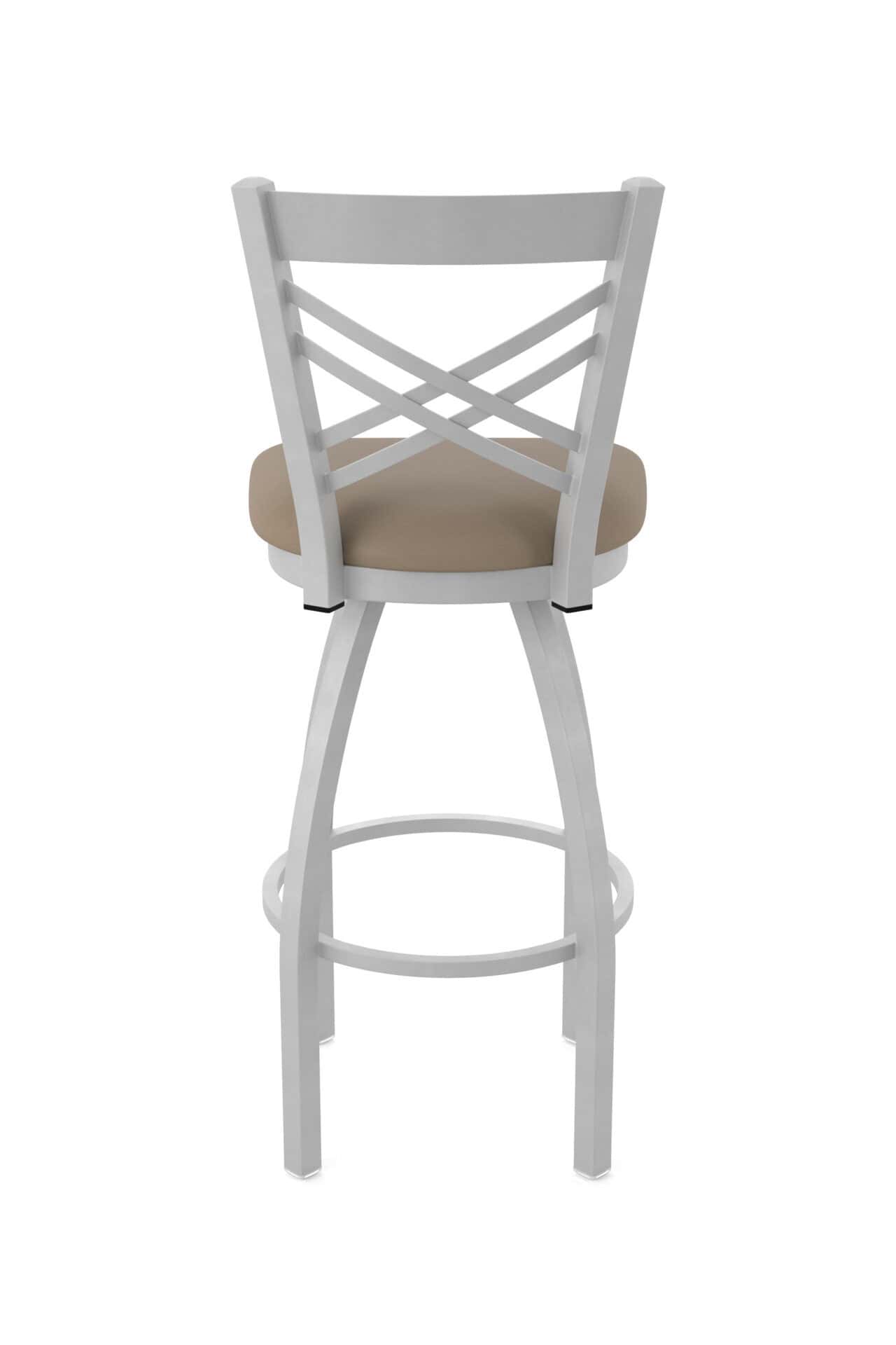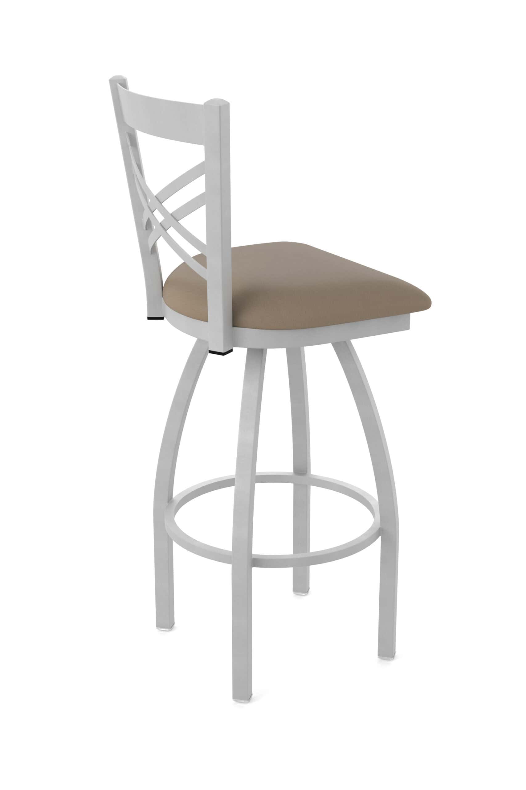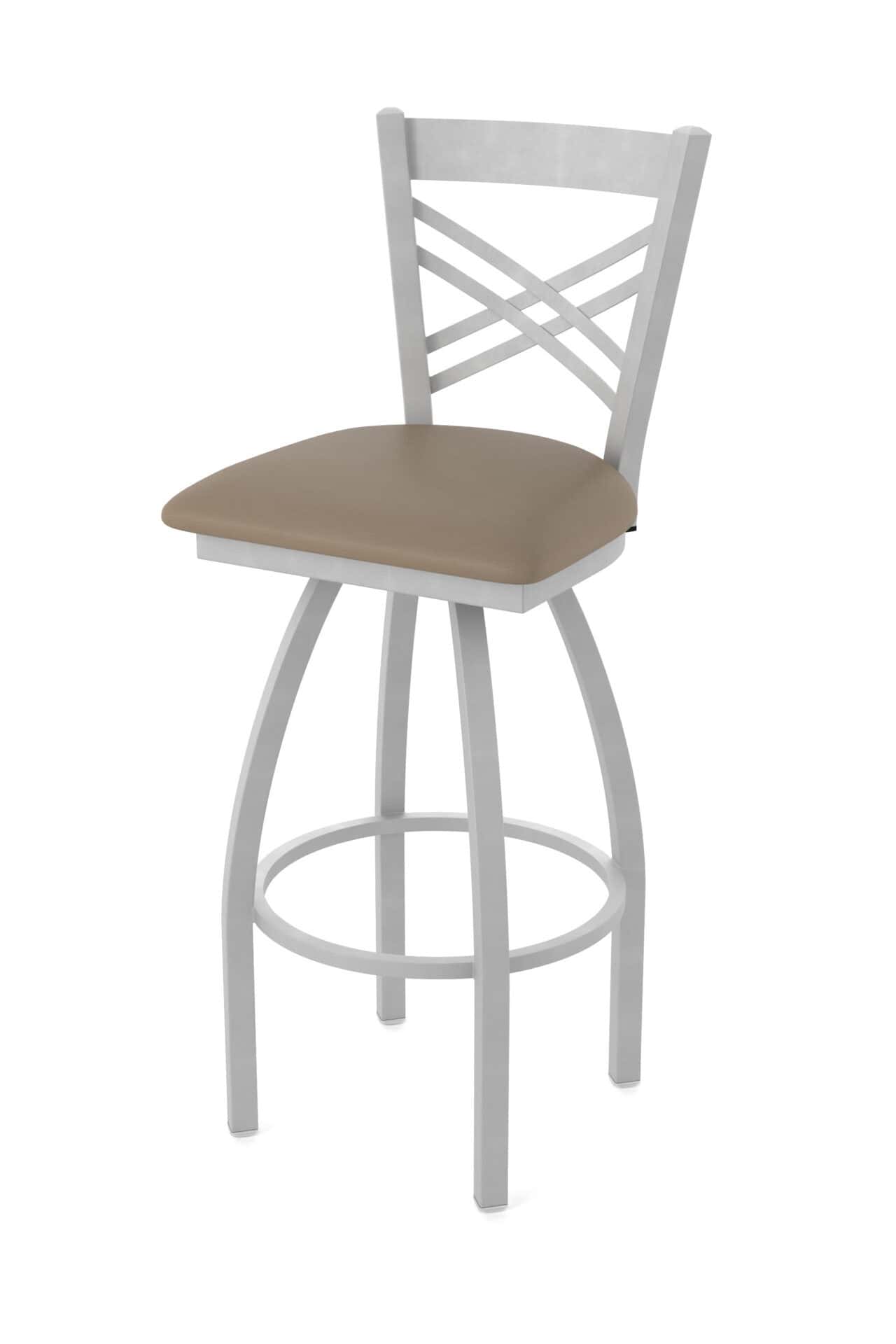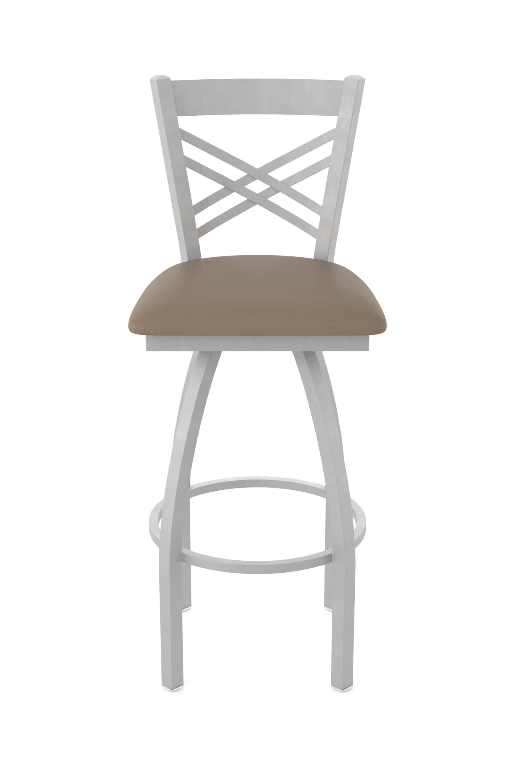 This 36-inch Cross Back Bar Stool combines style and durability, making it a perfect addition to any bar or dining area. Featuring a robust steel frame with an anodized nickel finish, a comfortable Canter Earth seat, and a stable single-ring base, this stool is built for both comfort and longevity. Enjoy exceptional back support and a timeless design that complements any décor.