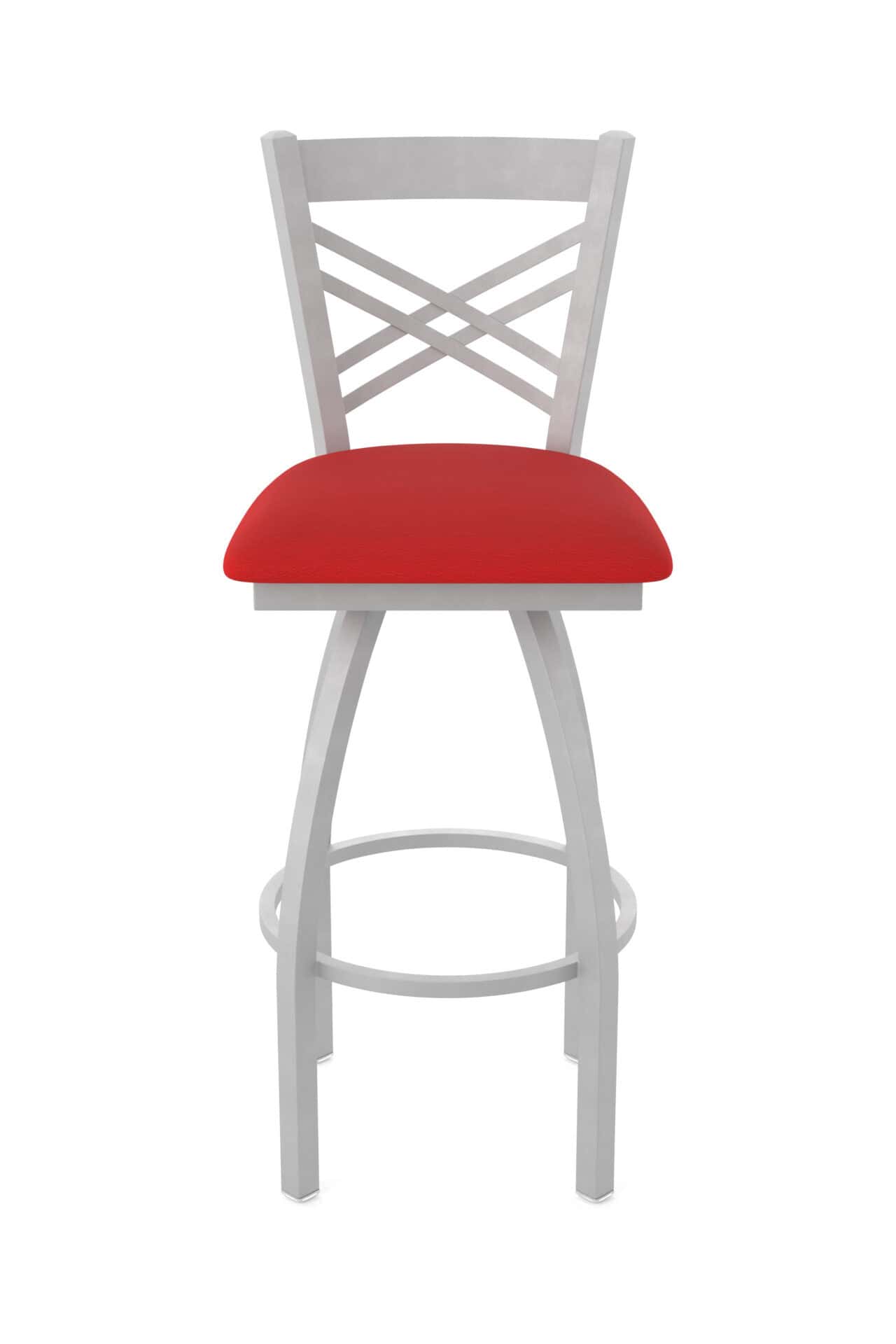 Get ready to elevate your bar area with this 36-Inch Cross Back Bar Stool! This stool combines style, comfort, and durability, making it the perfect addition to your space. With its steel frame, anodized nickel finish, Canter Red seat, and single-ring base, it’s sure to impress! Enjoy years of comfortable seating with this high-quality bar stool.