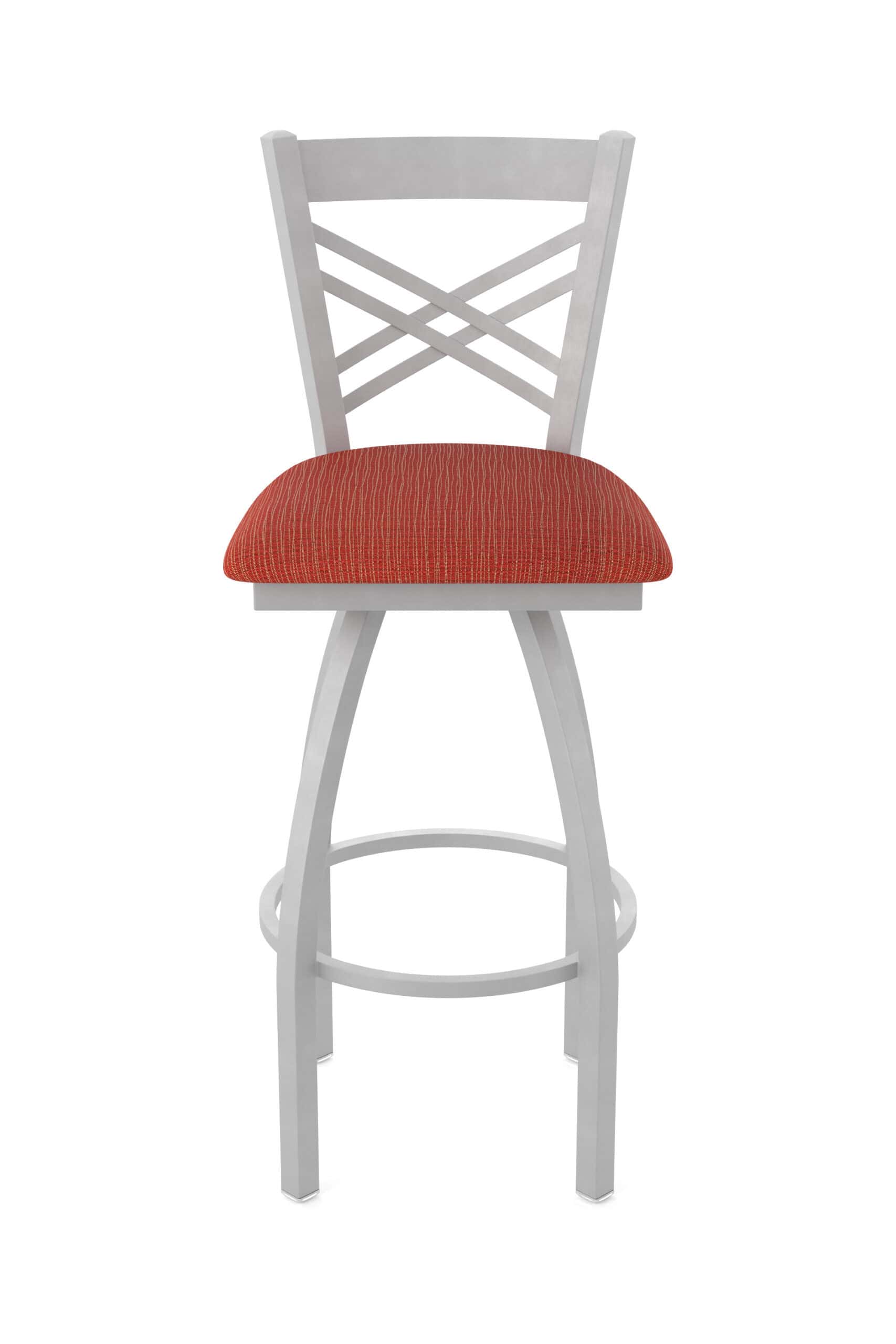 This 36-Inch Cross Back Bar Stool is the perfect addition to your bar or entertainment area. It boasts a contemporary design with a focus on comfort and durability. The steel frame ensures stability, while the Graph Poppy seat adds a pop of color and style. Enjoy years of reliable use with this exceptional bar stool! This stool provides superb back support. The powder-coated finish resists chips and scratches. The cushion seat utilizes a breathable, commercial grade fabric. At the heart of the cushion is 2 1/2 inches of highly-dense foam that provides maximum support and will not breakdown.