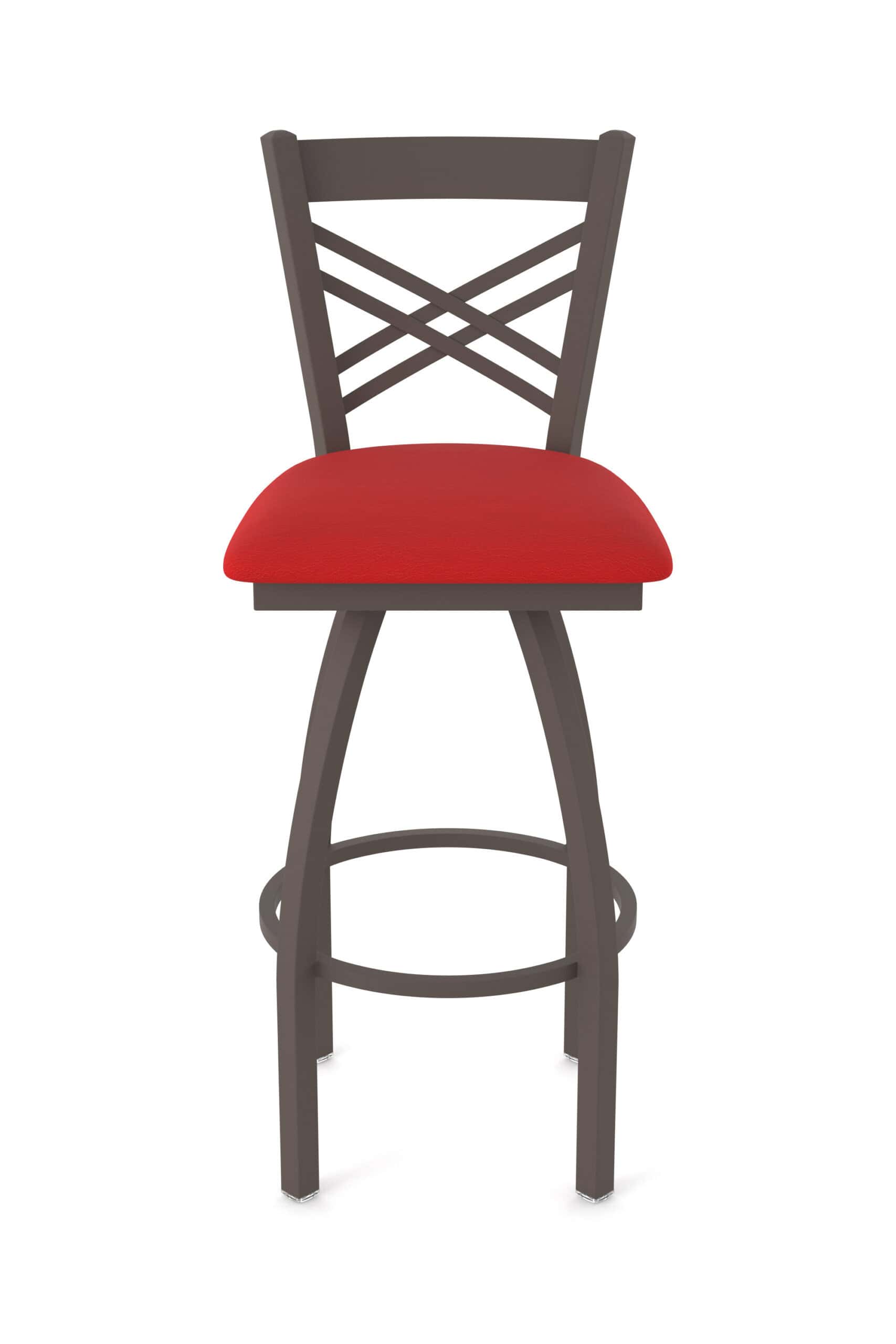 This 36-Inch Cross Back Bar Stool is designed for both comfort and durability. It features a bronze finish steel frame and a canter red upholstered seat, making it a stylish addition to any bar area. The single-ring base provides added stability, while the full-back design offers excellent support. The swivel function ensures ease of movement and accessibility.