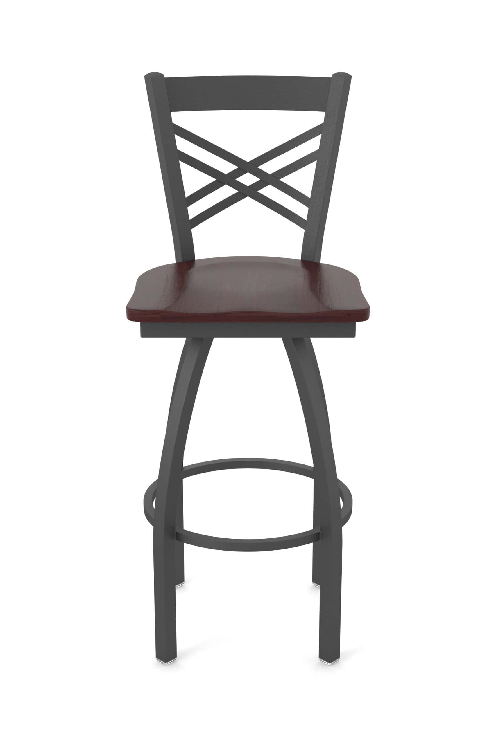 This 36-Inch Cross Back Bar Stool combines a contemporary design with exceptional comfort. Featuring a durable steel frame with a pewter finish and a dark cherry maple wood seat, this stool is perfect for your bar or dining area. Enjoy superior back support and a lifetime residential warranty on the swivel.