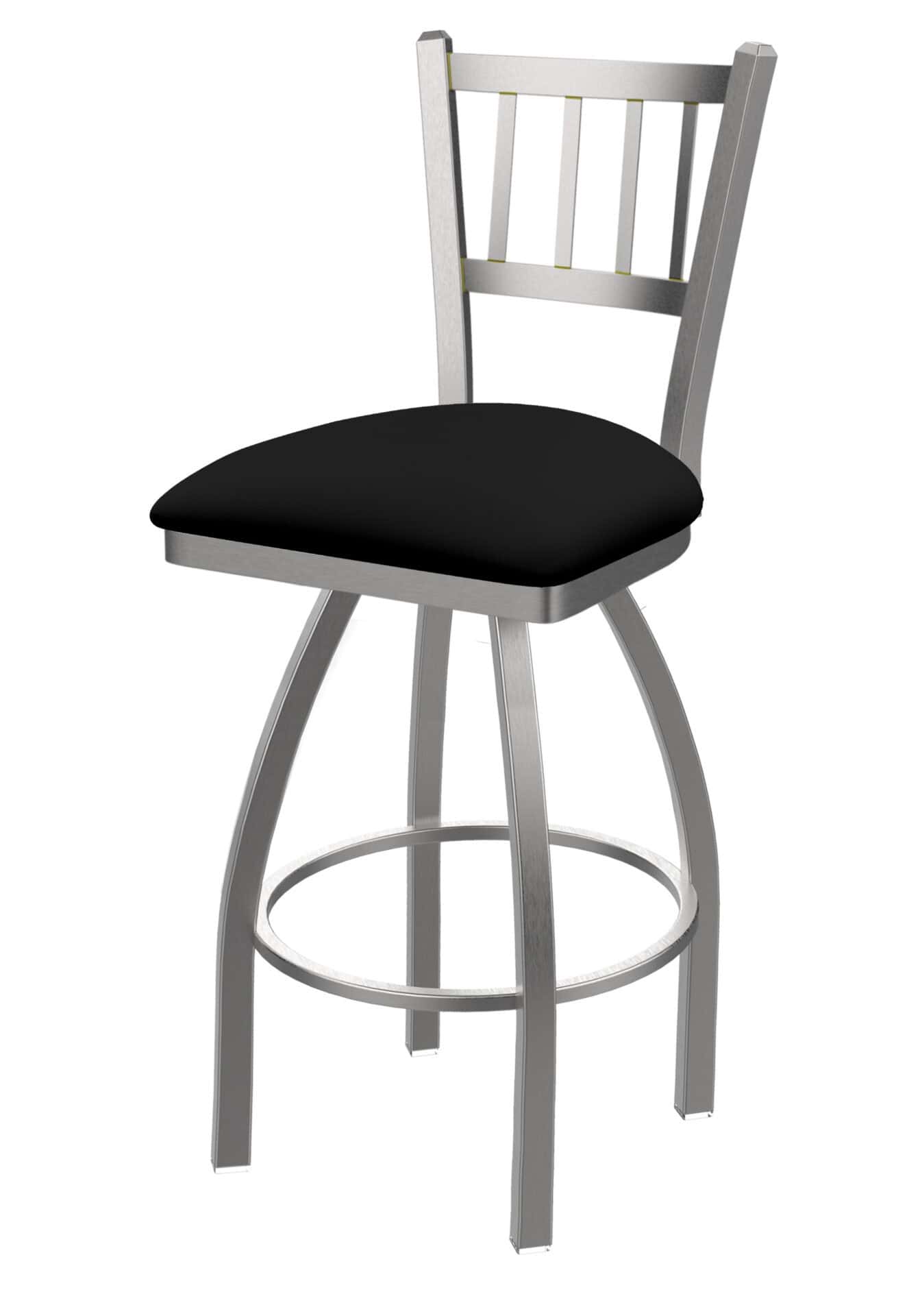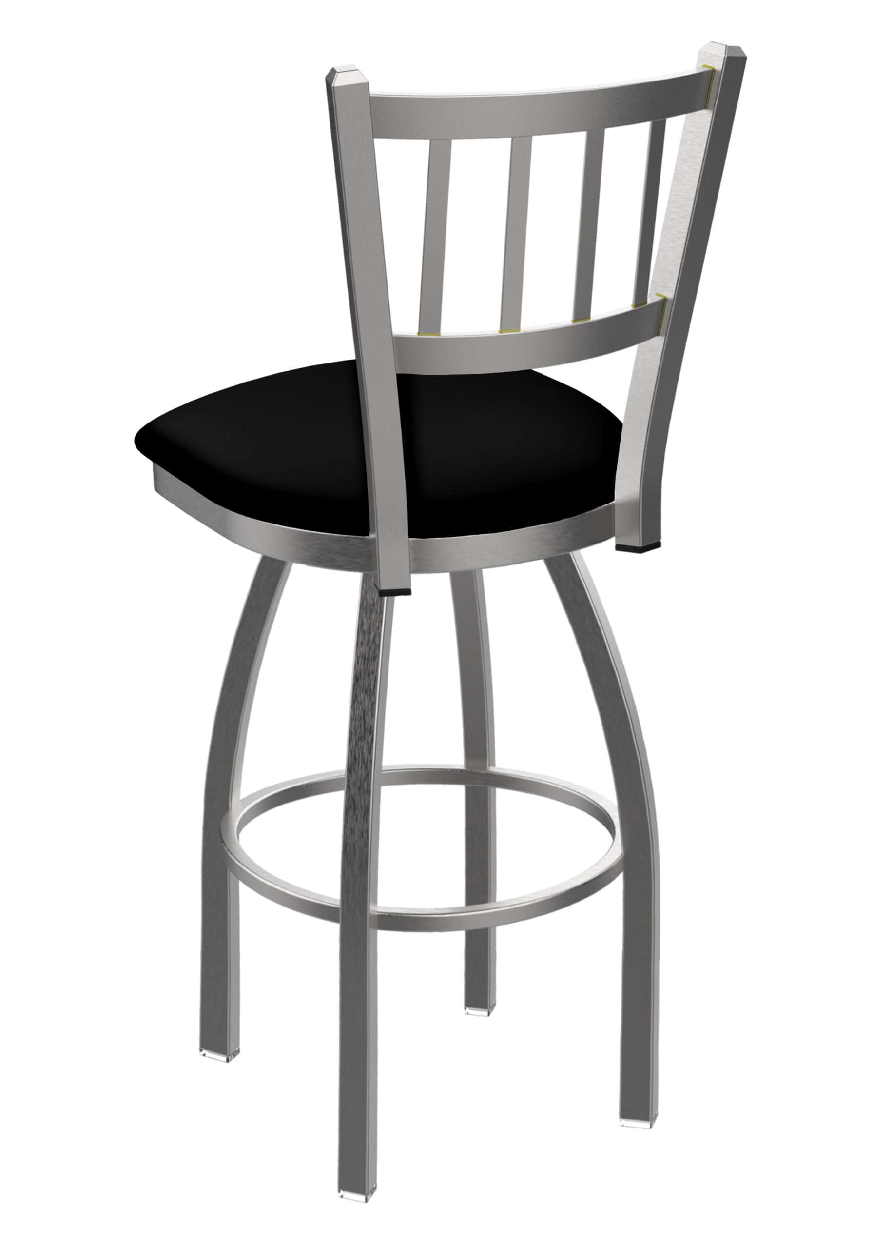 This bar stool features a commercial-grade stainless steel frame, ensuring strength and resistance to wear and tear. The generously padded seat is upholstered in durable, marine-grade black vinyl, providing both comfort and easy maintenance. The full swivel and single-ring base enhance functionality and add a touch of sophistication to any space.