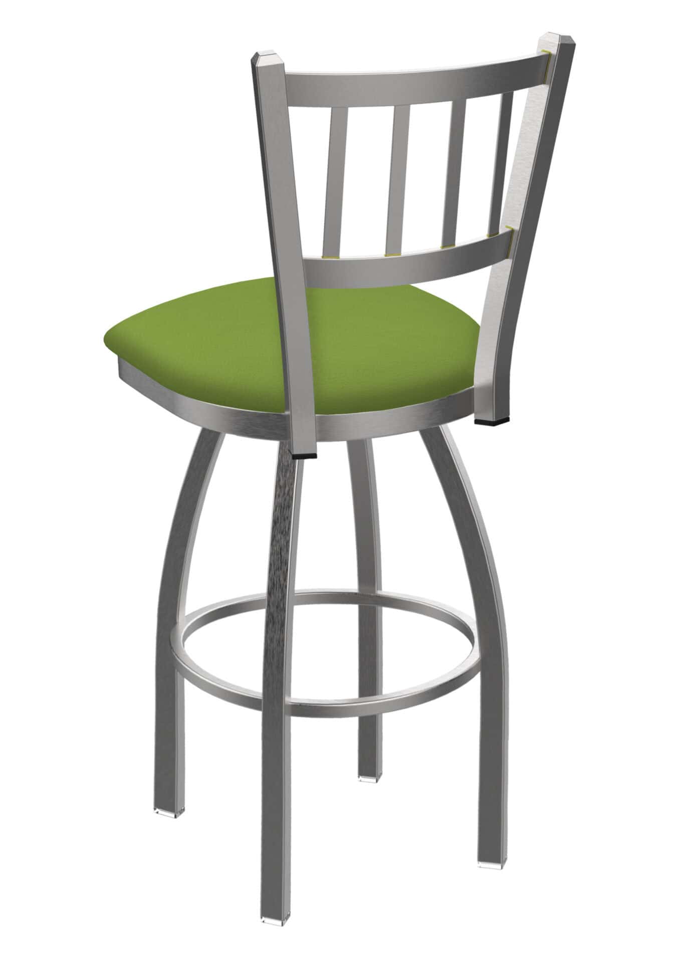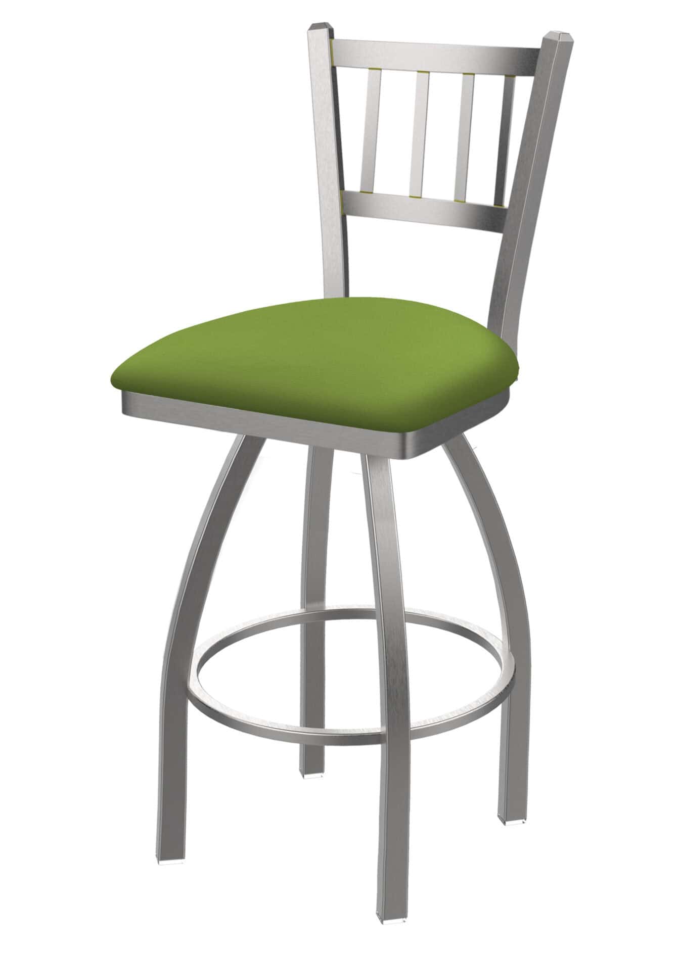 Elevate your bar area with this 36-Inch Jailhouse Back Bar Stool. Designed for both style and comfort, it features a durable stainless steel frame, a vibrant Canter Kiwi Green seat, and a sturdy single-ring base. Enjoy exceptional back support and a smooth swivel for a premium seating experience. This bar stool is built to last and impress.