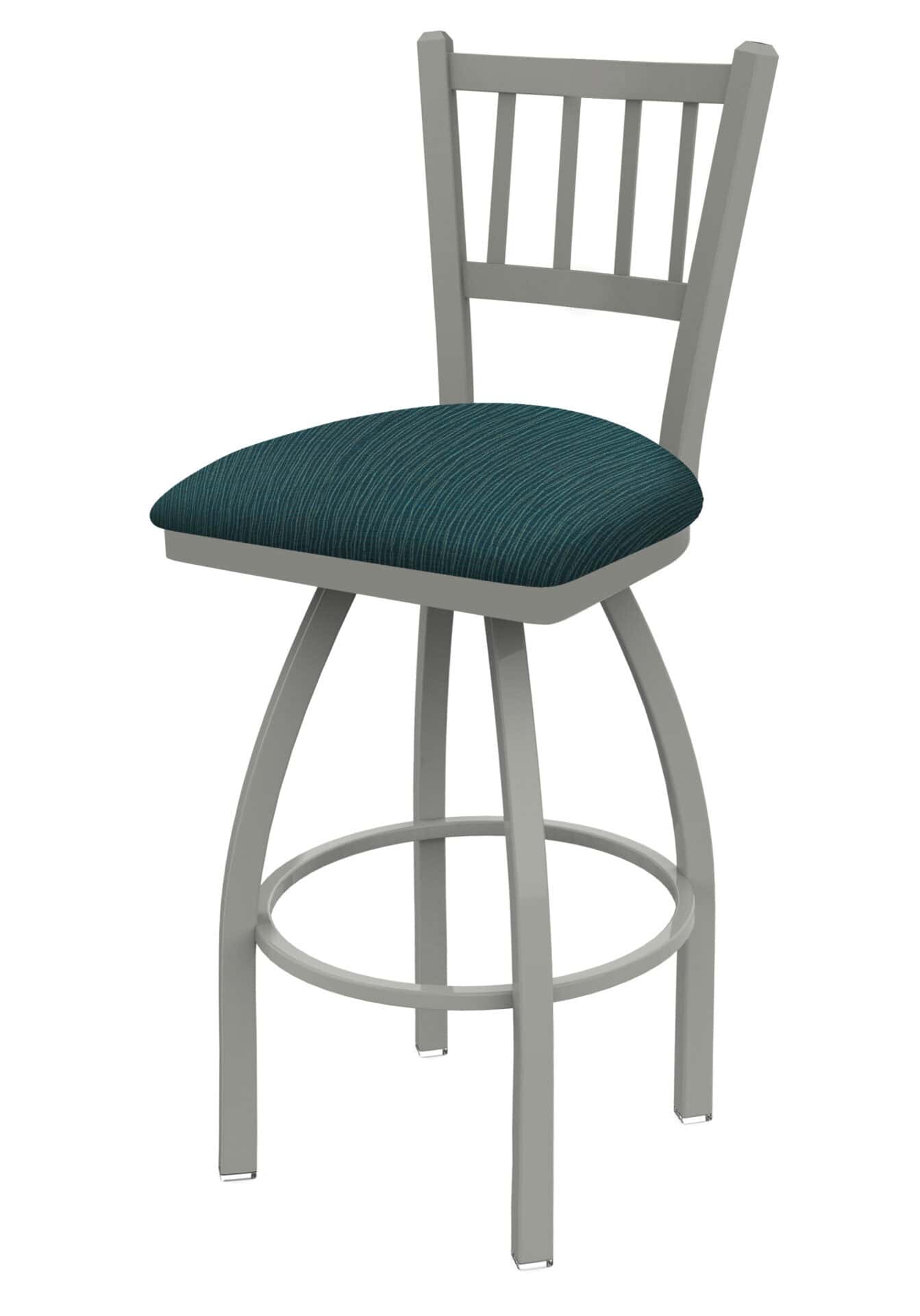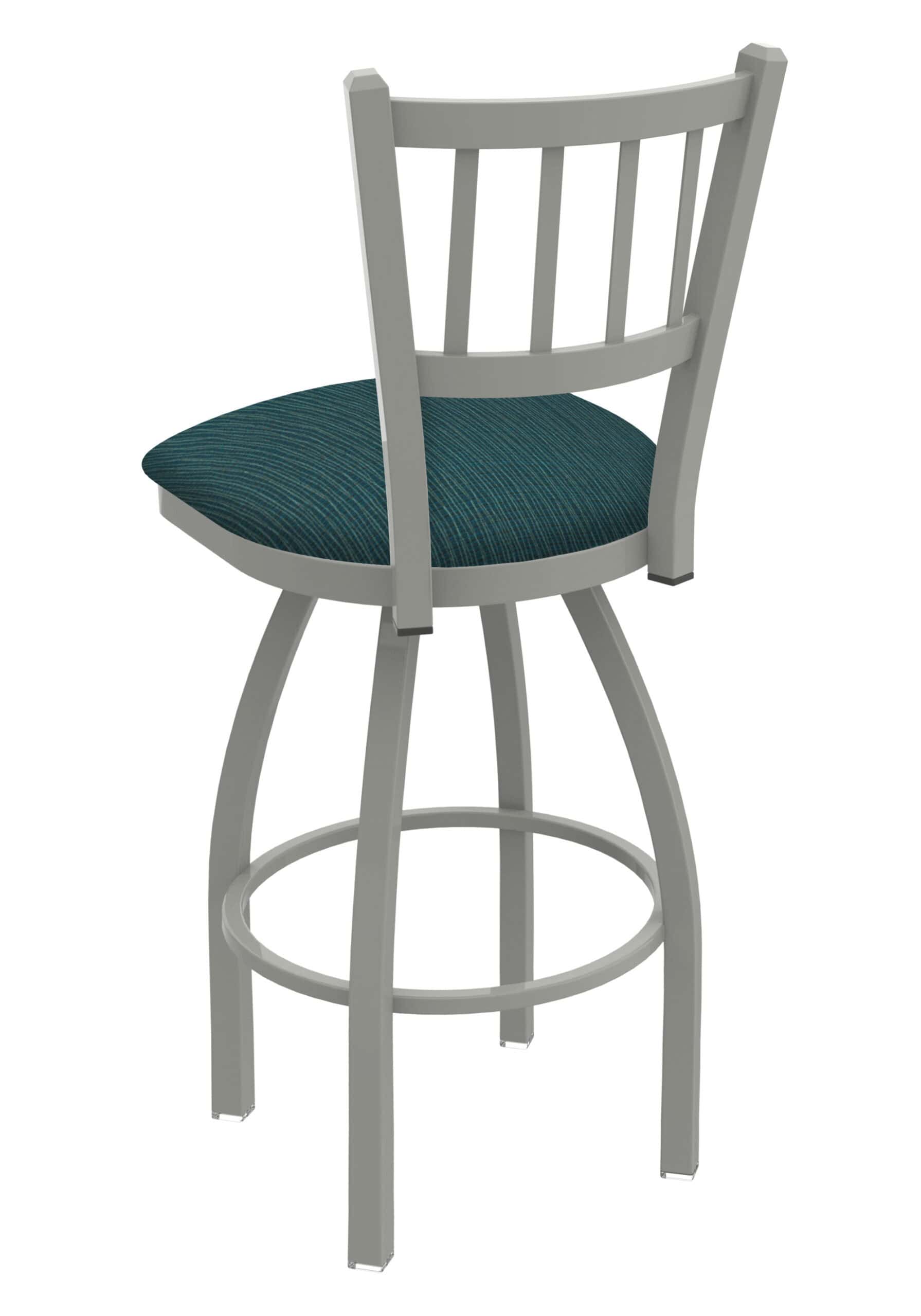 This 36-Inch Jailhouse Back Bar Stool combines classic design with robust construction, perfect for any bar or entertainment area. Its steel frame, anodized nickel finish, and comfortable Graph Tidal seat provide both style and durability. The swivel feature ensures ease of movement, while the single-ring base adds stability.