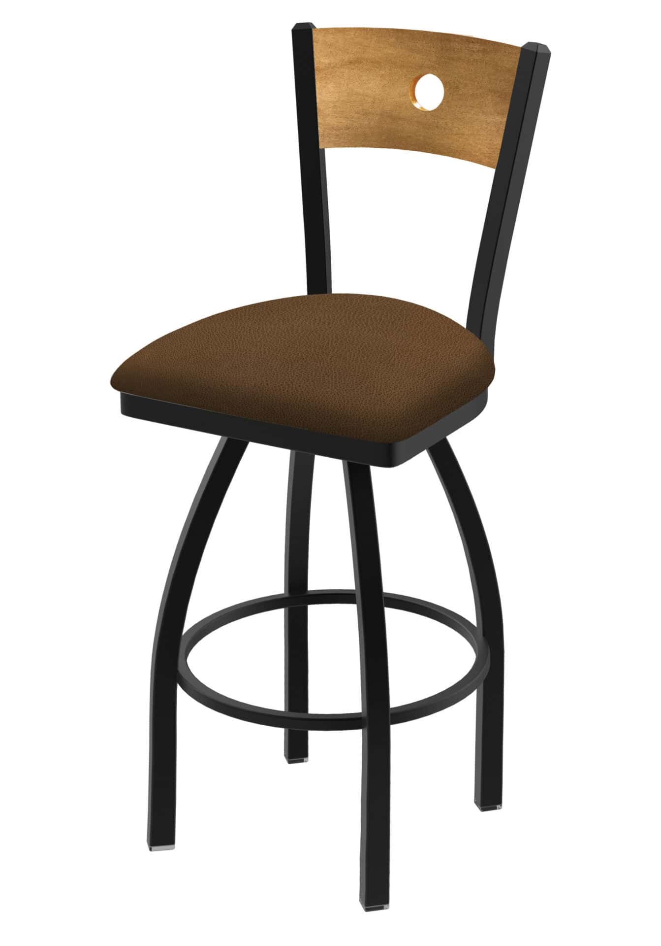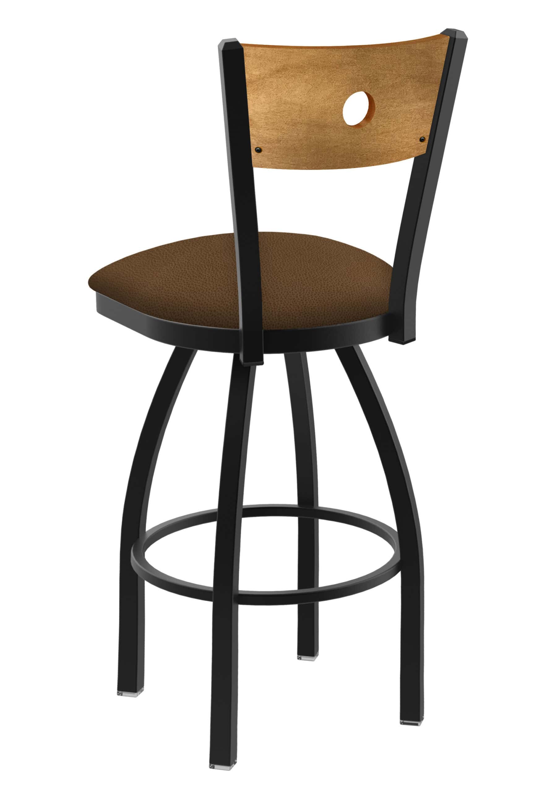 This swivel bar stool features a stylish wood back stained in medium, a heavy-duty steel frame with a black wrinkle powder-coated finish, and a generously upholstered padded seat. The 52 ball bearing swivel ensures smooth rotation, while the durable construction guarantees long-lasting performance.