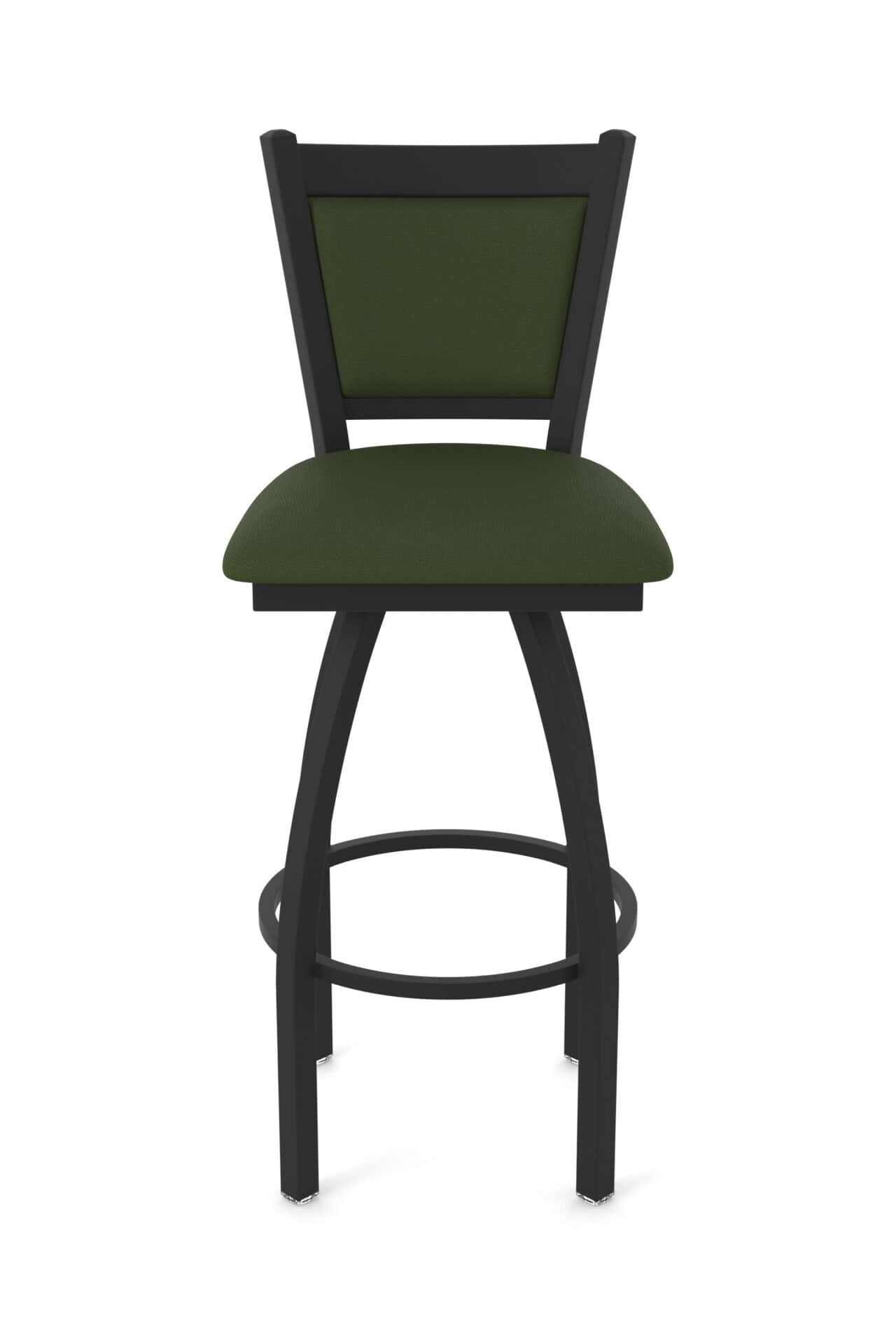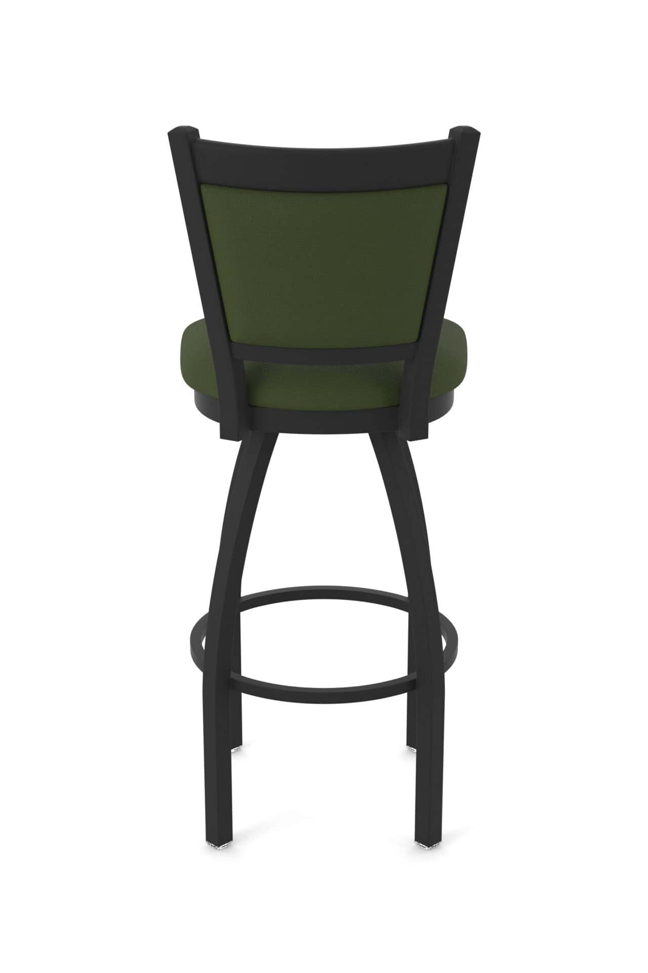 The stool features a contemporary base frame constructed of 16-gauge, 1.25-inch tube steel with solid MIG-welded joints for superior strength and durability. The black wrinkle powder coat finish resists rust, chips, and abrasions, ensuring long-lasting beauty. The Canter Pine 2.5-inch cushion seat provides maximum support with high-density foam and commercial-grade upholstery. A unique, padded, double-upholstered back is contoured for enhanced comfort, providing a practical design aesthetic. The swivel mechanism is powder-coated and features 52 stainless steel ball bearings for smooth and consistent rotation.