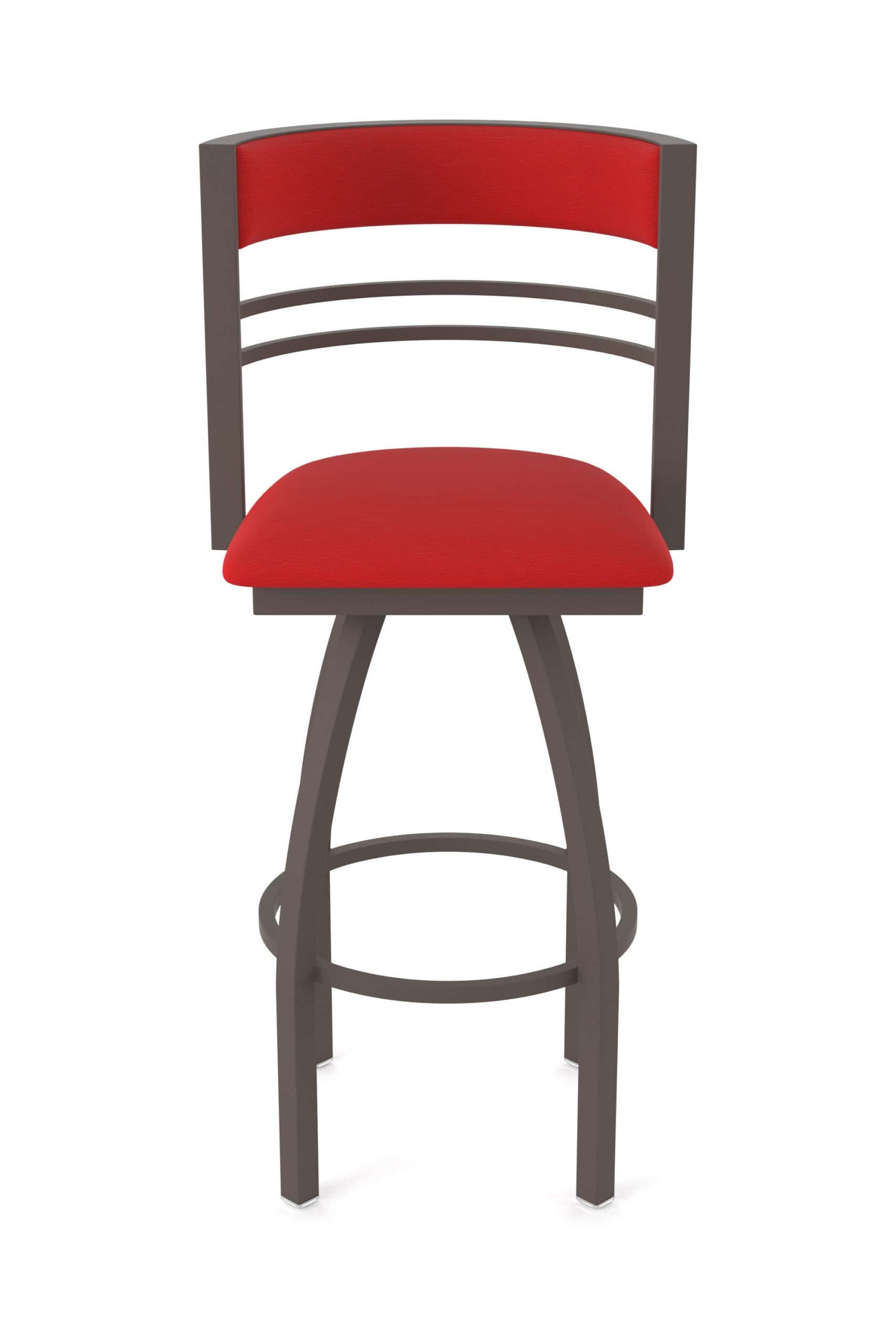 Experience the perfect blend of style and support with this bar stool. The tall, curved slat back offers enhanced comfort, while the single-ring base provides stability. The bronze finish adds a touch of sophistication to any space. Customize your seat with a variety of vinyl and fabric options for a personalized look.