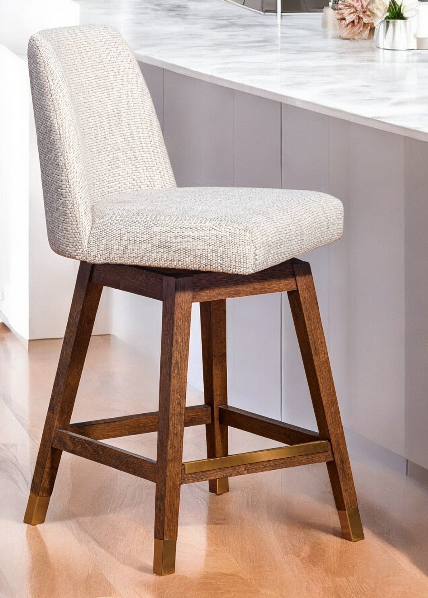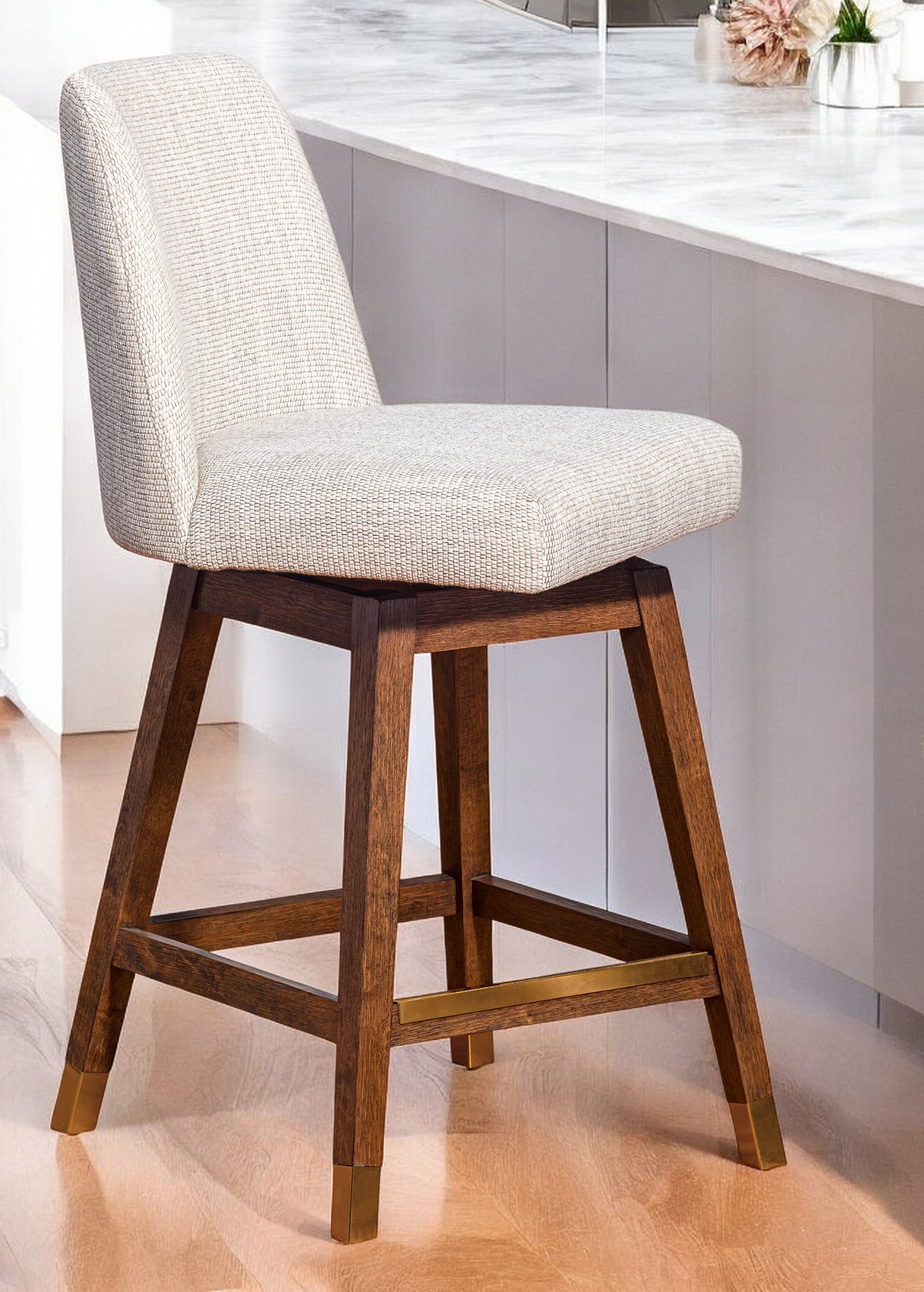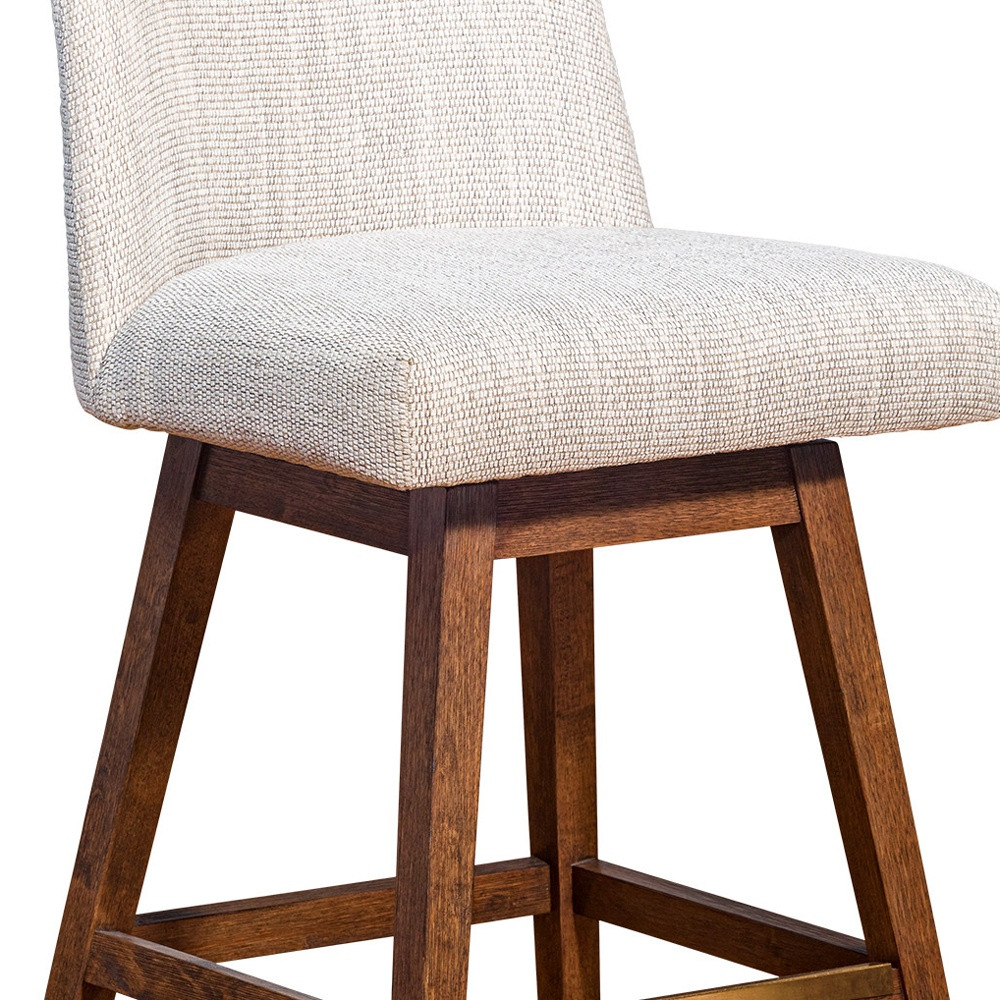 The 37.5-Inch Beige and Brown Swivel Counter Height Bar Stool is a stylish and functional addition to your space, perfect for creating a cozy and inviting atmosphere similar to your favorite cafes or pubs. Featuring a beige upholstered seat that contrasts beautifully with the sturdy brown solid wood base, this bar stool is designed to provide both comfort and durability. The swivel functionality ensures easy mobility, while the footrest offers additional support, making it an ideal choice for any home or entertainment area.
