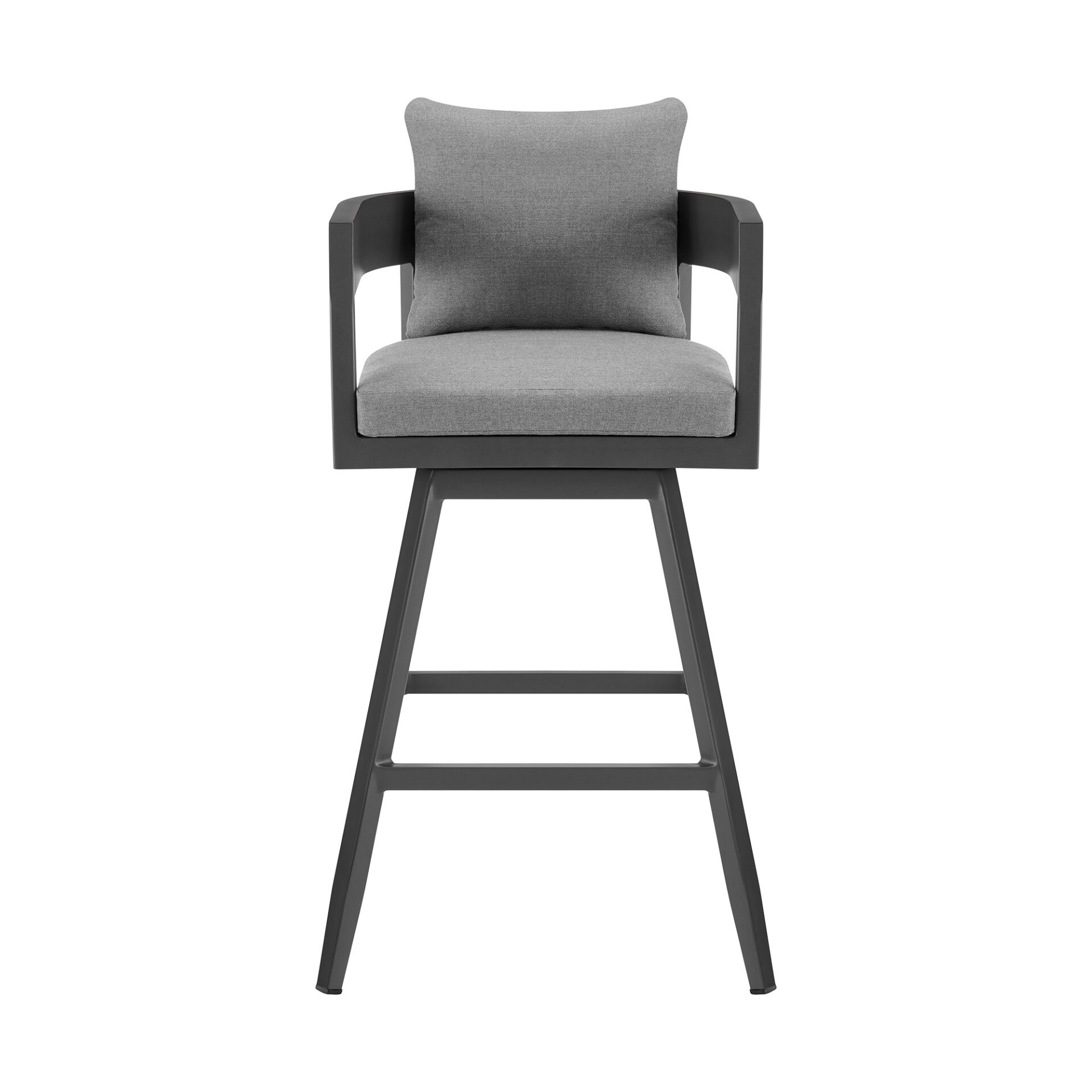 Bring a trendy bar vibe to your outdoor space with the stylish and functional 39-Inch Dark Gray Metal Swivel Outdoor Bar Stool With Footrest. The enchanting dark gray finish adds a sophisticated touch, while the detachable cushions with zipper-removable covers ensure easy cleaning and maintenance. Designed with a low backrest and round-shaped seat, this bar stool combines comfort and modern aesthetics. Armrests and a built-in footrest provide additional support and relaxation, making it an ideal choice for outdoor gatherings on your deck, patio, yard, or poolside. Experience flexible seating with its swivel functionality that offers a wide range of mobility.