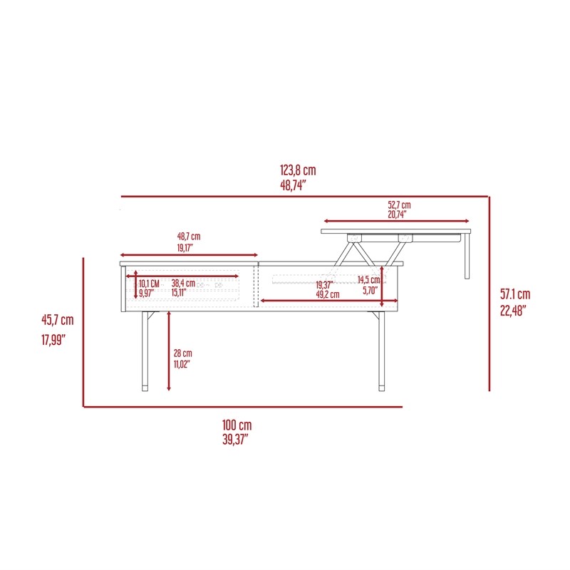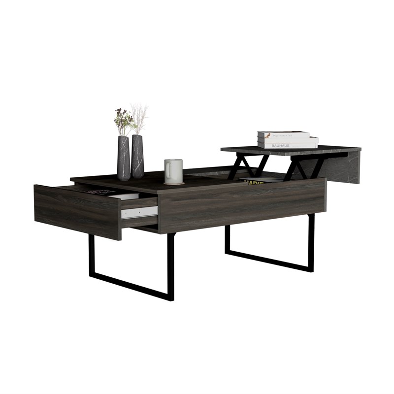 Stylish and sturdy, the 39-Inch Espresso Black Lift Top Coffee Table With Drawer is an elegant addition to any living room, bedroom, or office. This coffee table features a sleek espresso-finished manufactured wood top, complemented by a durable black metal base. Its modern design and practical functionality make it more than just a table—it offers both fashionable and functional storage options. Whether used as a centerpiece in your living space or as an accent piece, this coffee table is designed to meet your style and storage needs.