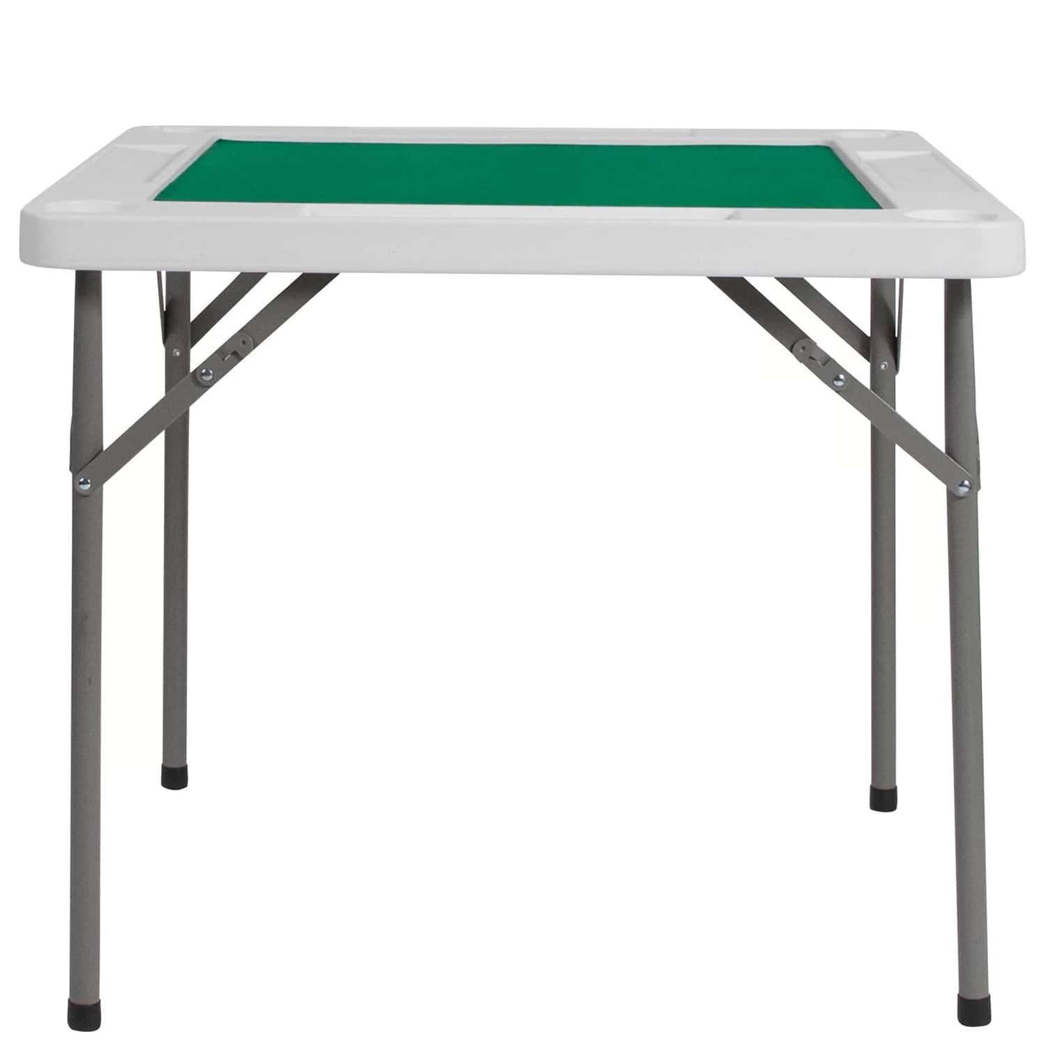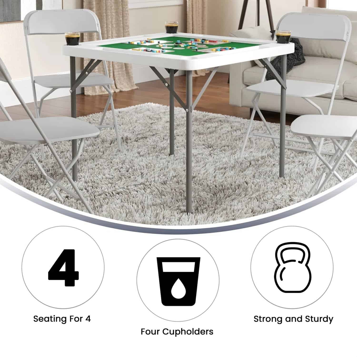 Enhance your gaming experience with the 4-Player Folding Poker Table with Green Felt and Cup Holders. Perfect for game nights, this square table comfortably seats four players and features a durable green felt playing surface, built-in cup holders, and a card placeholder with a lip for added convenience. Its foldable design ensures easy storage and portability, while the sturdy frame and protective floor caps provide durability and stability.