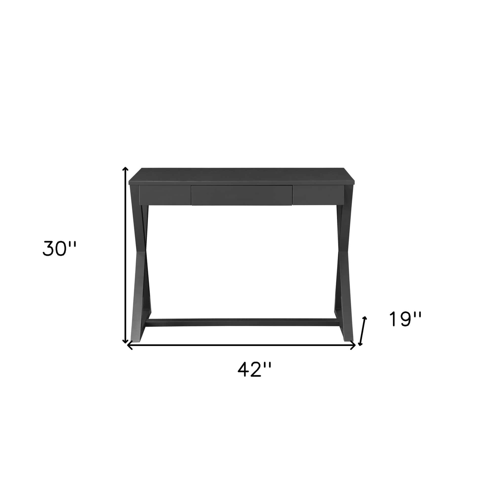Bring a touch of classic style to your living room, home office, or bedroom with this 42-inch blue writing desk. Designed to fit seamlessly into most spaces, this rectangular desk provides a practical and fashionable accent while transforming your room into a productive workspace. The desk is made for convenience and versatility, featuring an assembly option that allows it to be configured in either direction. A single drawer offers hidden storage for your office essentials, ensuring a clutter-free work area. Built for durability, comfort, and efficiency, this sturdy desk is an excellent addition to any workspace.