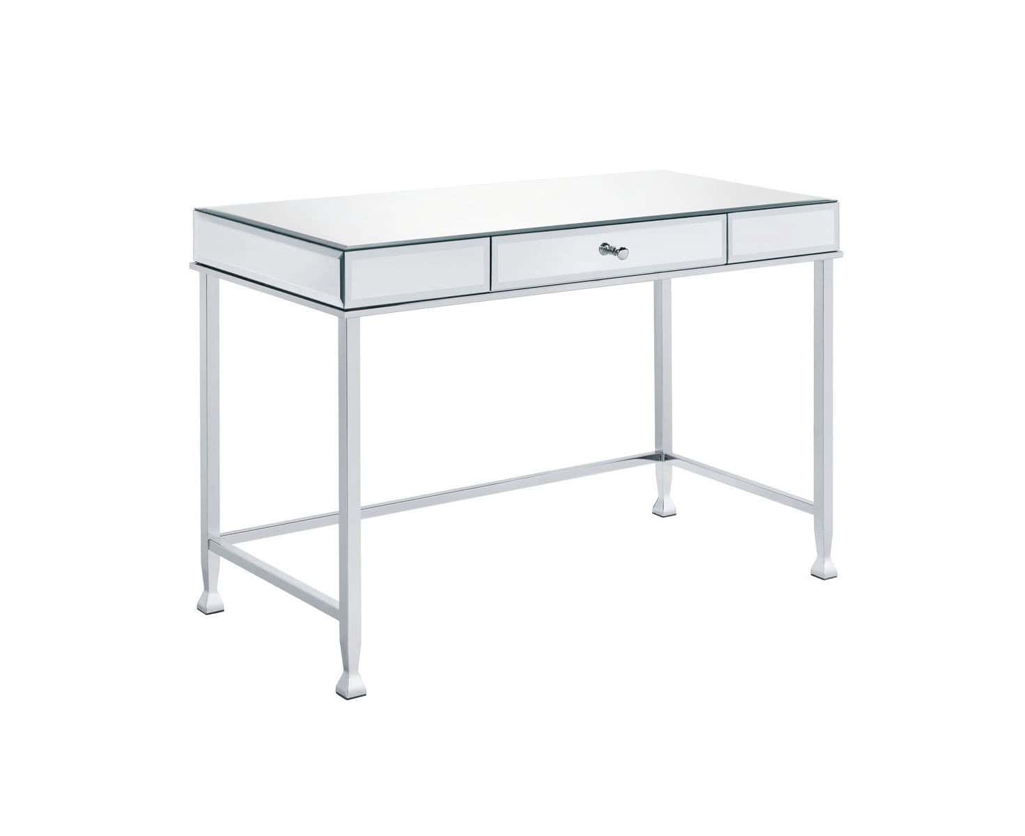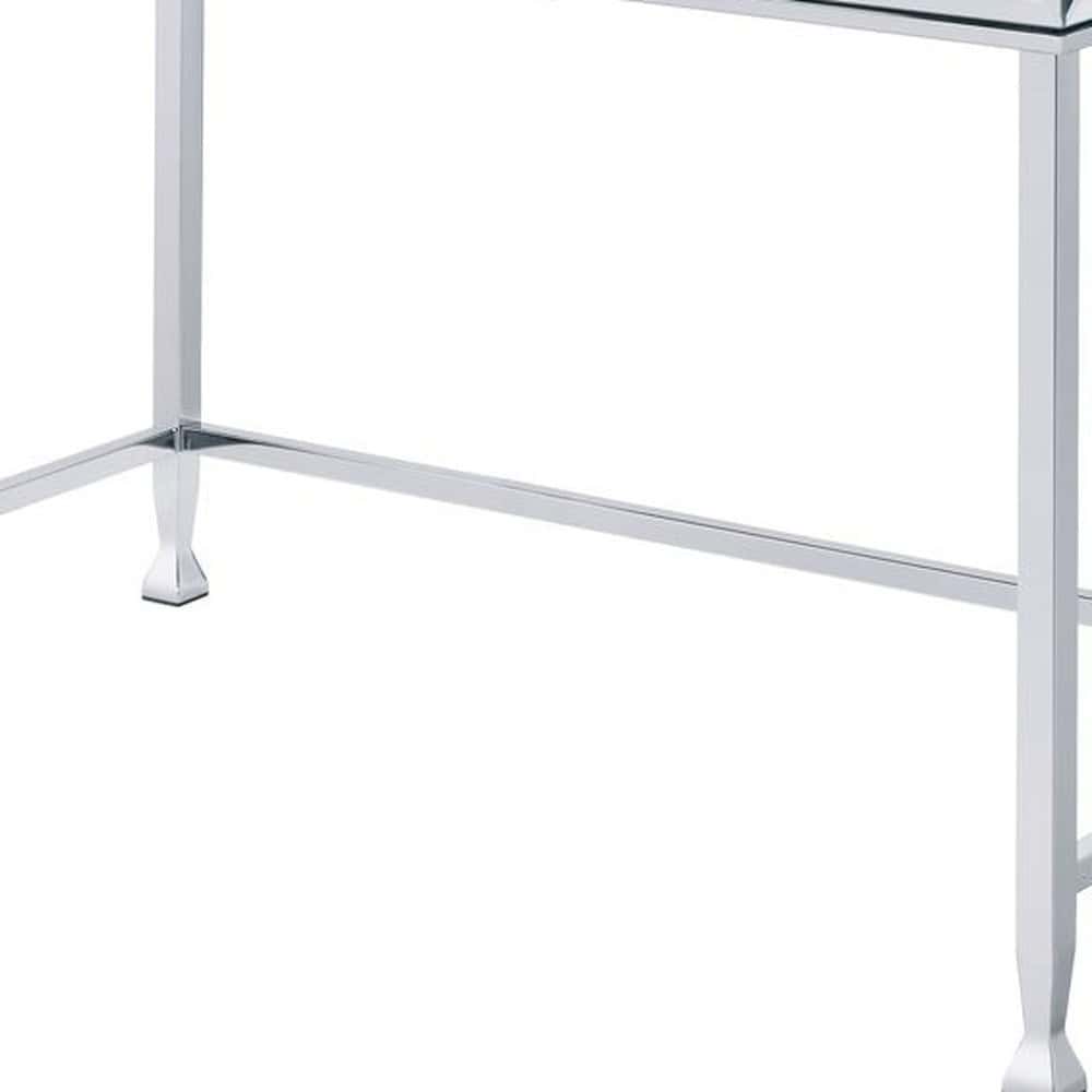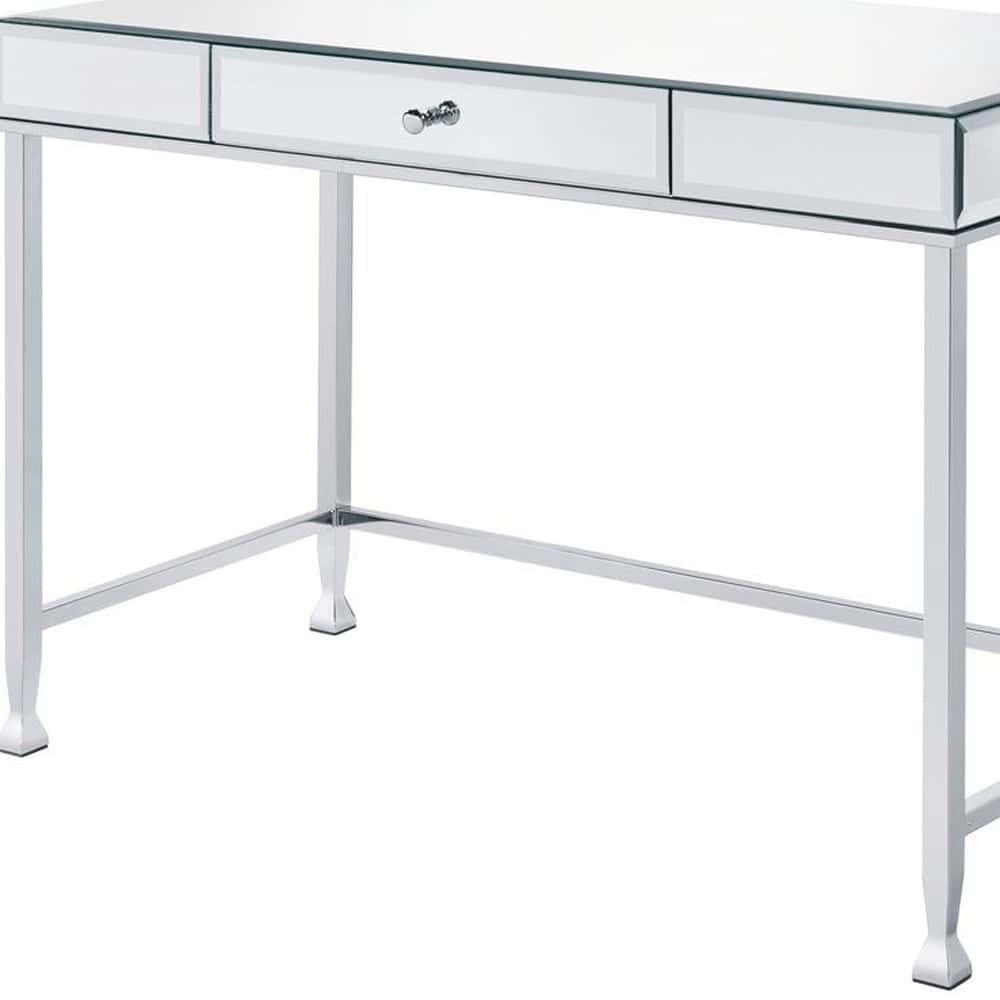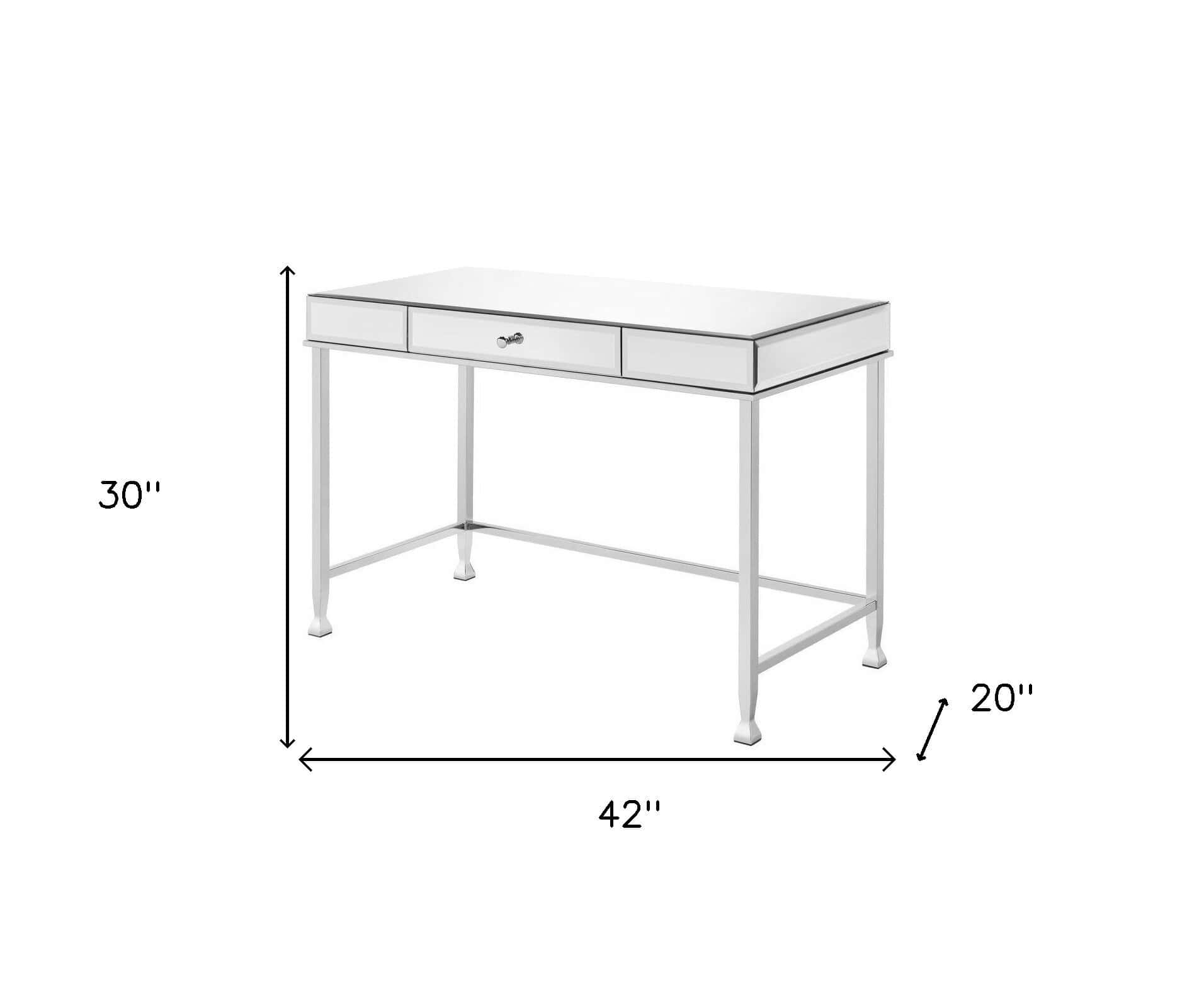 The 42-Inch Clear Mirrored Writing Desk with Storage Drawer adds timeless elegance and functionality to your living room, home office, or bedroom. With its sleek mirrored surfaces and a modern rectangular design, this desk seamlessly blends style and practicality. It features a single drawer for hidden storage and can be assembled in either direction, offering versatility to fit your specific needs. Built for durability, this sturdy desk ensures comfort and efficiency for years to come.