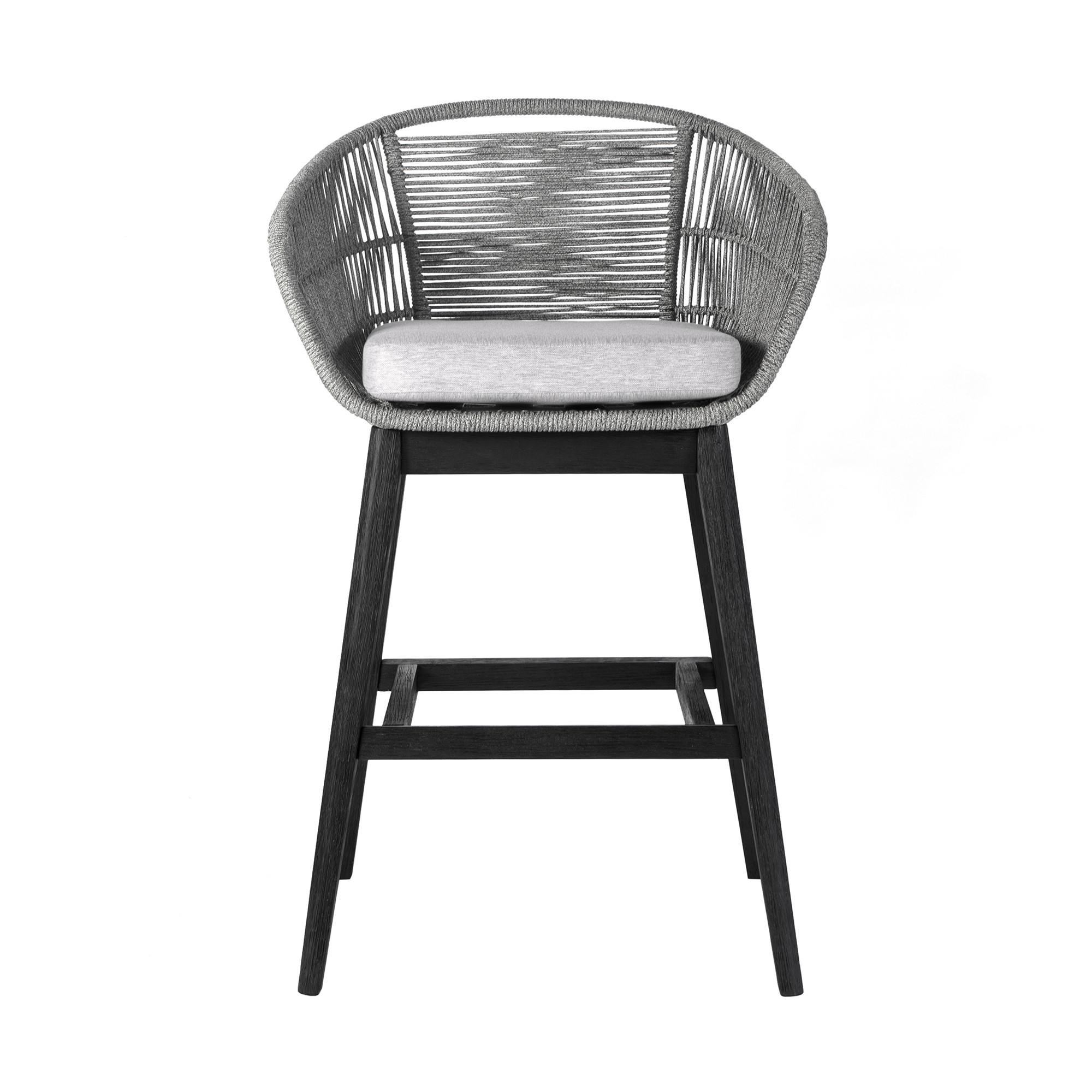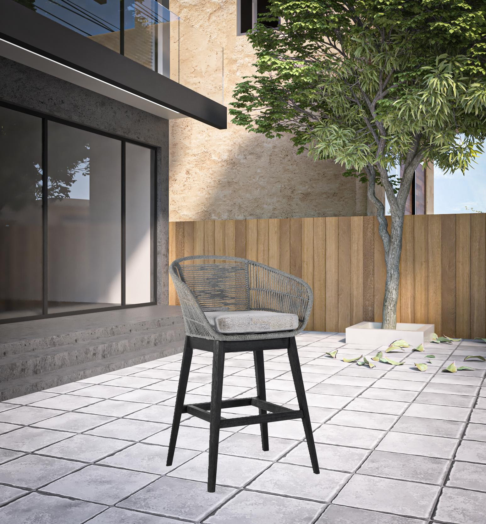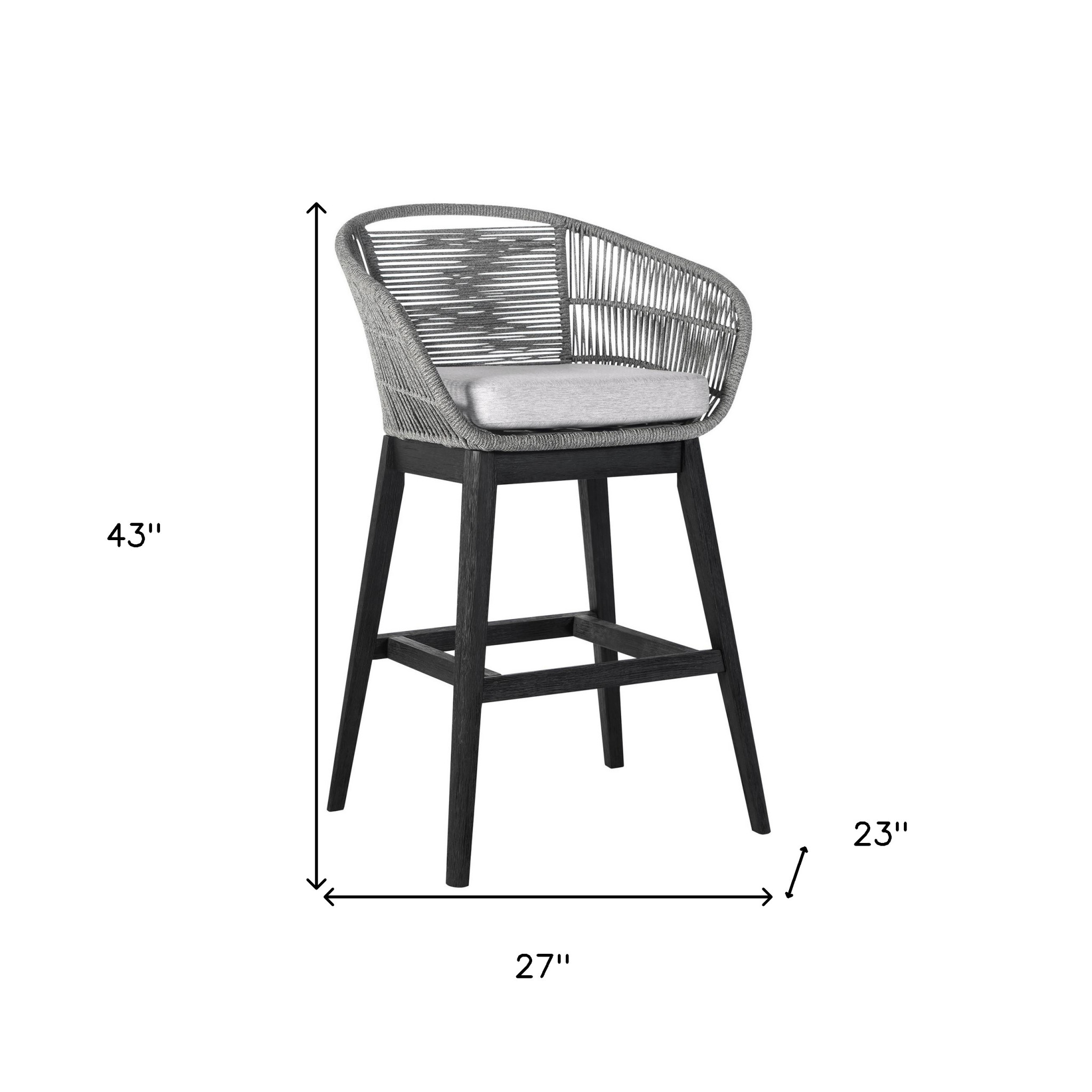 Bring a trendy bar vibe to your space with the 43″ Light Gray Solid Wood Outdoor Bar Stool with Footrest. This stylish and functional bar stool features a durable eucalyptus wood construction and a sophisticated black and gray frame, making it the perfect addition to your outdoor gatherings. Equipped with a comfortable upholstered seat, armrests, and a footrest, it ensures both style and relaxation. The detachable light gray cushions provide easy cleaning and customization, allowing you to maintain a fresh and personalized look. Ideal for your deck, yard, patio, or poolside, this bar stool combines comfort, convenience, and elegance in one chic package.