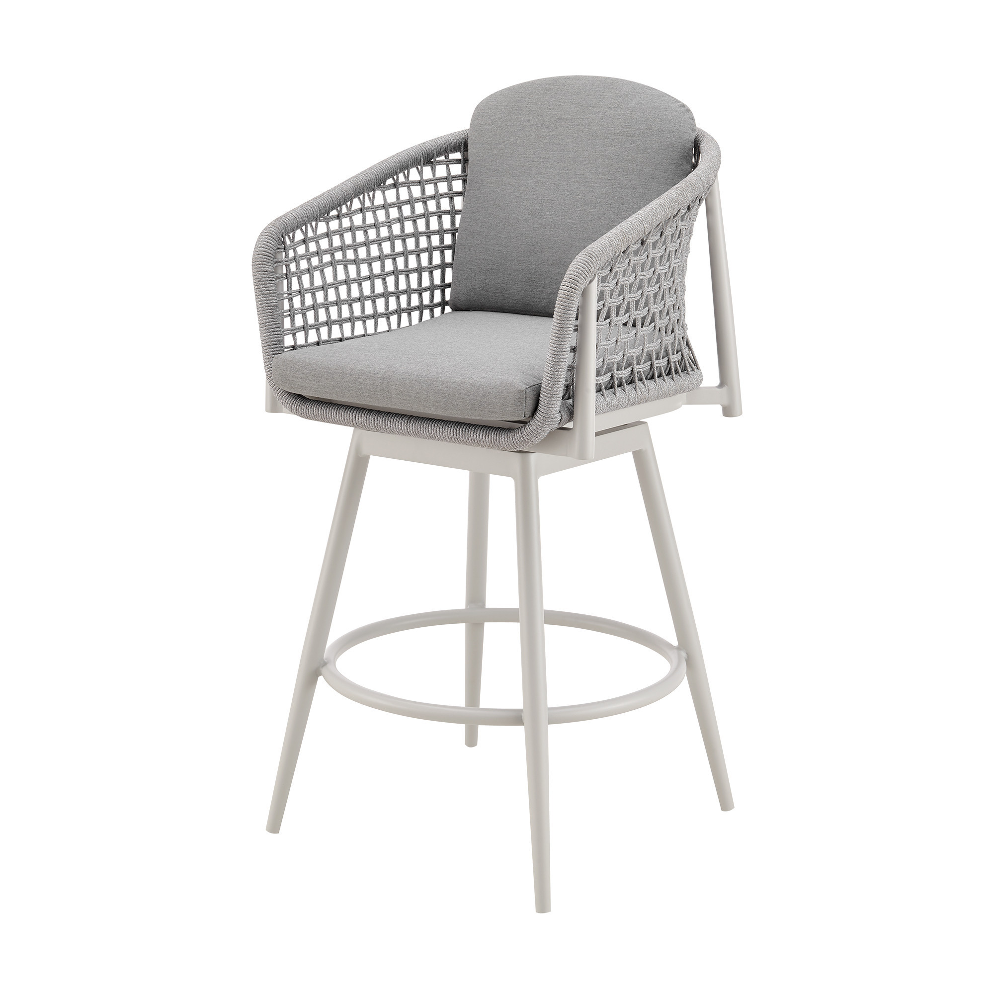 Bring a trendy bar vibe to your outdoor space with the 44″ Light Gray Swivel Outdoor Bar Stool with Footrest. This stylish bar-height chair combines functionality and comfort, featuring a durable metal frame in an elegant light gray finish. Designed with a swivel function for easy mobility and a footrest for added convenience, this stool is perfect for outdoor gatherings on your deck, patio, yard, or poolside. The detachable cushions with zipper covers allow for easy cleaning or replacement, ensuring your seating always looks its best. With a full back, armrests, and a rounded seat, this bar stool offers superior comfort and a chic design that complements any outdoor setting.