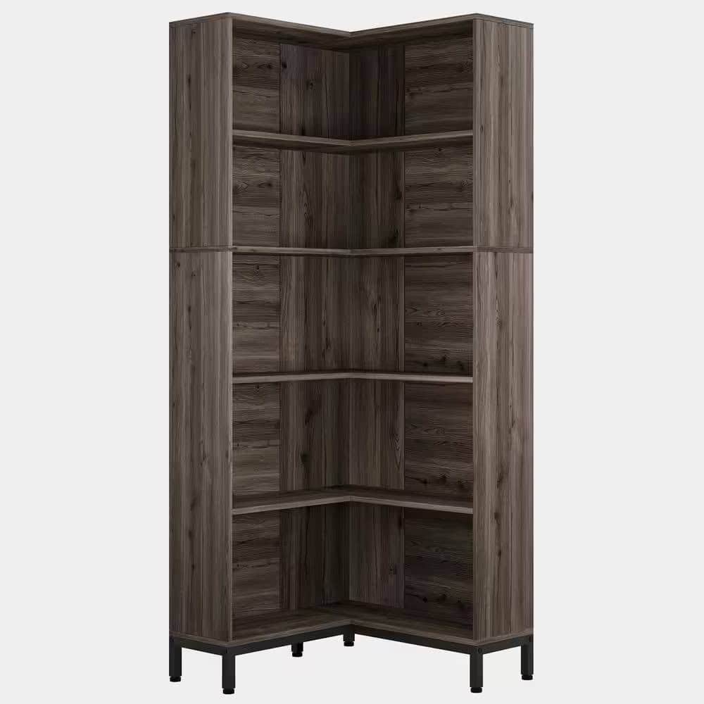 The 71 Inch Dark Gray Wood Corner Bookcase with Open Shelves is an ideal solution for maximizing corner spaces in your home or office. Designed with a practical 90° angle and an open shelf layout, this bookcase offers both functionality and style. Its compact design fits snugly into corners while providing ample storage options for books, plants, collectibles, and more. The combination of a natural wood finish and metal frame creates a vintage yet modern aesthetic that complements various décor styles. Additionally, the sturdy construction ensures durability, while the inclusion of a back panel helps keep dust away from displayed items.
