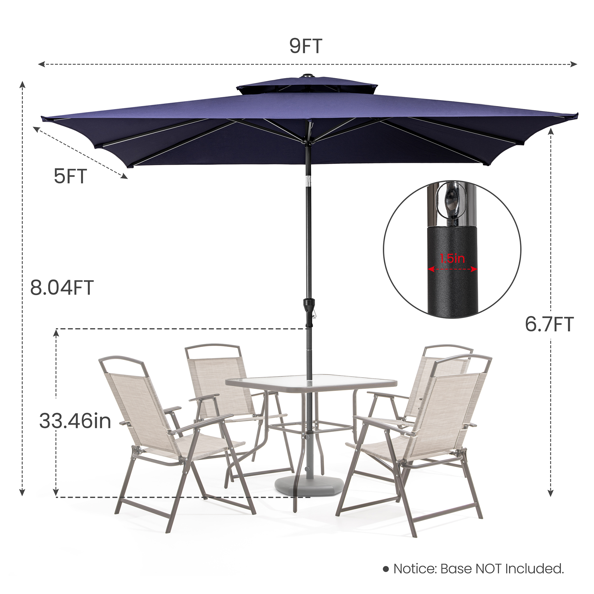 Enhance your outdoor space with the stylish and functional 9′ Navy Blue Rectangular Tilt Market Patio Umbrella. Designed with inspiration from cafes and markets, this umbrella combines elegance with practicality. Made from premium quality polyester, it ensures durability and vibrant color that will brighten up your patio or yard. Its crank lift mechanism makes it easy to open and close, while the sturdy aluminum frame and rust-free pole guarantee lasting performance. This umbrella is perfect for creating a shady oasis on your patio, porch, yard, or poolside, allowing you to enjoy the outdoors comfortably.