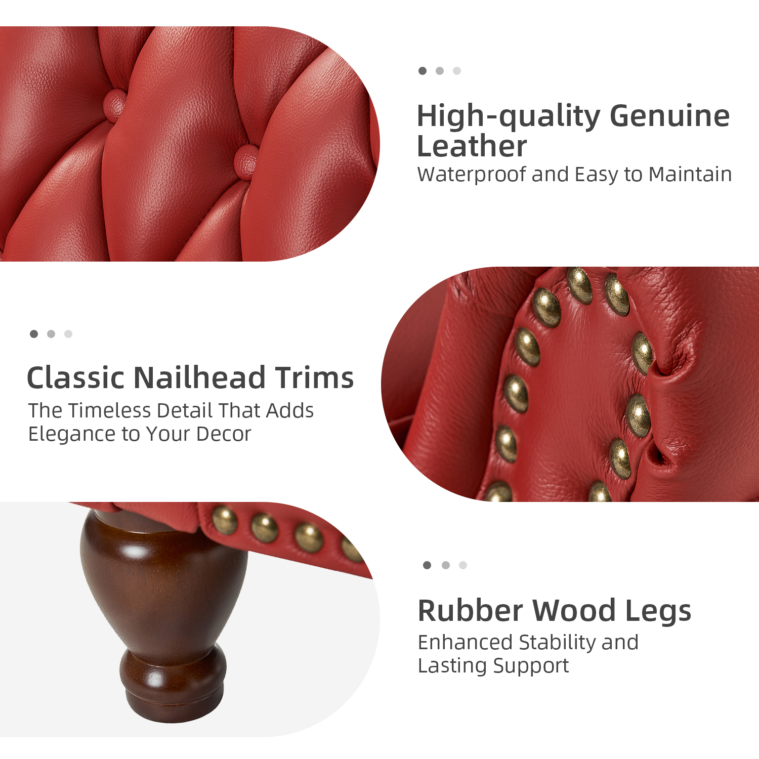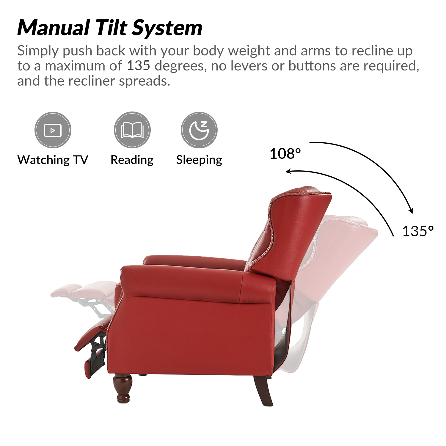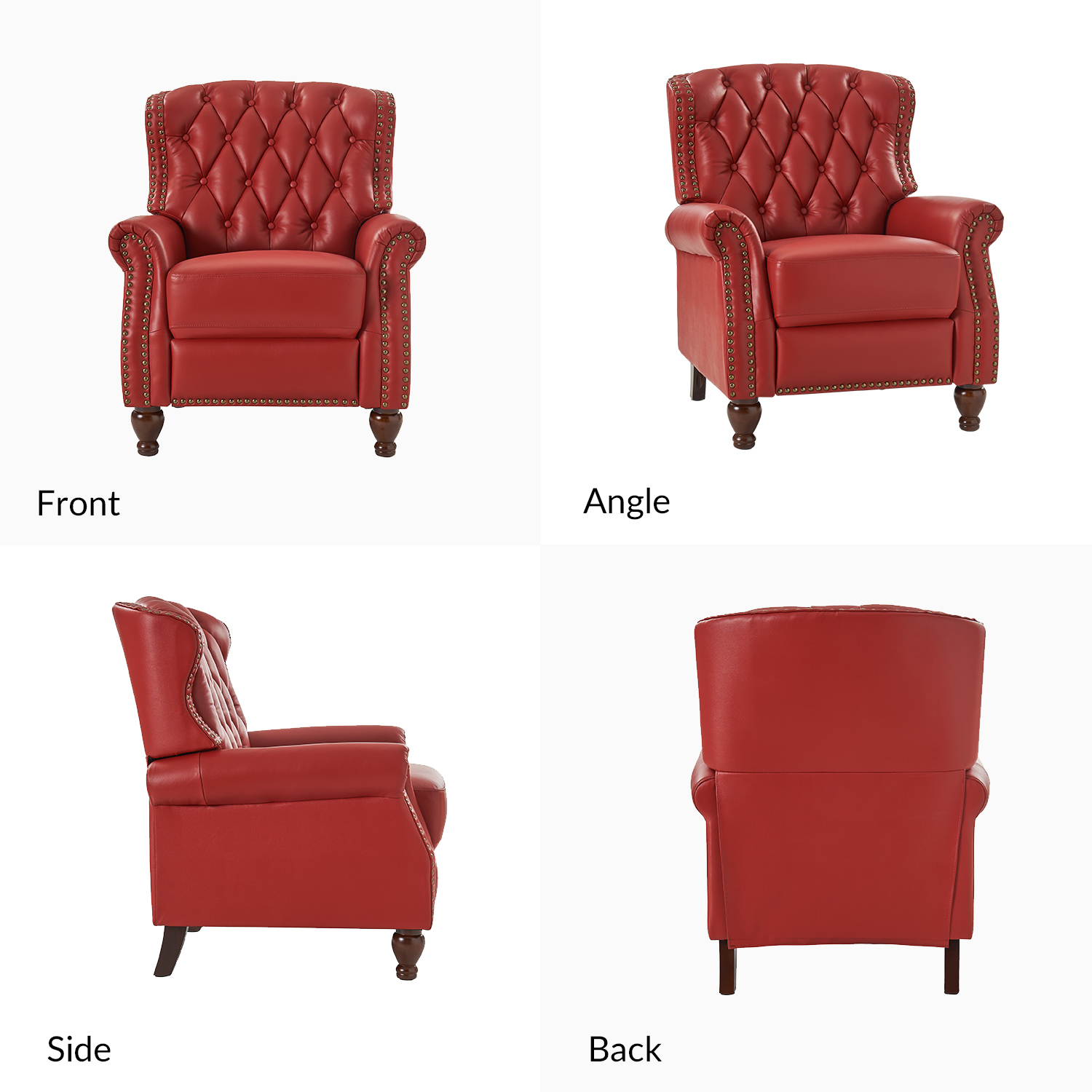 Sink into relaxation after a long day with the Abraham Red Leather Nailhead Trim Manual Recliner. This recliner offers the perfect spot to unwind, whether you’re catching your favorite shows or diving into a good book. The chic nailhead trim, button-tufted back, and rolled arms add a dash of classic style. The adjustable backrest and footrest provide ultimate comfort.