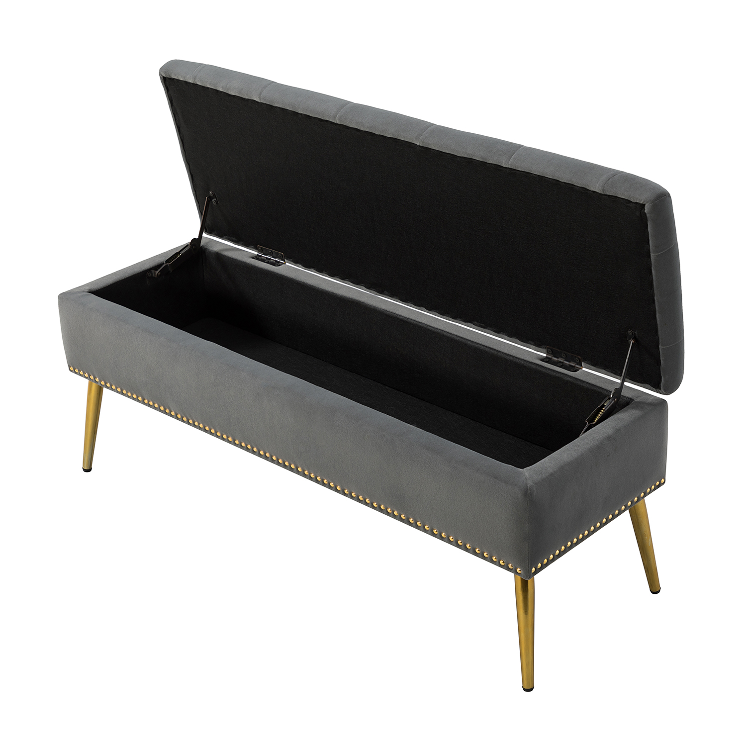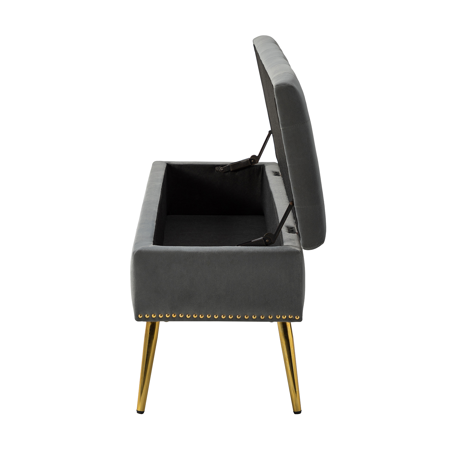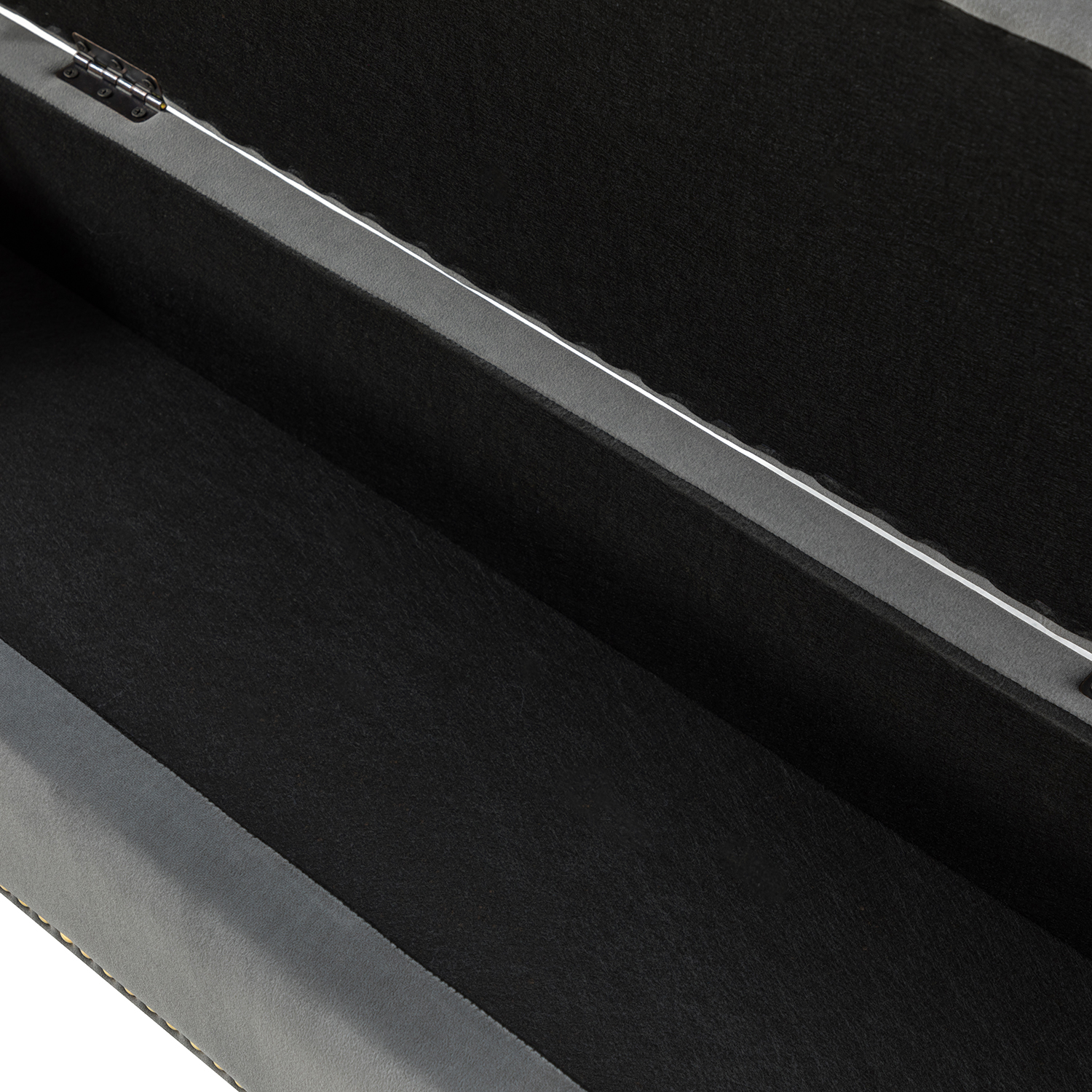 This storage bench is an ideal addition to any home, offering both stylish seating and practical storage. Its robust construction is complemented by soft polyester fabric and a comfortable foam filling, making it a versatile piece for various decor styles. The cushion features deep button tufting, while the bench’s frame is accented with nailhead trim, creating an elegant look. Completing the design are fixed, slightly splayed metal legs that enhance the bench’s sophisticated silhouette.