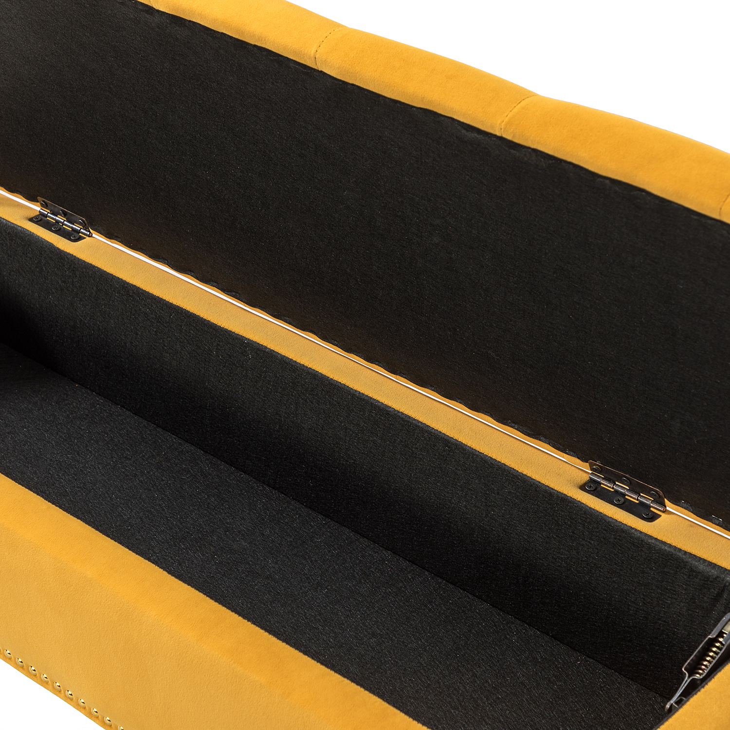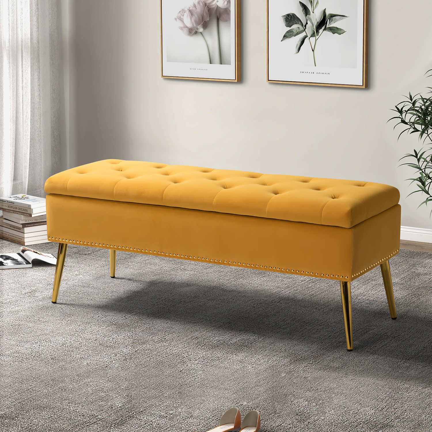 This storage bench offers both style and functionality, making it a must-have addition to any home. Its sturdy construction is upholstered in soft polyester fabric and generously padded with foam, providing exceptional comfort. The versatile design complements various decor styles. The bench features deep button tufting on the cushion and nailhead trim along the base, adding a touch of elegance. Tapered metal legs offer stable support and enhance the bench’s refined silhouette. Enjoy this storage bench for years to come.