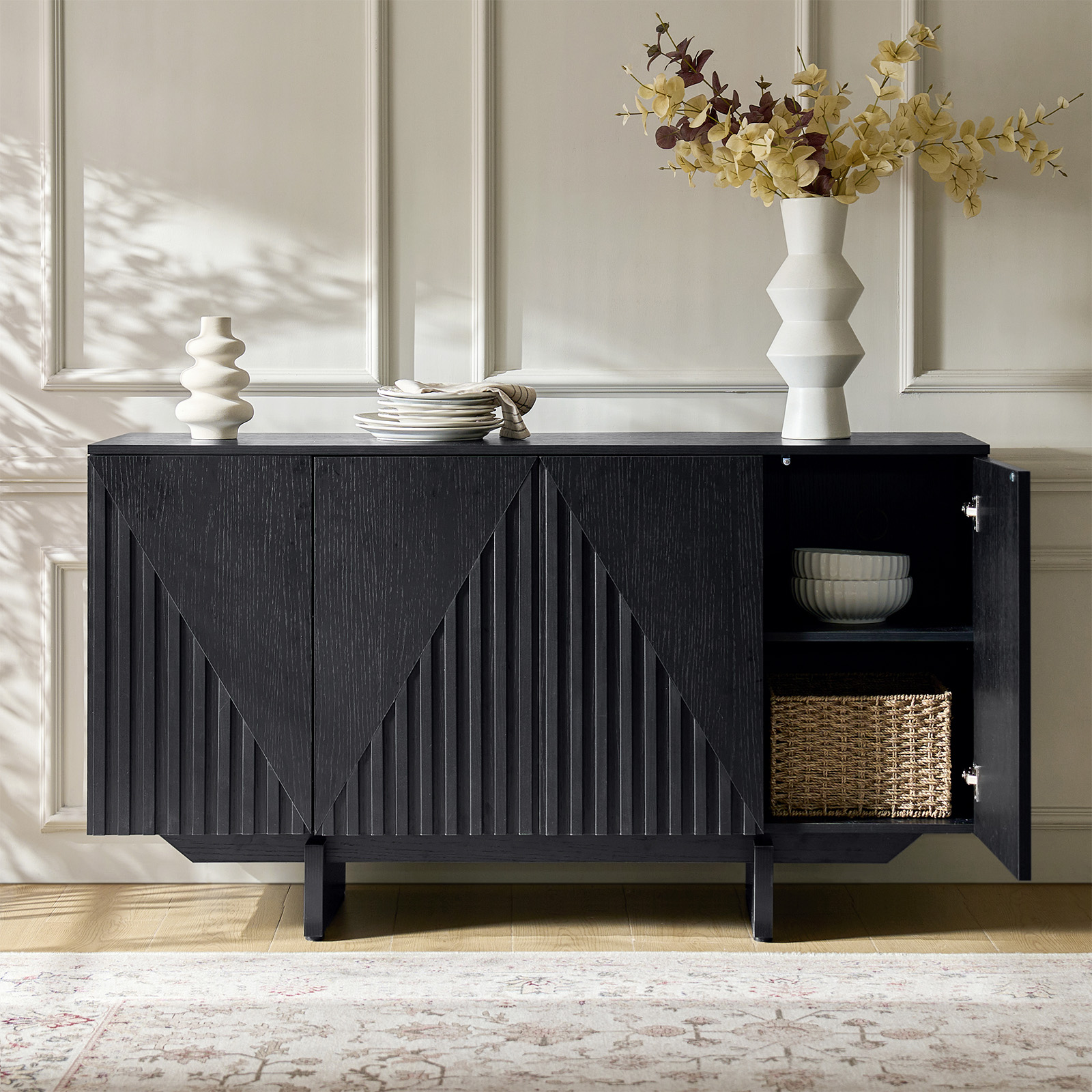 This sideboard combines a modern aesthetic with geometric lines, ideal for creating a clean and sophisticated atmosphere in any room. Enjoy the adjustable shelves to customize your storage space, and the adjustable feet that ensure stability on any floor.