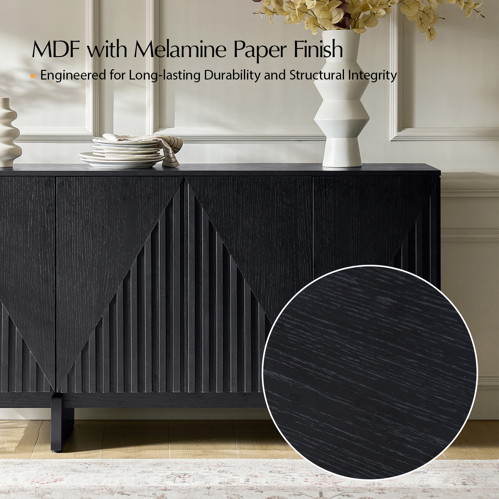 This sleek modern sideboard is designed to elevate your home organization. Crafted with quality materials and finished with a melamine veneer, it features a deep embossed texture for a contemporary look. Its versatile design includes adjustable shelves and feet for customized storage and stability, plus pre-drilled cable holes for easy electronics management. It’s the perfect blend of style and practicality!