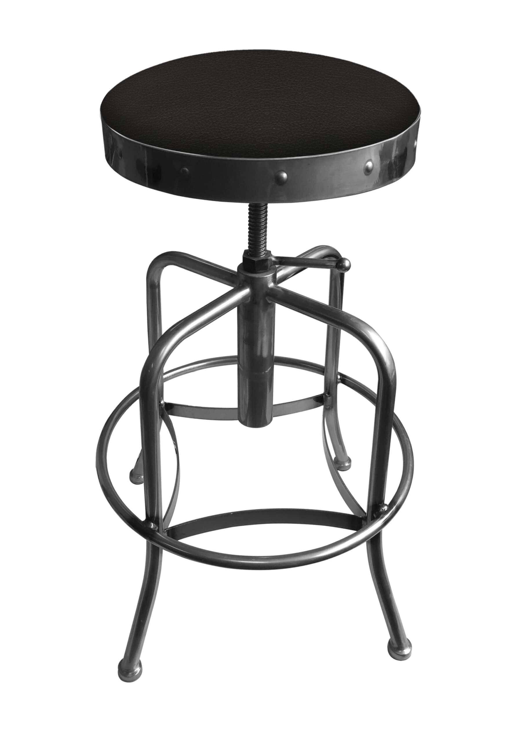 This adjustable, industrial-style swivel stool evokes the classic look of early 1900’s drafting stools. Built to last, it combines a steel frame with a comfortable, studded seat, offering both style and durability for your bar or counter area. The screw base allows for easy height adjustment, ensuring a perfect fit for various counter and bar heights.