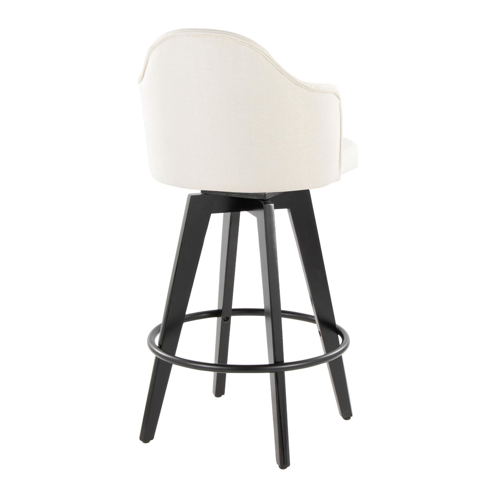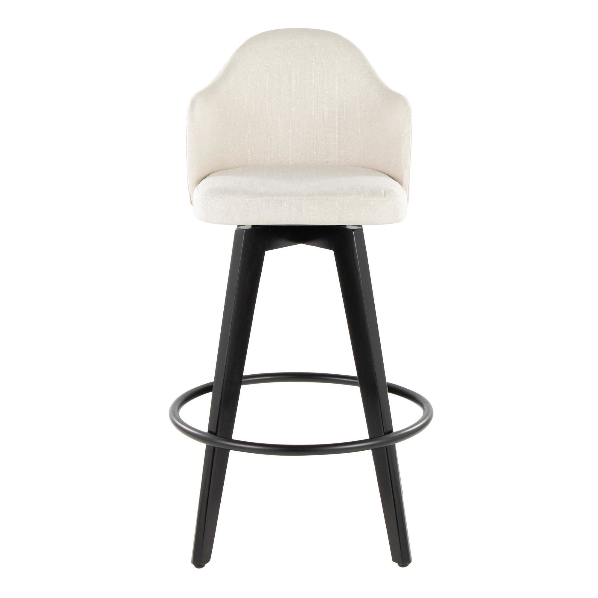 The key features include a 360-degree swivel, allowing for ease of movement, and a sturdy bamboo frame ensuring durability. The stylish fabric upholstery adds a touch of elegance, while the black metal footrest provides added comfort. Enjoy the blend of aesthetics and functionality with these counter stools.