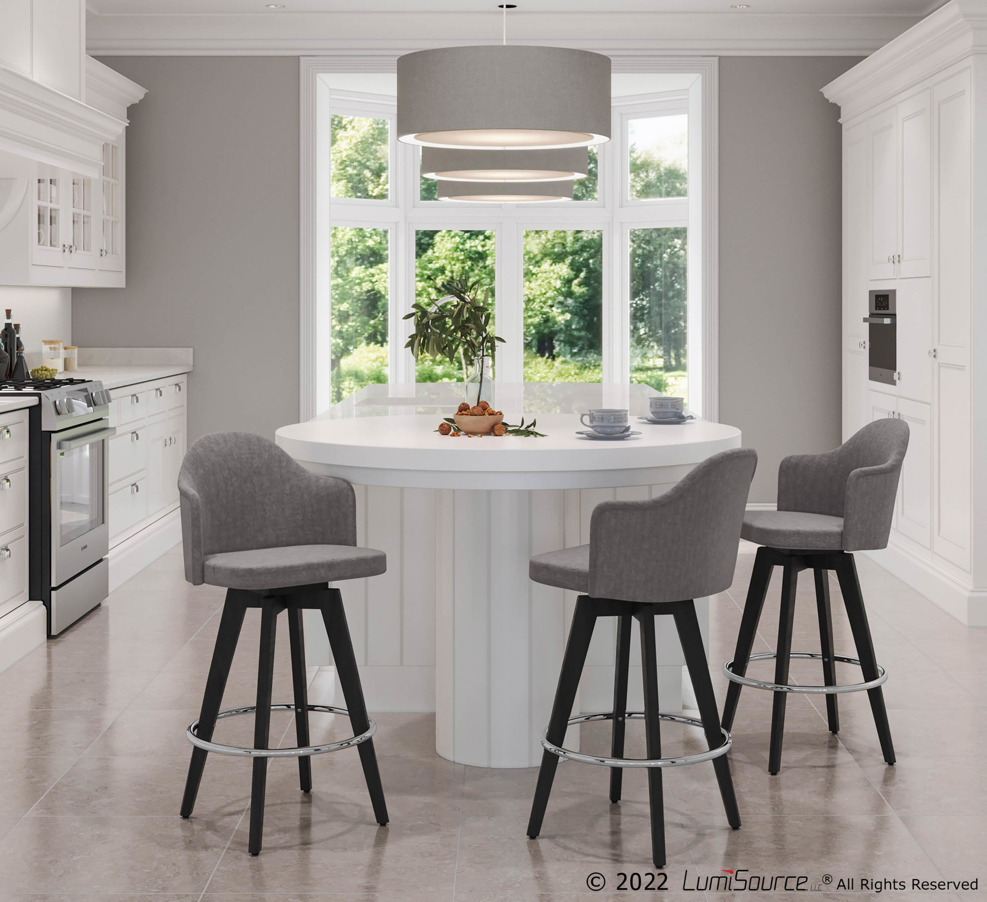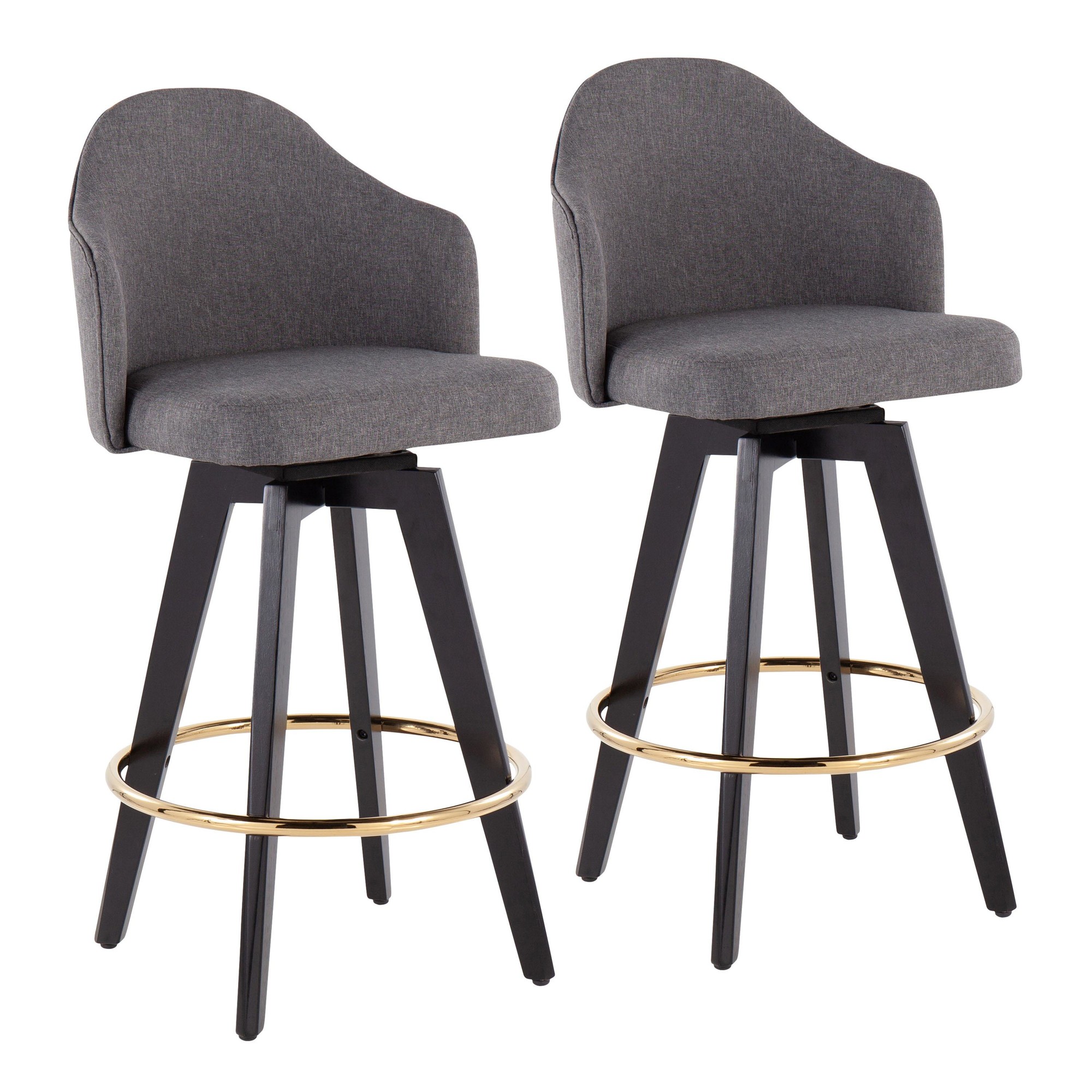 These Ahoy Contemporary Grey Fabric 26-Inch Counter Stools are the perfect addition to your space, blending sturdy construction with eye-catching design. The sleek grey fabric upholstery offers a comfortable seating experience, beautifully complemented by stylish wood legs. Enjoy the convenience of a 360-degree swivel and the added comfort of a round chrome footrest. Sold in pairs, these counter stools will elevate your bar or counter area.