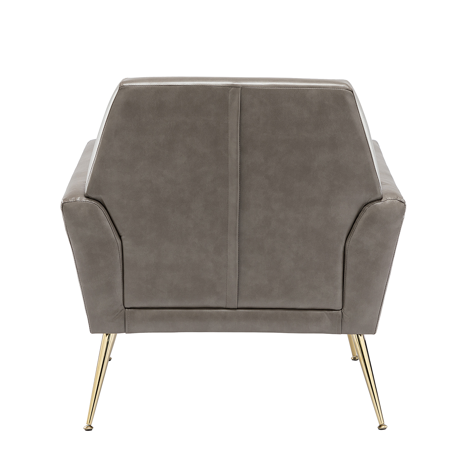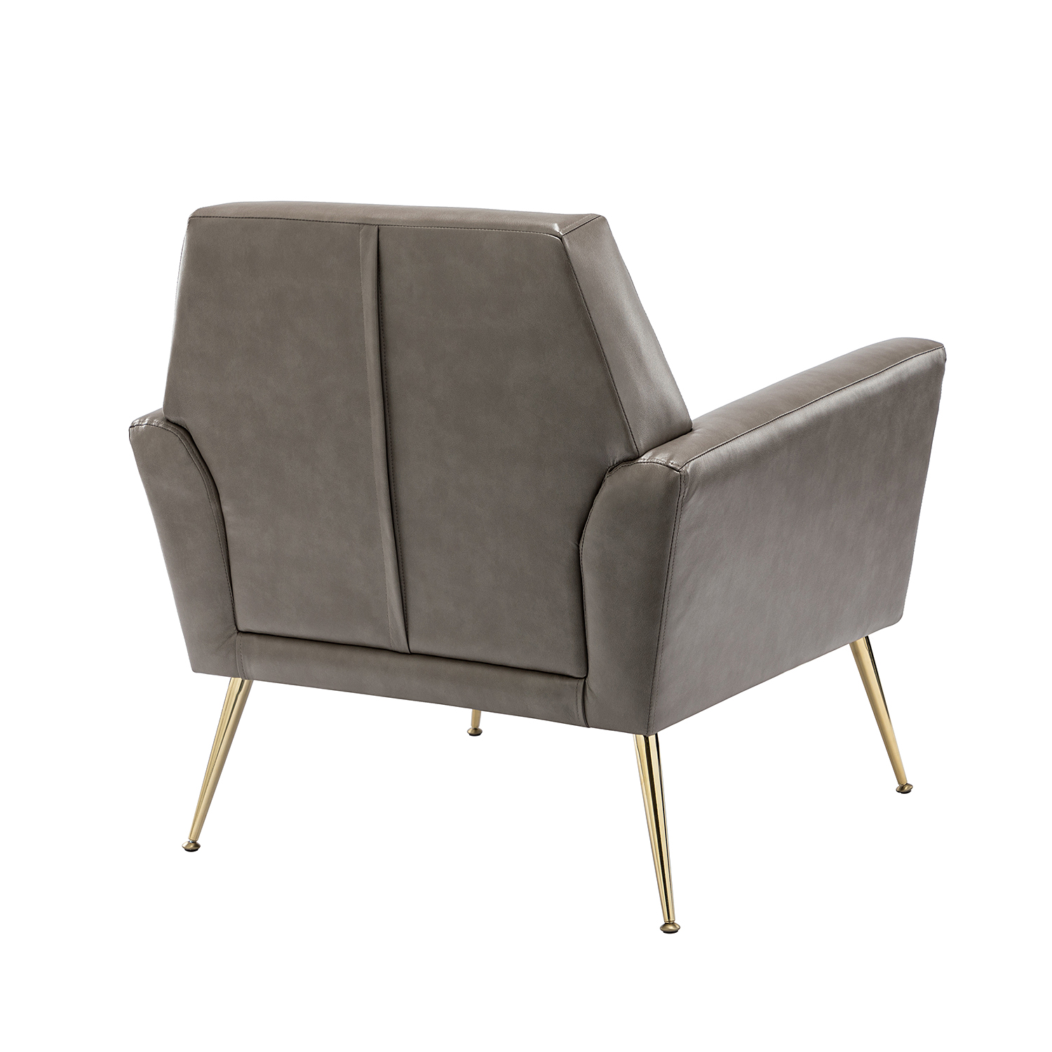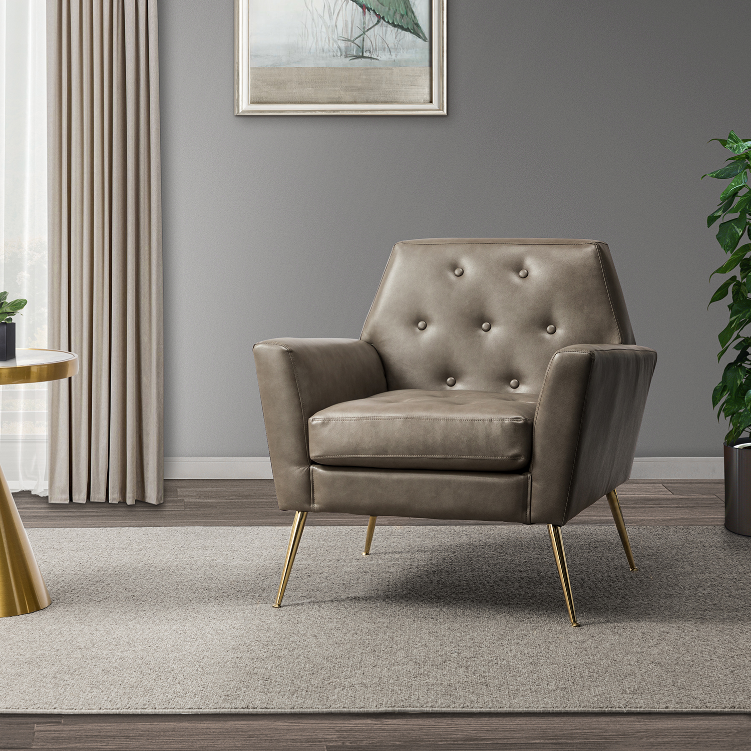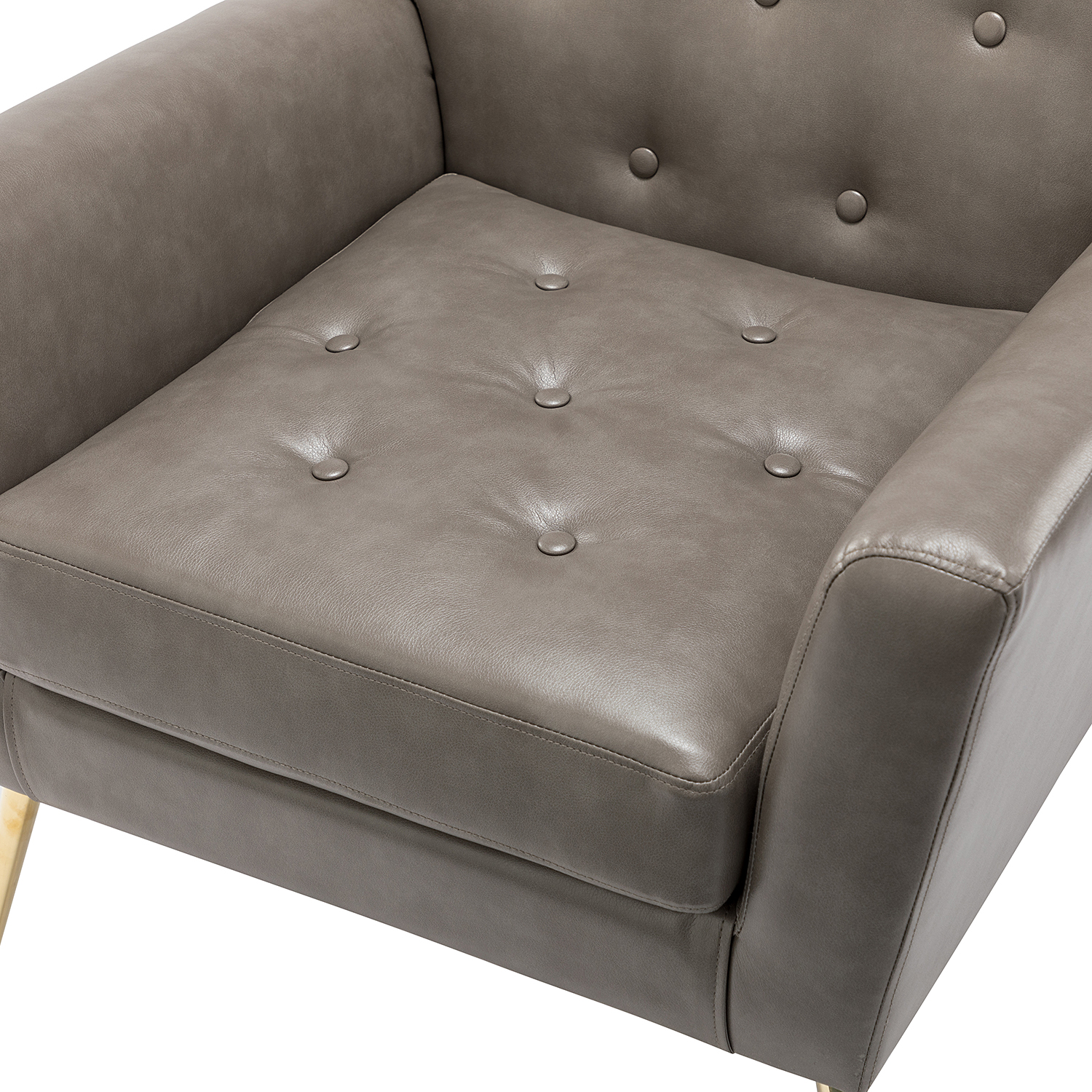 This eye-catching modern armchair is designed to capture your heart. Its unique tufted cushion design creates a comfortable seating experience, like floating on clouds. This chic accent chair blends glamorous elements, including an approachable profile, slender golden metal legs, and button-tufted cushions, bringing a refreshing new look to your home decor. A sturdy wooden frame, wrapped in skin-touch-friendly vegan leather, ensures incredible durability and ultimate comfort. Showcasing an attractive aesthetic, this strong structure effortlessly incorporates modern and classic styles, making it suitable for the living room, office, or bedroom.